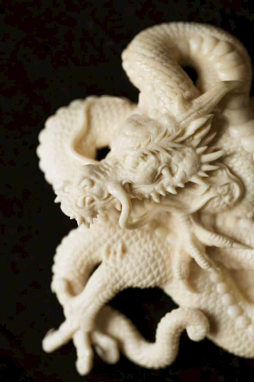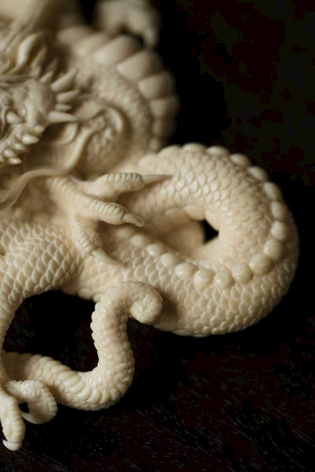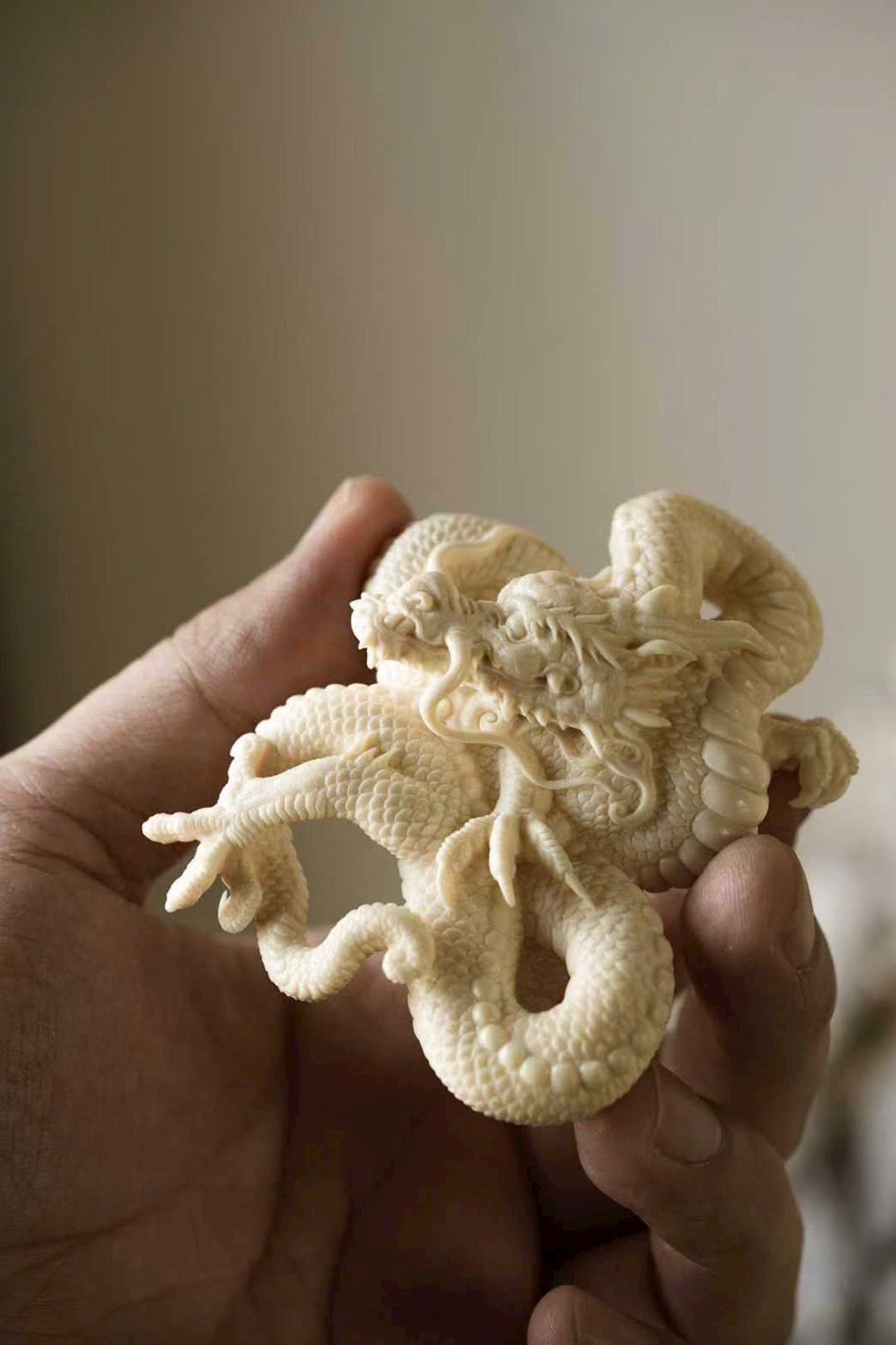 Tác phẩm hoàn toàn thủ công, mỗi đường đao đều mang hồn cốt của đất trời — dùng dao như bút, khắc họa khí vận hồng hoang. Mặt chính chạm hình thương long phá sóng, mắt rực như xé mây, râu bay như dải lụa trong gió; đuôi quét biển, vảy ngọc lấp lánh, uy nghi oai hùng.