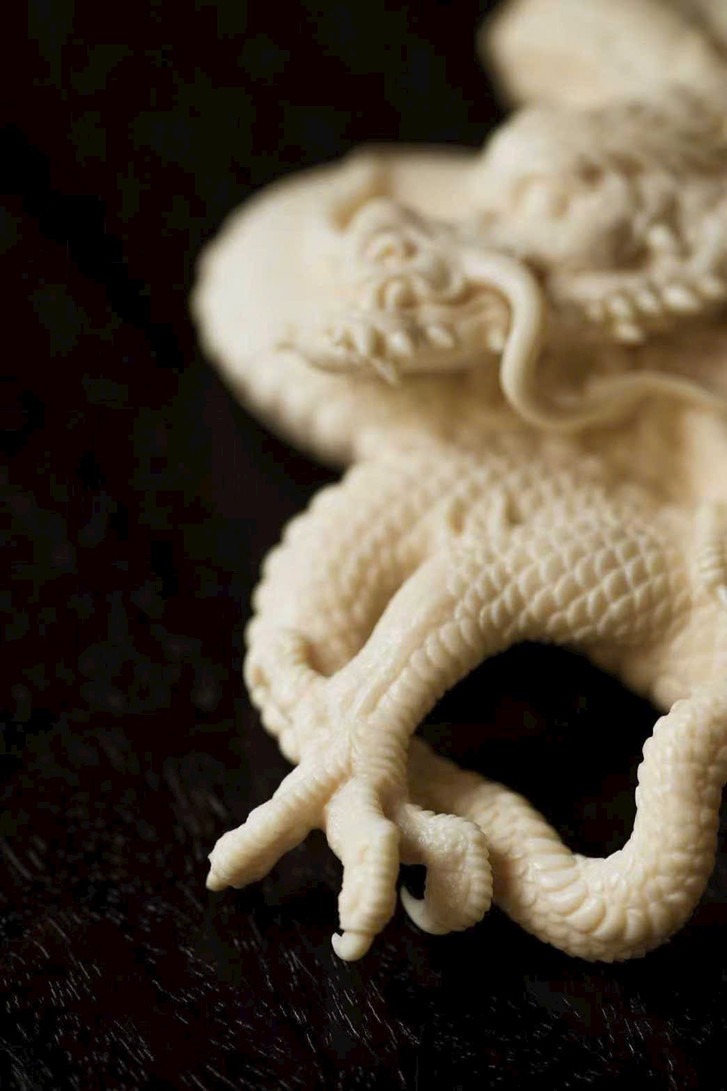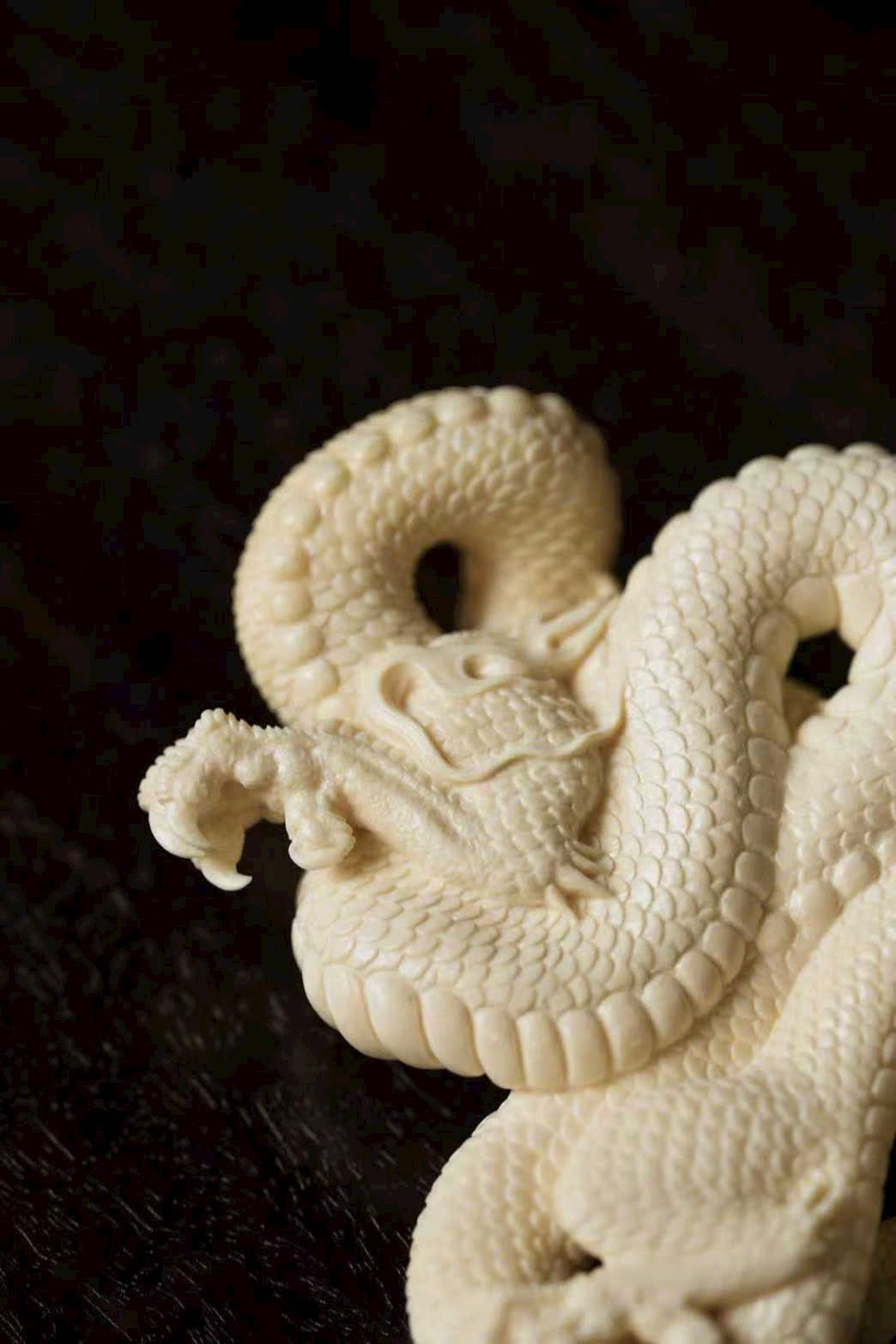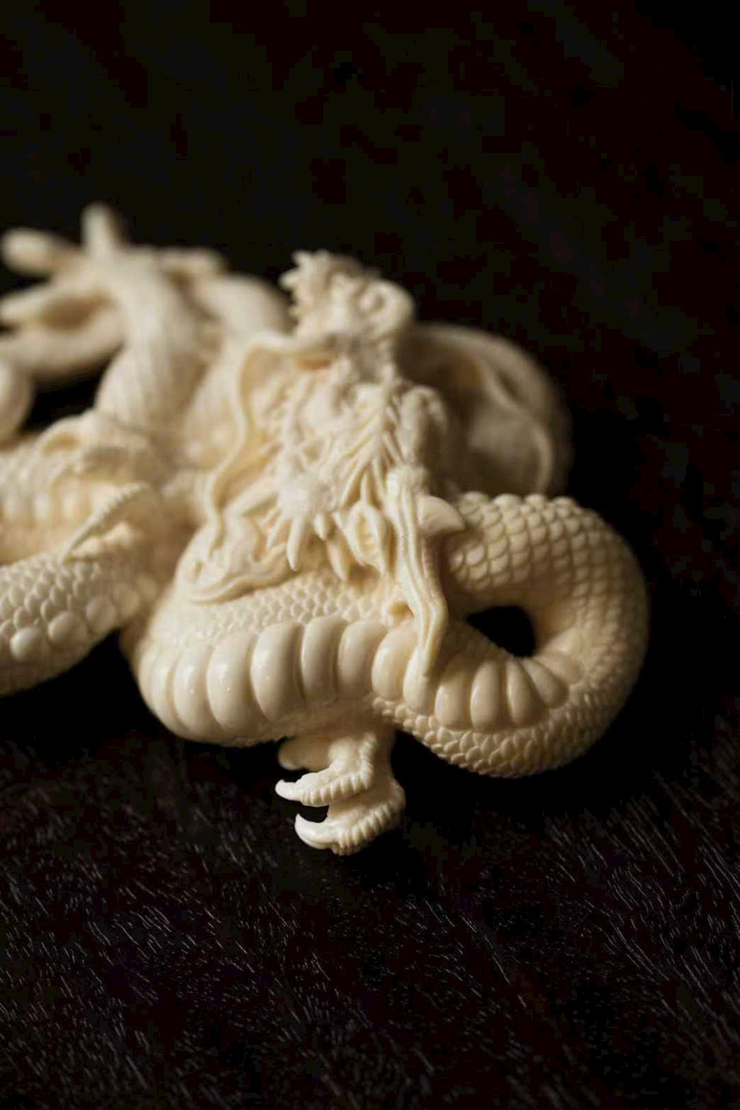 Tác phẩm hoàn toàn thủ công, mỗi đường đao đều mang hồn cốt của đất trời — dùng dao như bút, khắc họa khí vận hồng hoang. Mặt chính chạm hình thương long phá sóng, mắt rực như xé mây, râu bay như dải lụa trong gió; đuôi quét biển, vảy ngọc lấp lánh, uy nghi oai hùng.