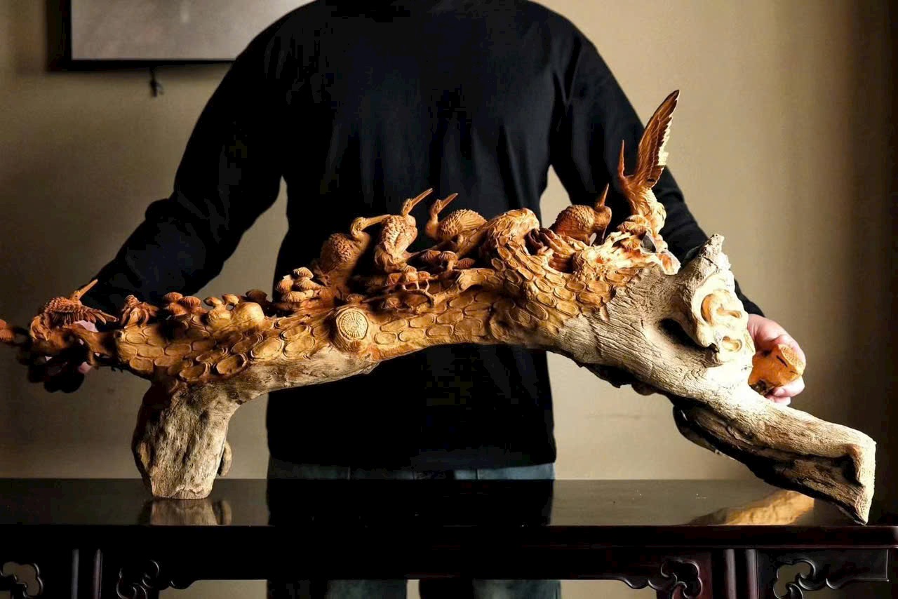 Tác phẩm được chế tác hoàn toàn thủ công từ gỗ hoàng dương nguyên khối, phần rễ ôm đá, thuộc dòng gỗ quý hiếm.
