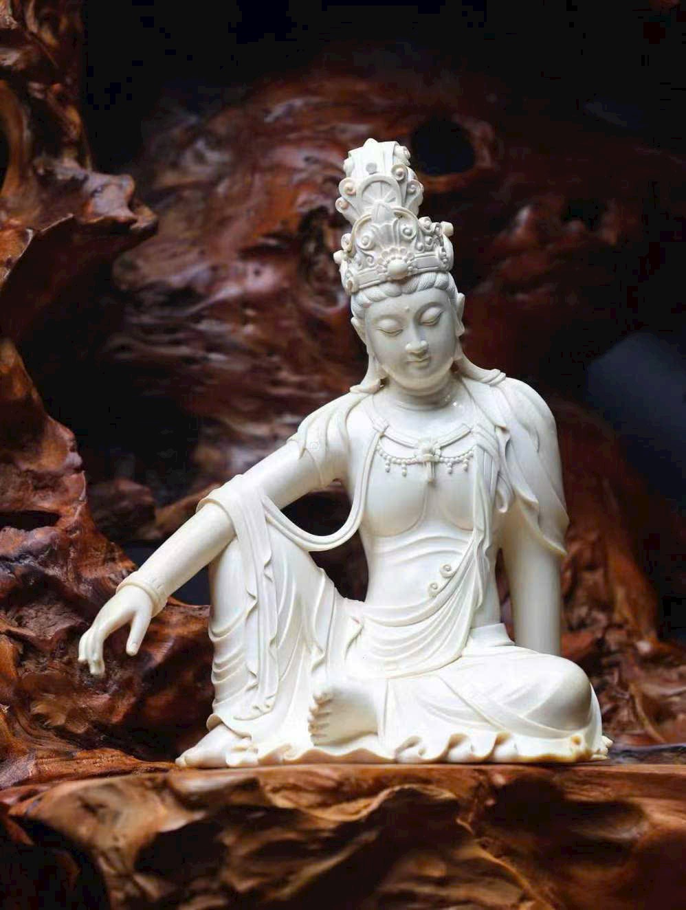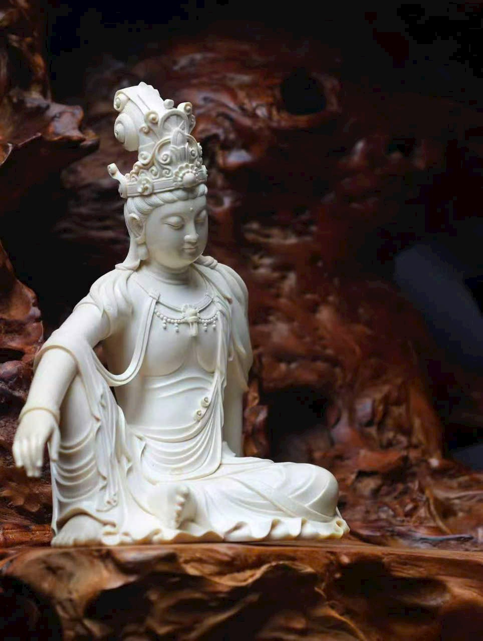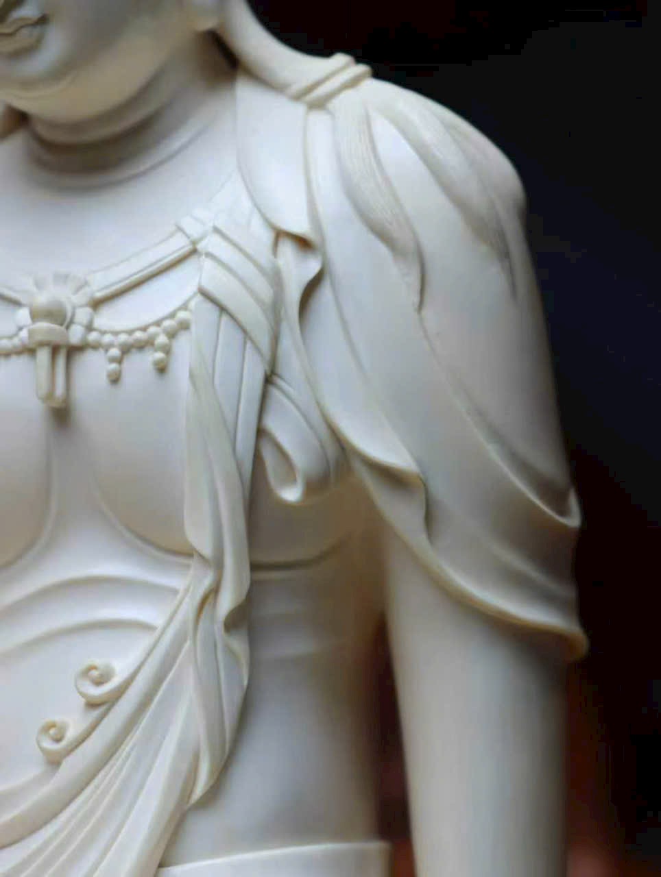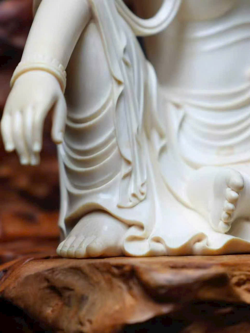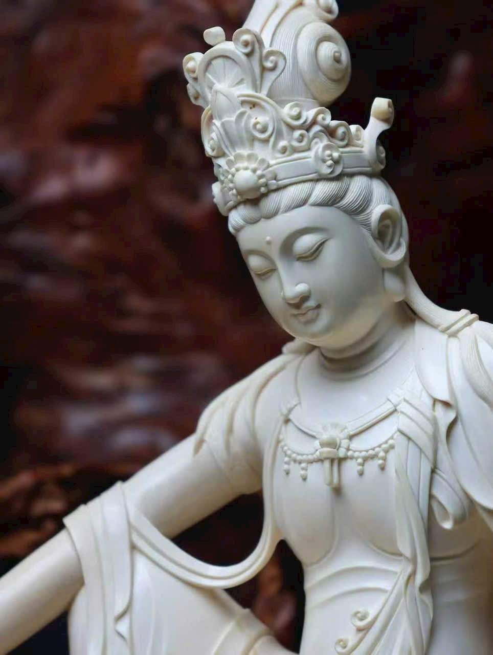 Quan Âm mi mắt khẽ hạ, ánh nhìn trầm lắng, pháp tướng hiền từ an hòa.