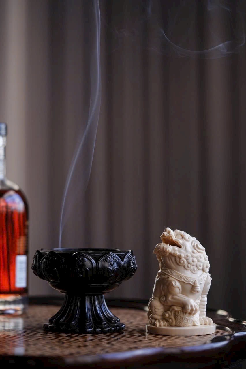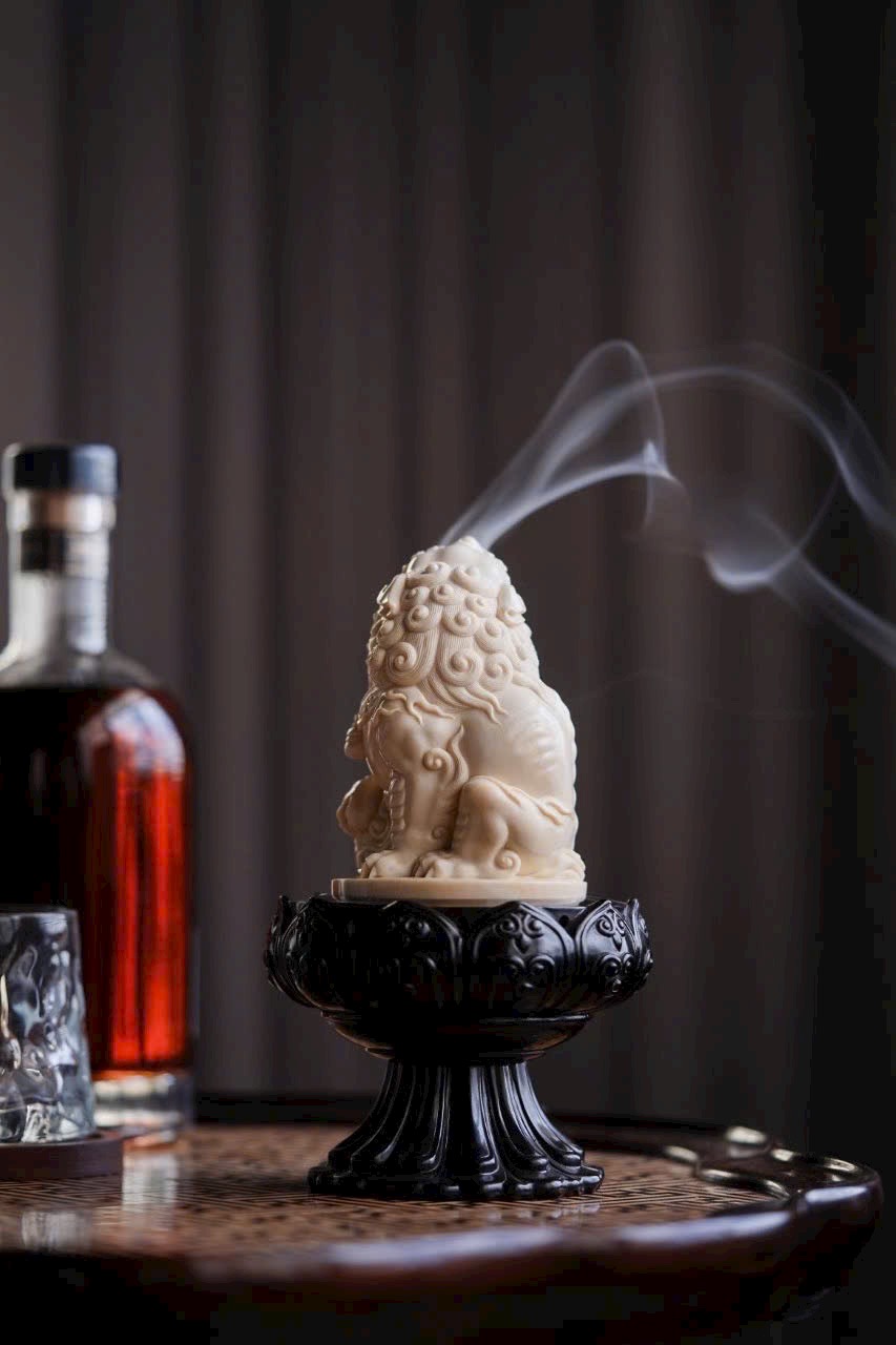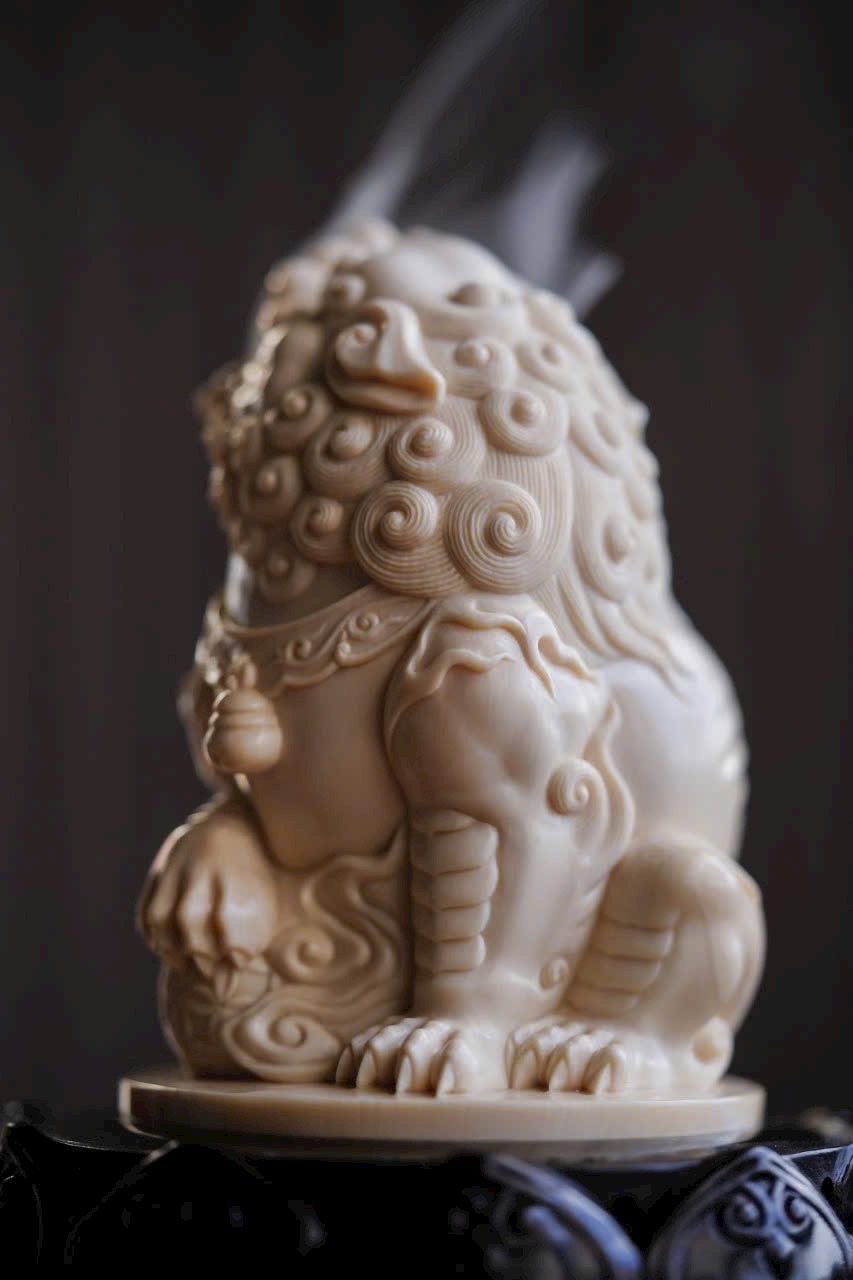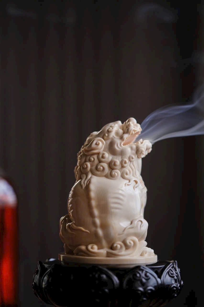 Tượng sư tử cát tường ngẩng đầu hướng trời, bờm xếp lớp như sóng, miệng phun khói nhẹ hóa thành mây lành. Trưng bày trên bàn, khi hương khói lan tỏa như thấy linh thú chiêu phúc, thiền ý sinh khởi.