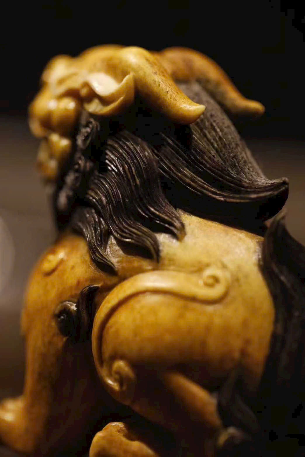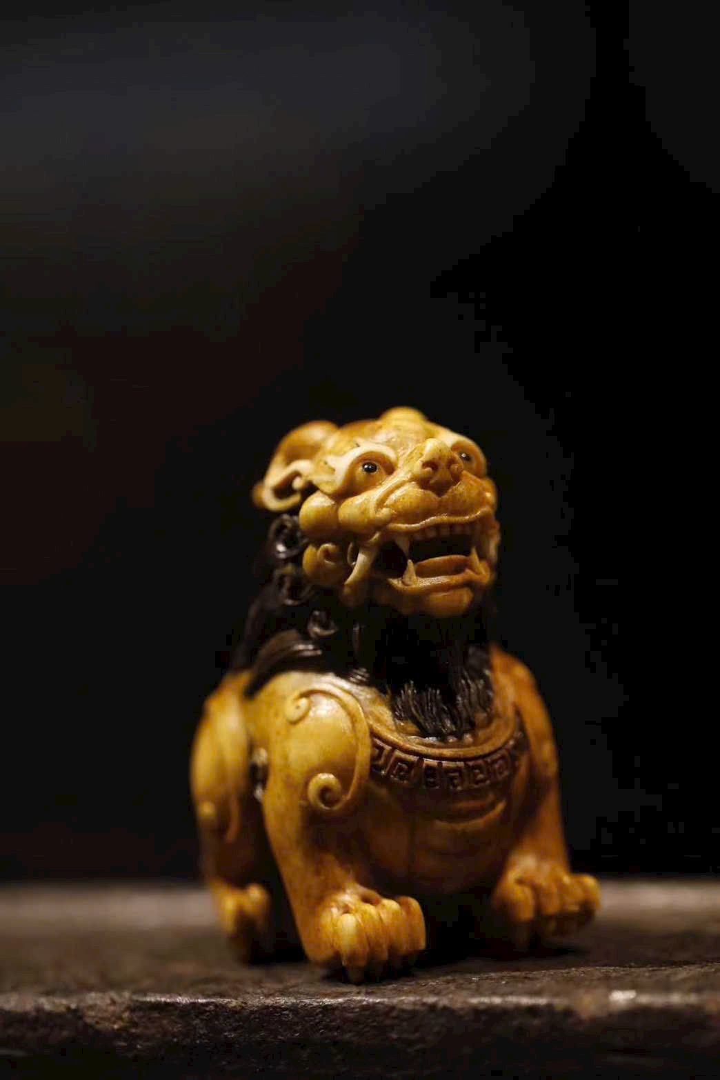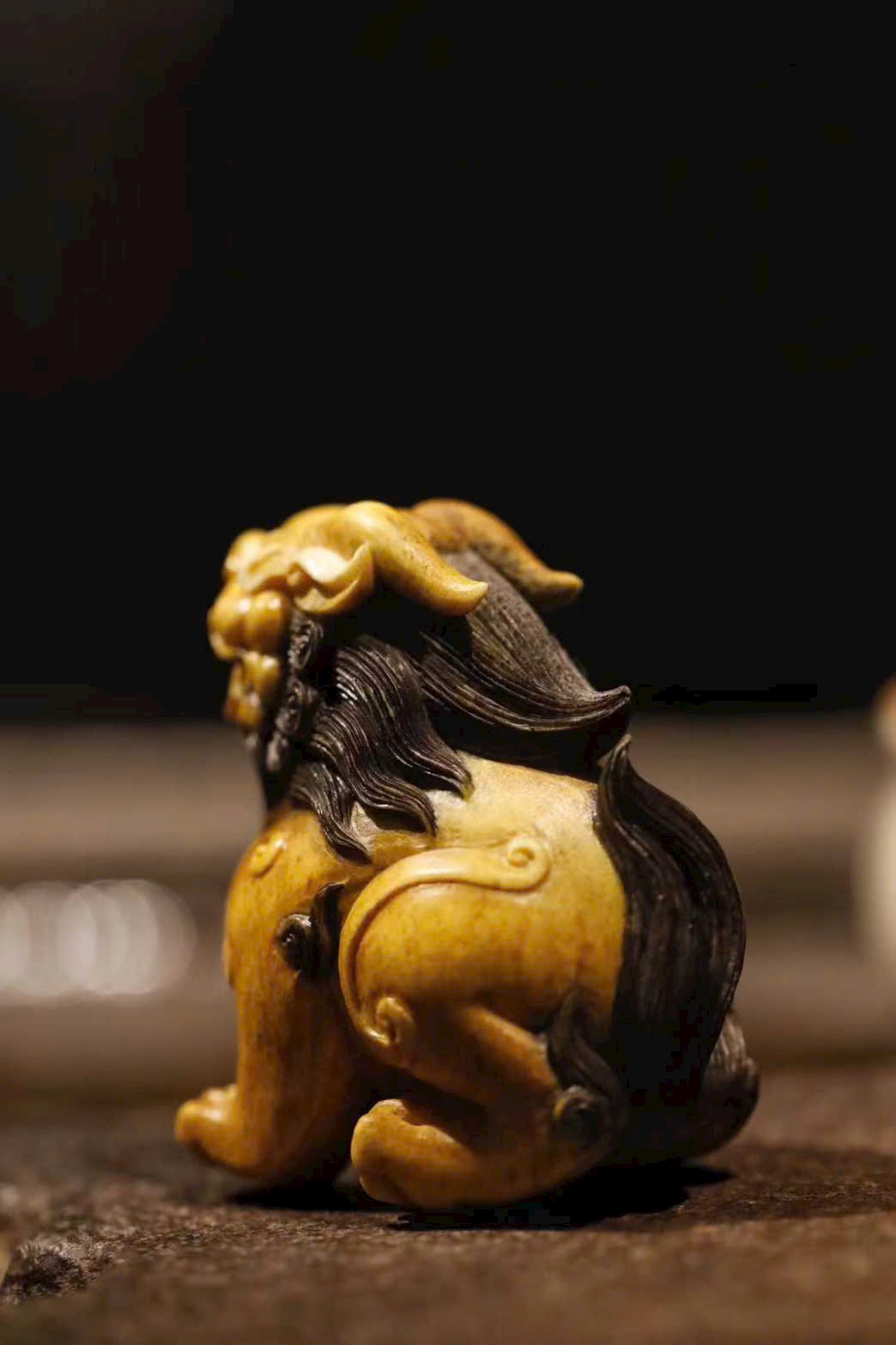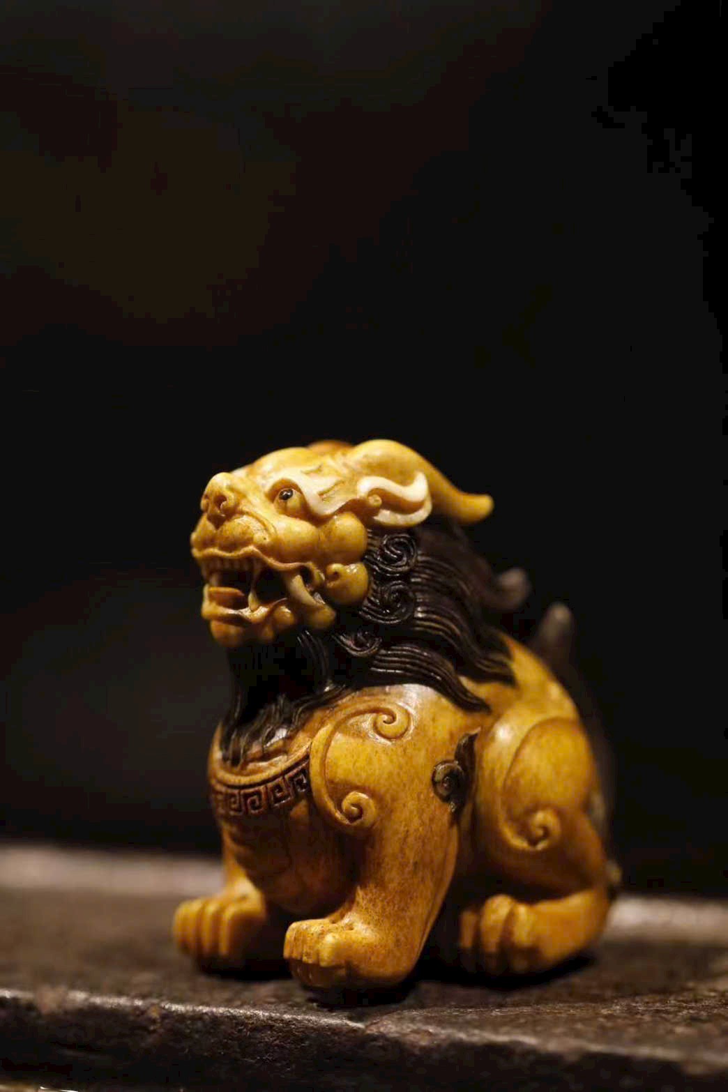 Chạm từ sừng hươu, sắc ấm, vân mịn đẹp. Linh thú đầu oai, thân uy nghi nhưng vẫn đầy thiện ý – phù hợp sưu tầm, trưng bày hoặc cầm tay thưởng ngoạn.