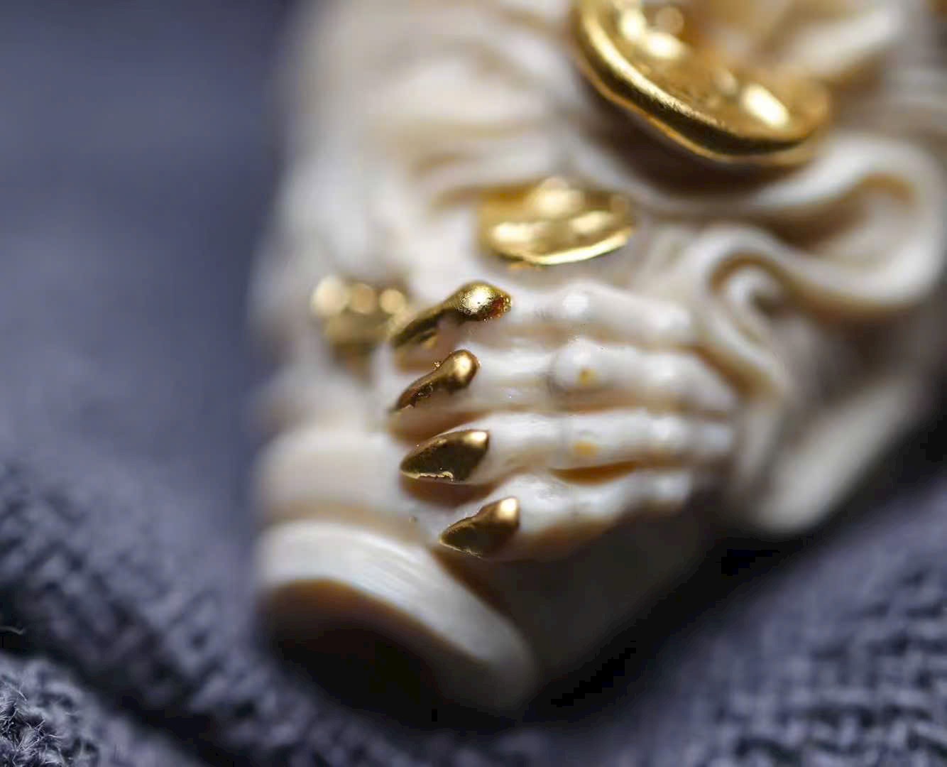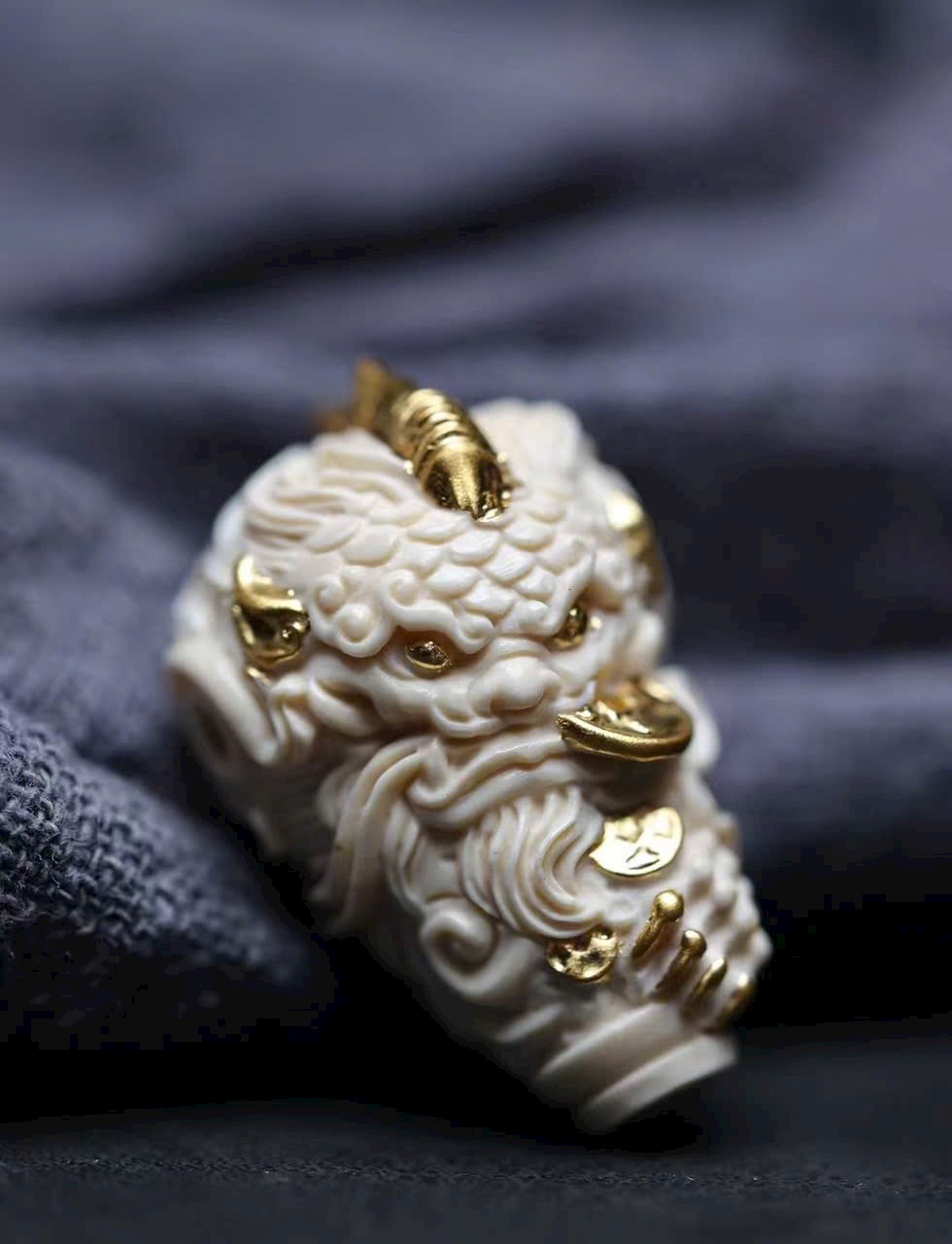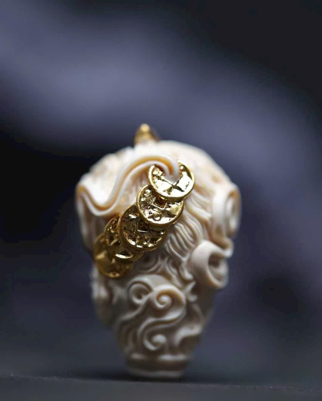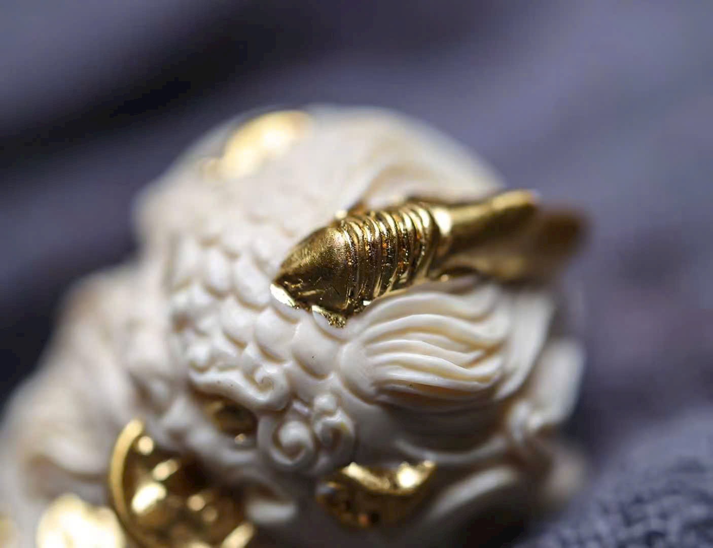 Tuyển chọn n.gà voi ma mút làm chất liệu, ấm nhuận mịn màng, thấm đượm dấu ấn thời gian. Chạm khắc hình thú cát tường ngậm vàng, điểm xuyết vàng trang sức càng thêm rực rỡ. Vừa là món văn chơi tao nhã, vừa là linh vận phương Đông được thời gian tôi luyện.