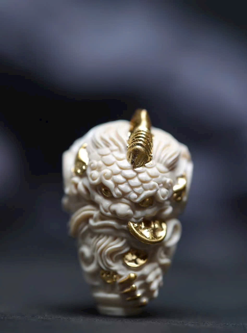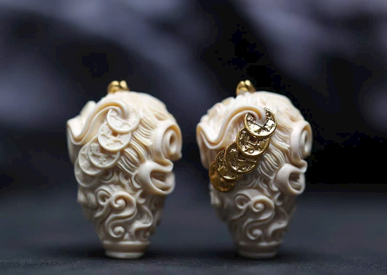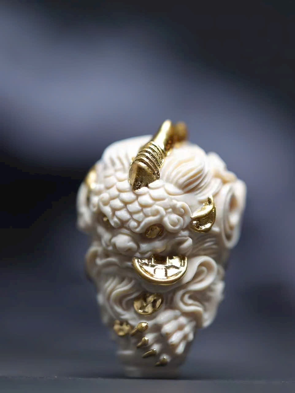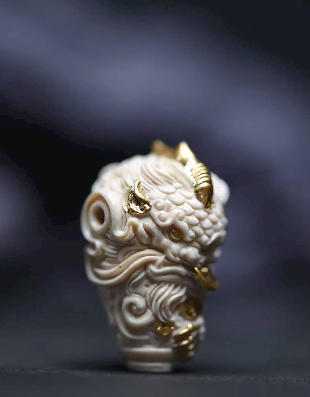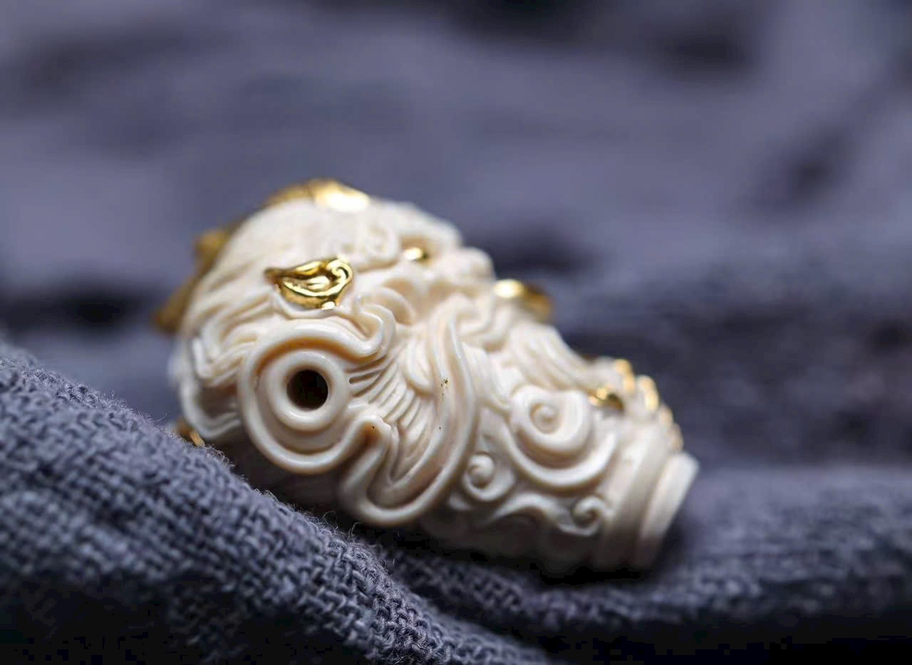 Tuyển chọn n.gà voi ma mút làm chất liệu, ấm nhuận mịn màng, thấm đượm dấu ấn thời gian. Chạm khắc hình thú cát tường ngậm vàng, điểm xuyết vàng trang sức càng thêm rực rỡ. Vừa là món văn chơi tao nhã, vừa là linh vận phương Đông được thời gian tôi luyện.