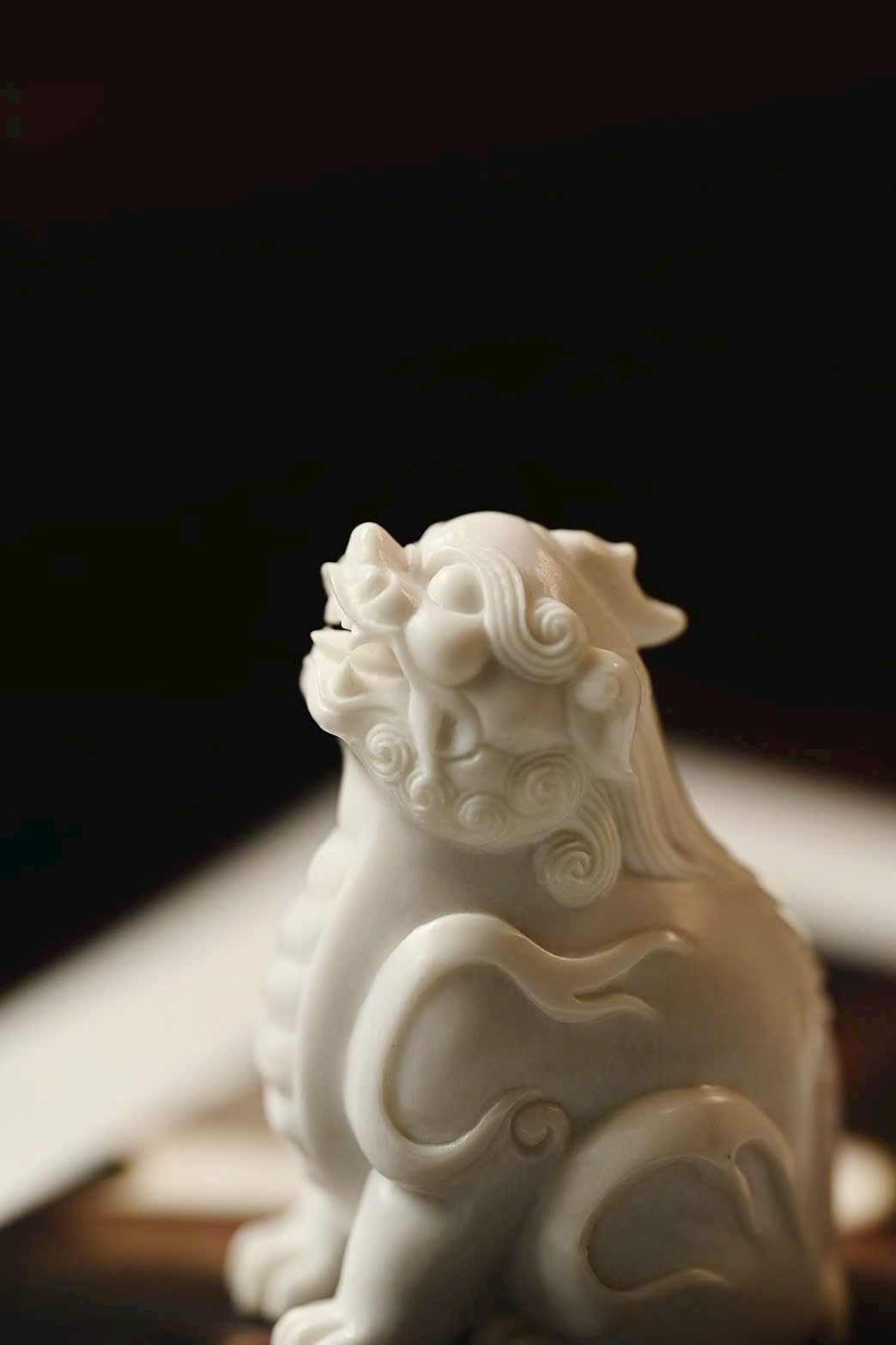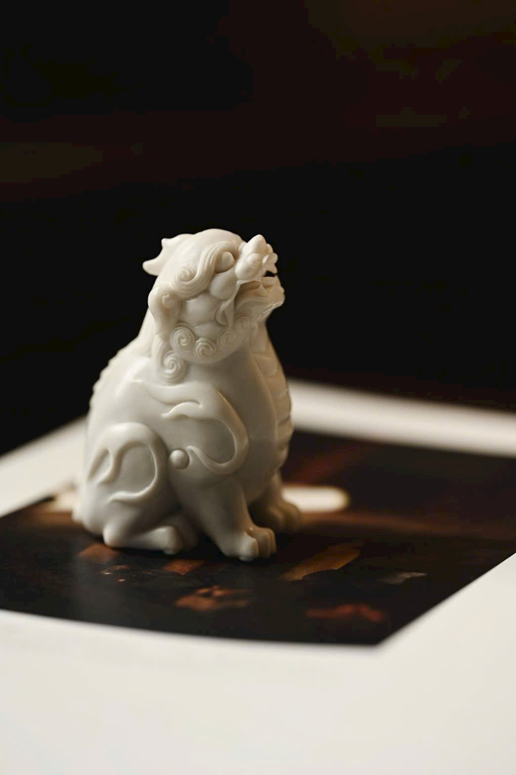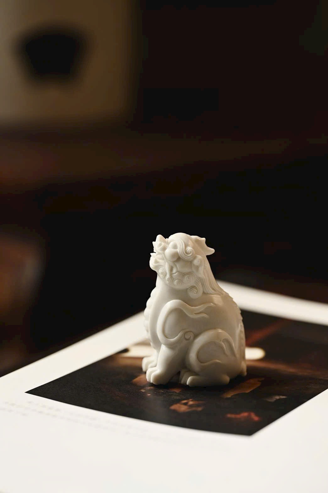 Thụy thú ngẩng cao đầu, ưỡn ngực, dáng ngồi chồm vững chãi. Đôi mắt tròn trợn, miệng rộng hơi hé, thân phủ vân lửa, khí thế mạnh mẽ đầy uy lực. Đặt trên bàn trà làm trà sủng/trang trí trà tịch, nhỏ gọn tinh xảo, rất đáng yêu.