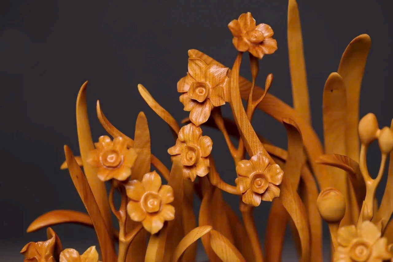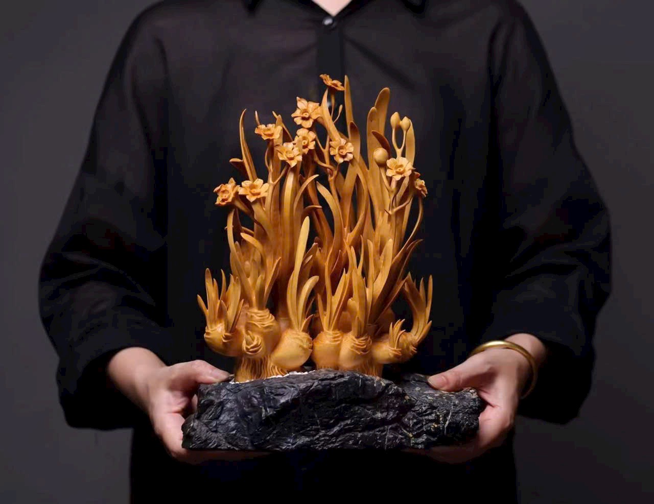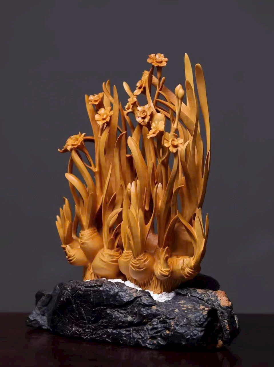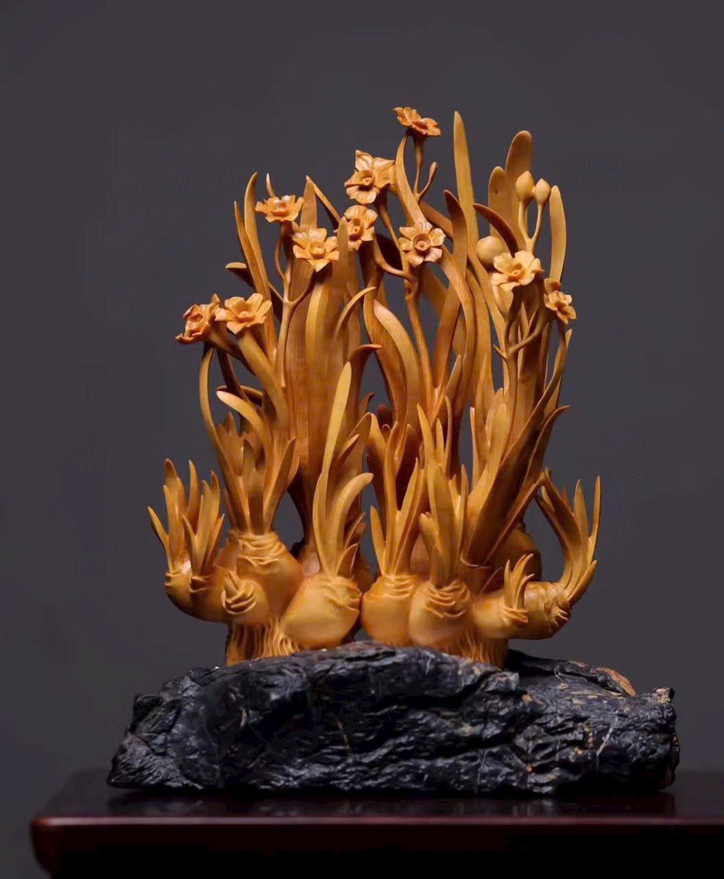 Tác phẩm tái hiện vẻ duyên dáng sống động của hoa thủy tiên, lá uốn lượn mềm mại như đung đưa trong gió, tràn đầy sức sống. Củ hoa tròn mượt, chắc khỏe, vươn lên trên tảng đá gồ ghề, vừa mộc mạc vừa tinh tế, như bản ca thiên nhiên không lời.