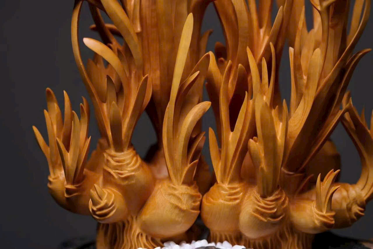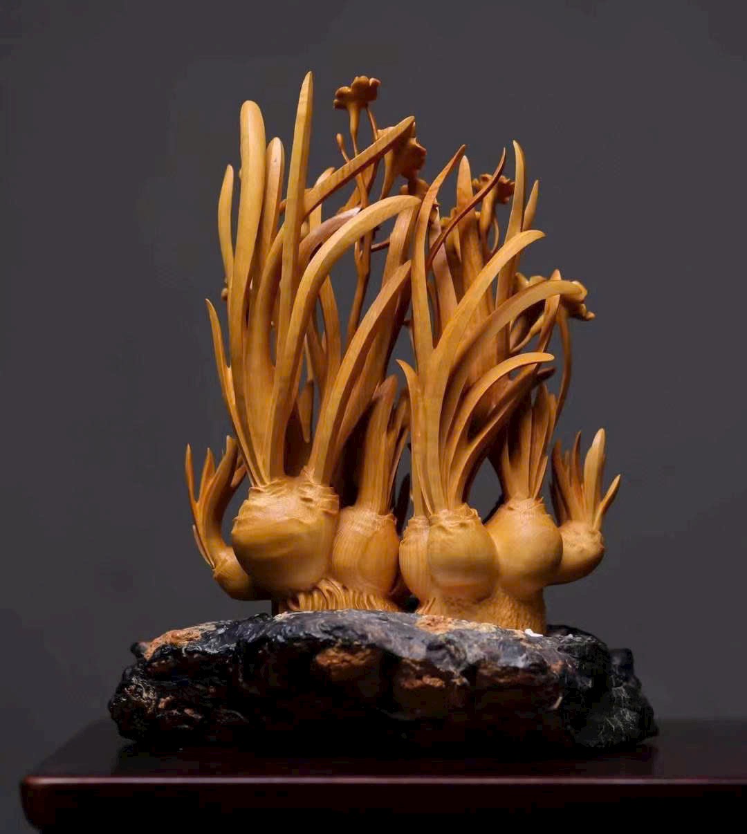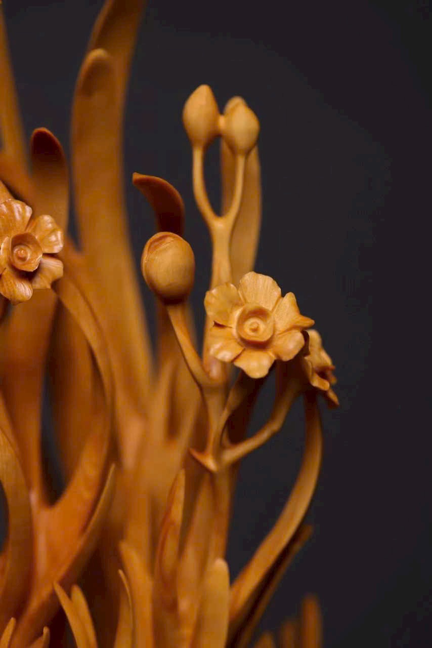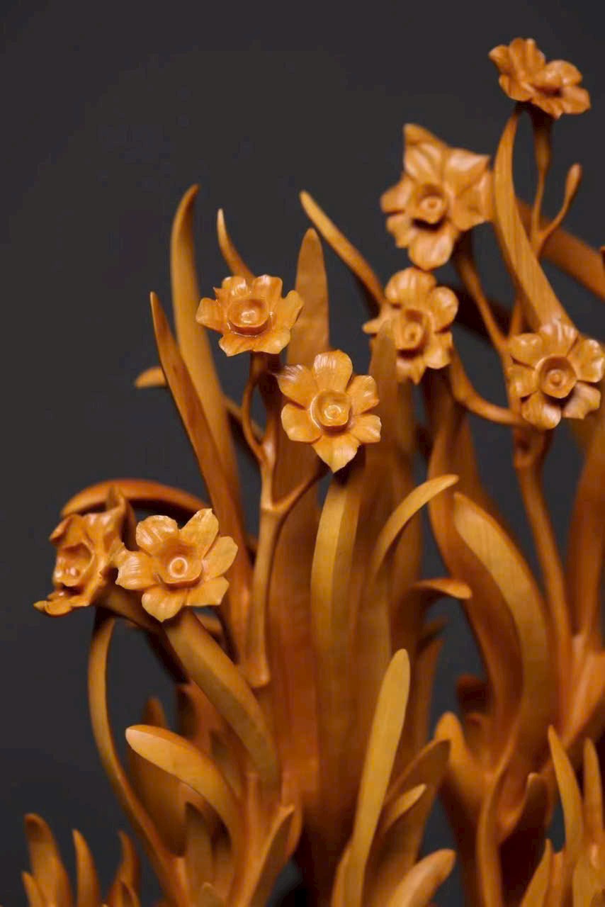 Tác phẩm tái hiện vẻ duyên dáng sống động của hoa thủy tiên, lá uốn lượn mềm mại như đung đưa trong gió, tràn đầy sức sống. Củ hoa tròn mượt, chắc khỏe, vươn lên trên tảng đá gồ ghề, vừa mộc mạc vừa tinh tế, như bản ca thiên nhiên không lời.