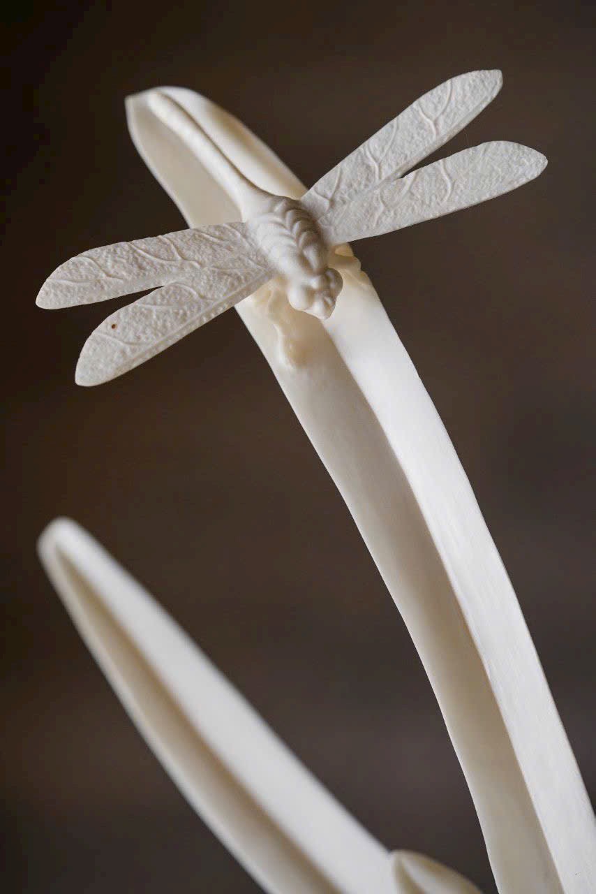 Khéo léo chạm khắc hoa thủy tiên tỏa hương thanh nhã, chuồn chuồn đậu trên nhụy, cánh mỏng trong suốt như còn sống, tựa có cơn gió nhẹ thoảng qua. Đặt nơi án thư làm vật thanh ngoạn, trong khoảng vuông tấc liền toát lên phong vị thanh tao thoát tục.