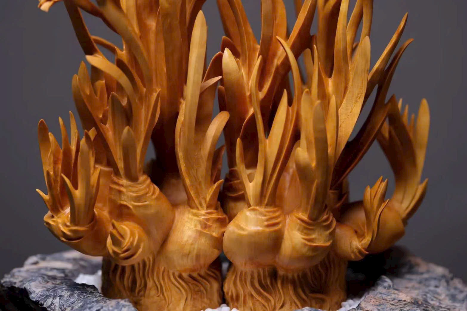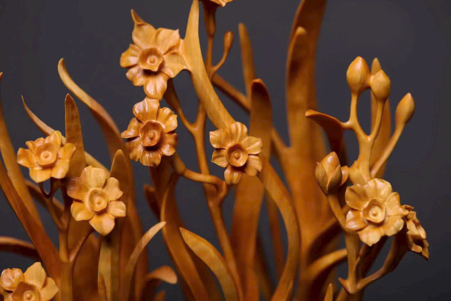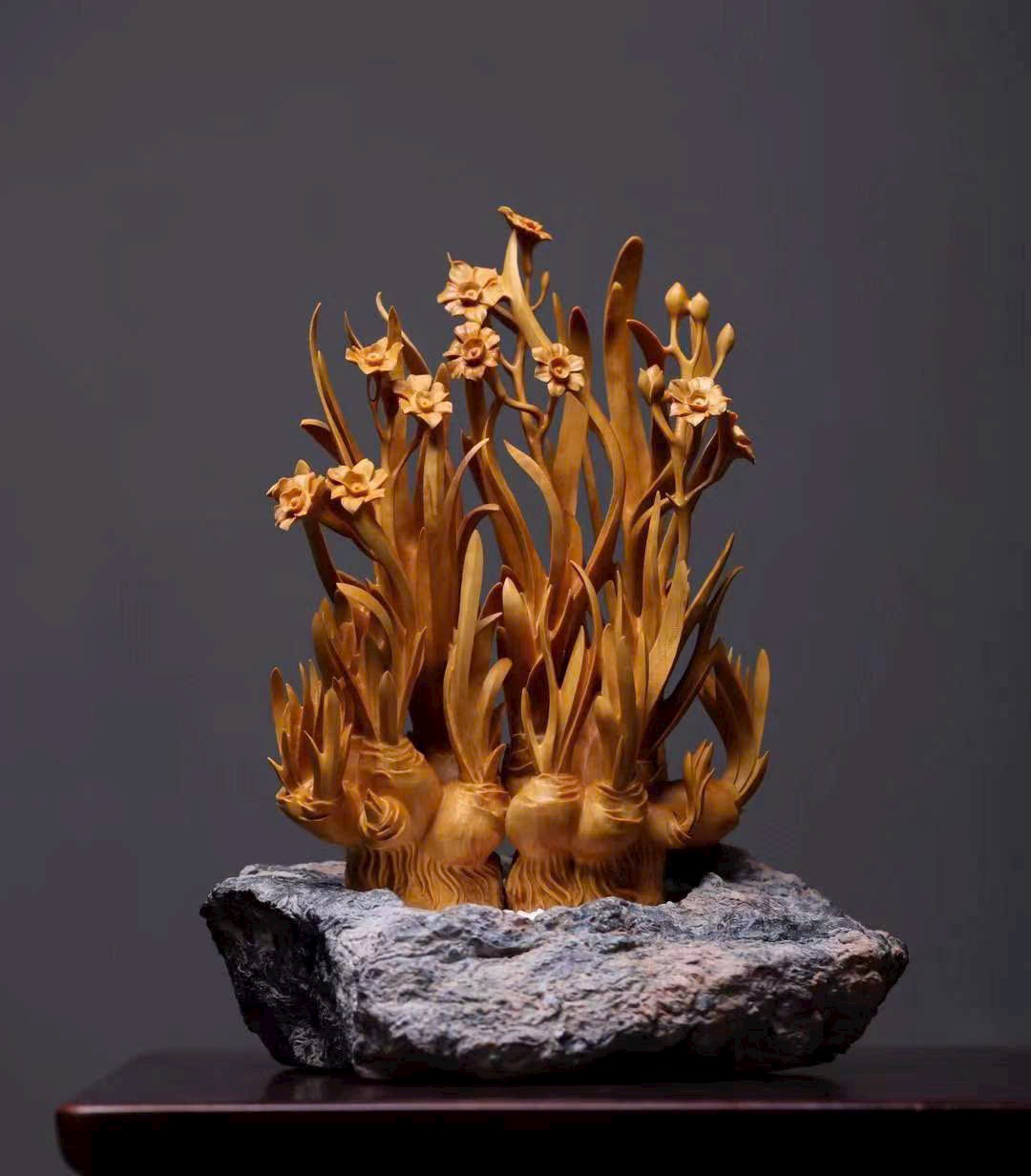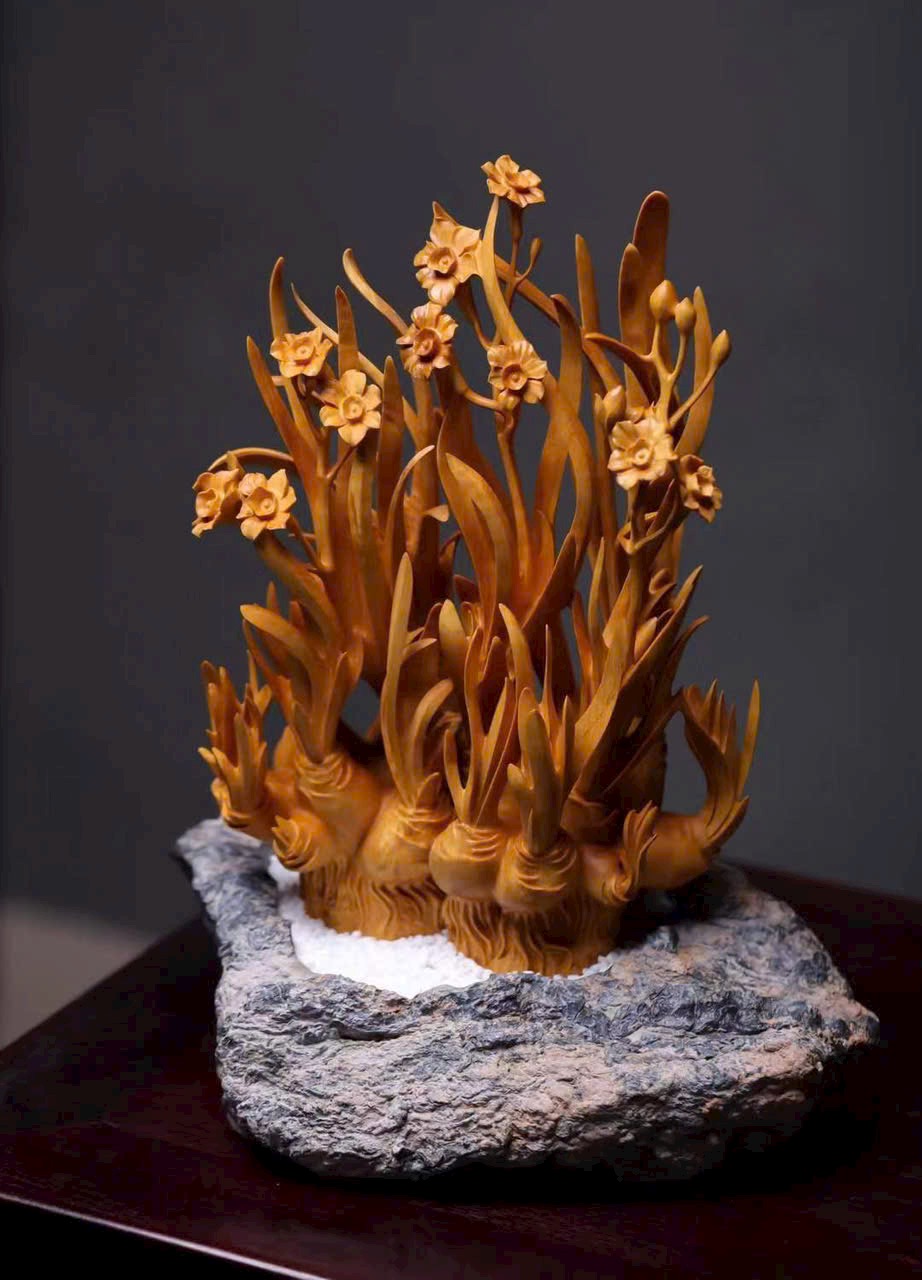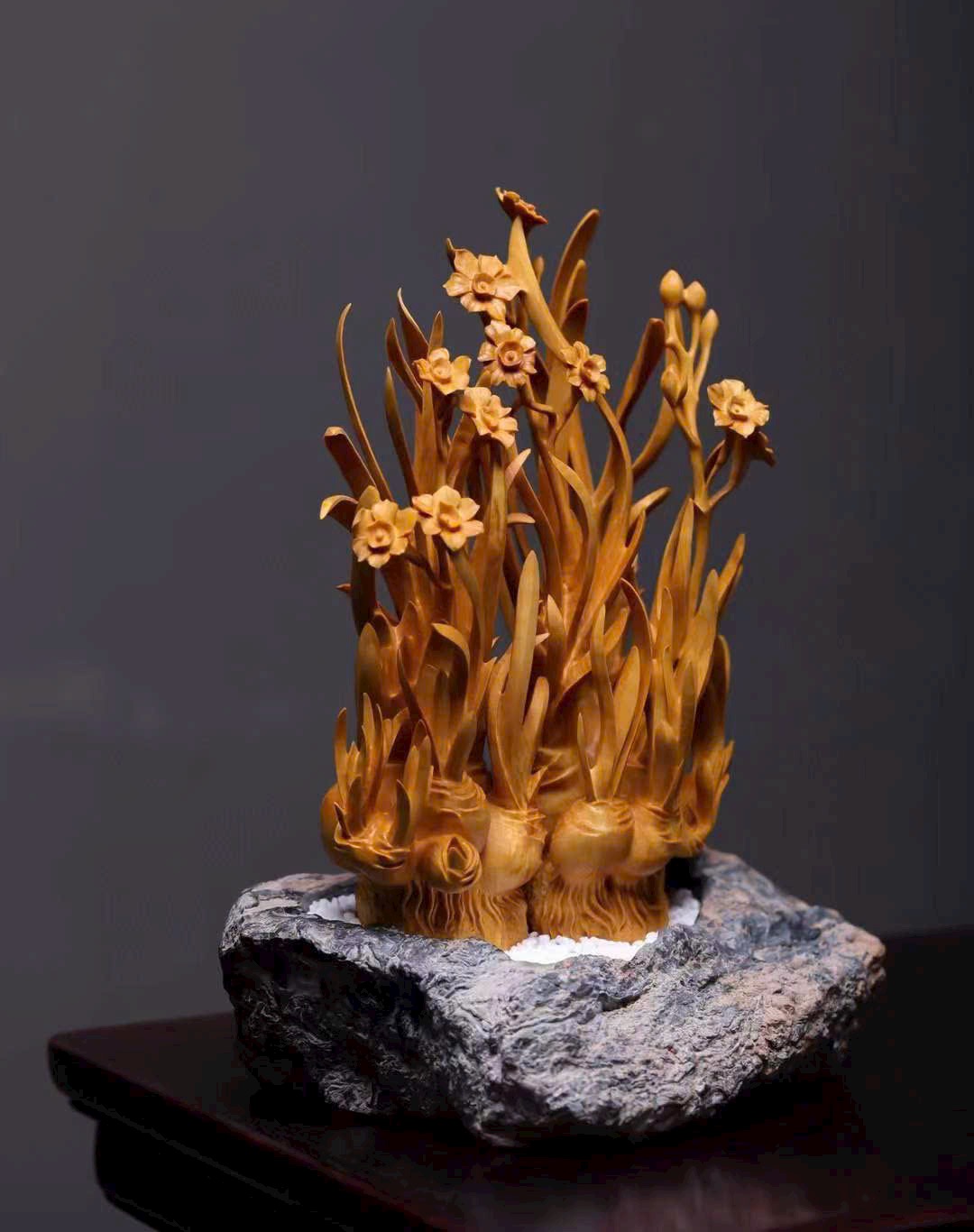 Dáng vẻ thủy tiên được khắc họa sinh động như thật: lá uốn lượn mềm mại, đường nét liền mạch, tựa khẽ đung đưa trong gió, toát lên vẻ linh hoạt – thanh thoát. Phần căn hành tròn đầy, chắc khỏe vươn nở trên phiến đá gồ ghề, để lộ vẻ đẹp tươi mới mà tao nhã giữa mộc mạc — như một khúc ca thiên nhiên lặng thầm.