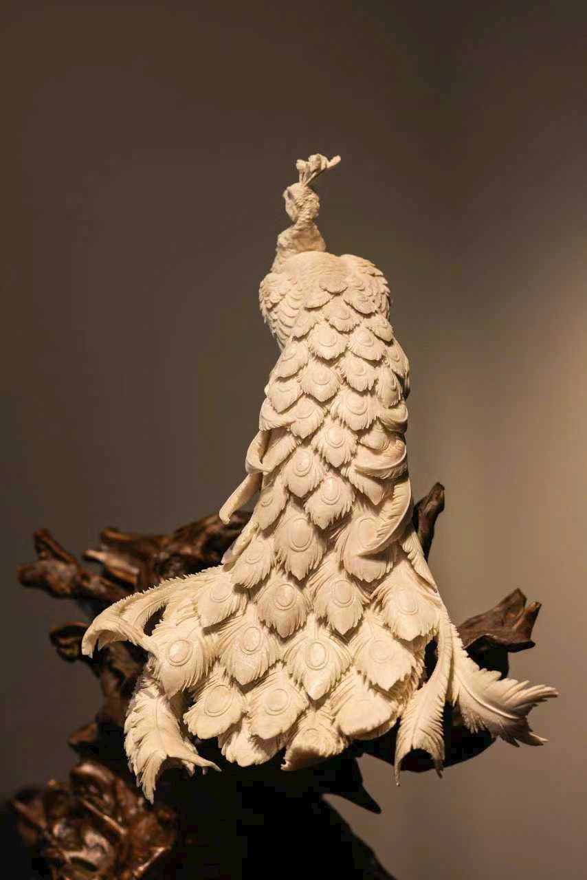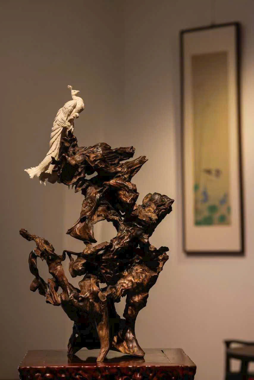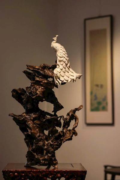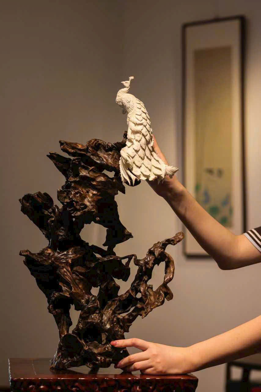 Xuyên mắt tầng tầng nối liền, phô bày trọn vẹn thú vui tự nhiên núi rừng. Chim công với bộ lông vũ lớp lớp, uyển chuyển đứng trên đá thưởng ngoạn, khí chất cao quý trang nhã. Bày nơi án thư tạo cảnh, thanh thoát khoáng đạt, nhìn vào liền sinh cảm giác thư thái.