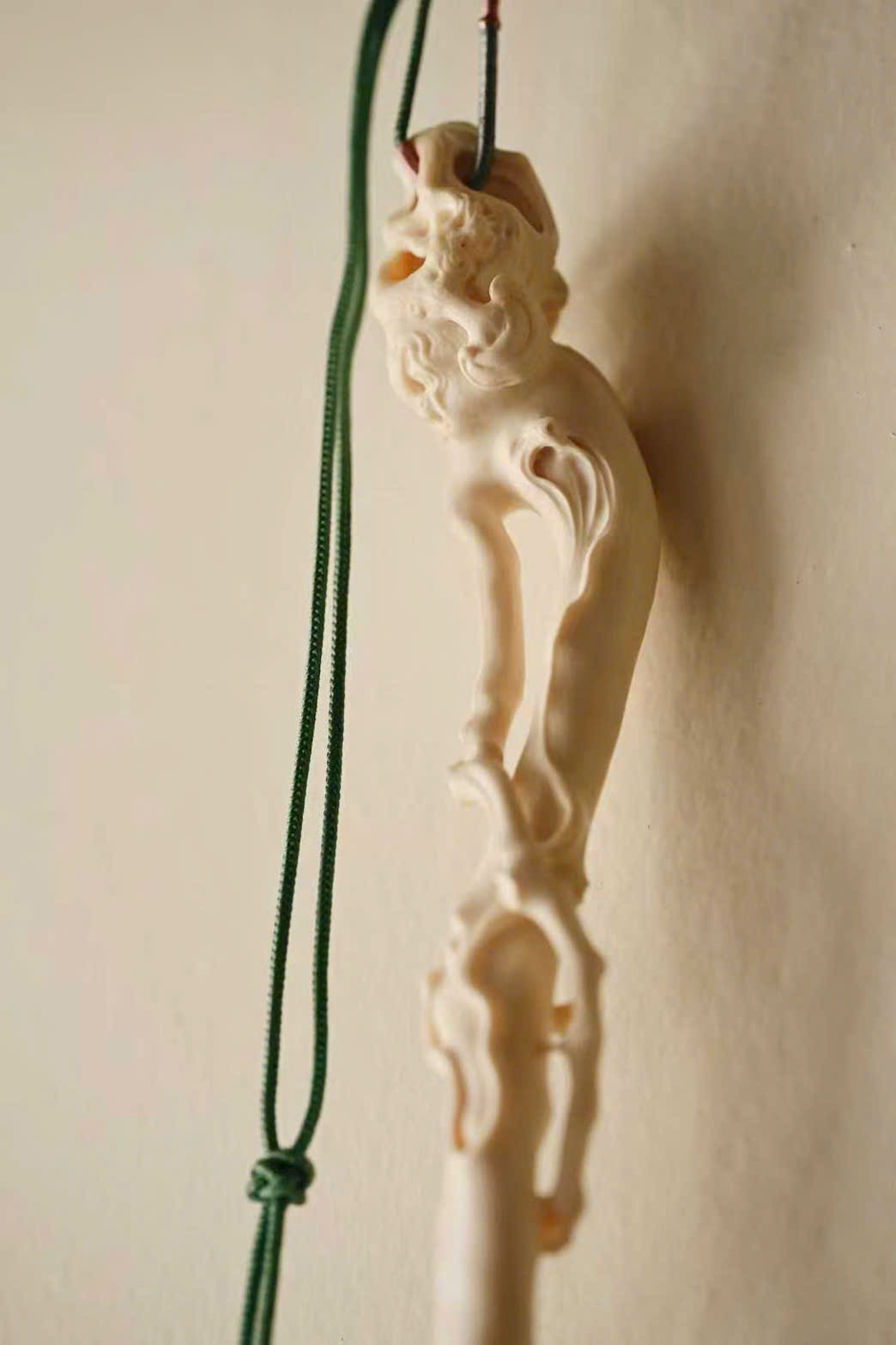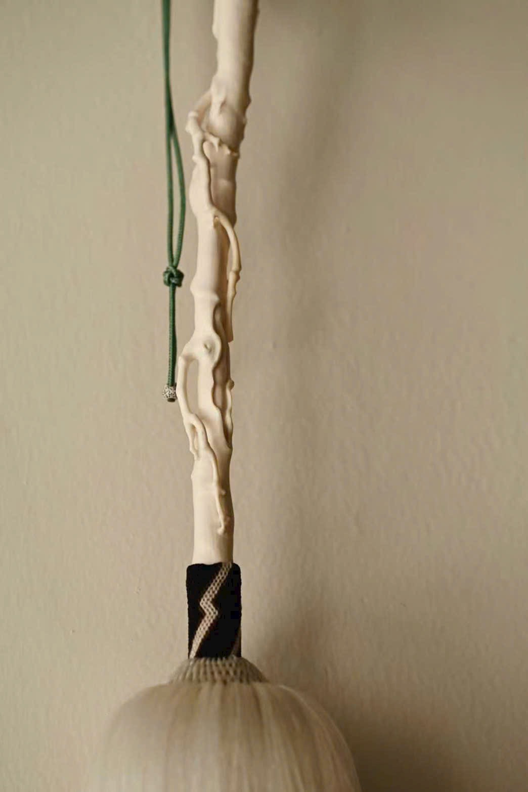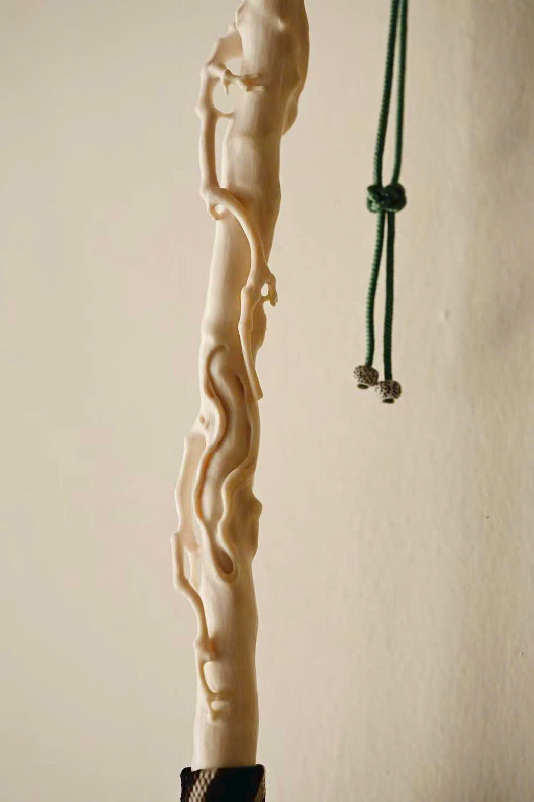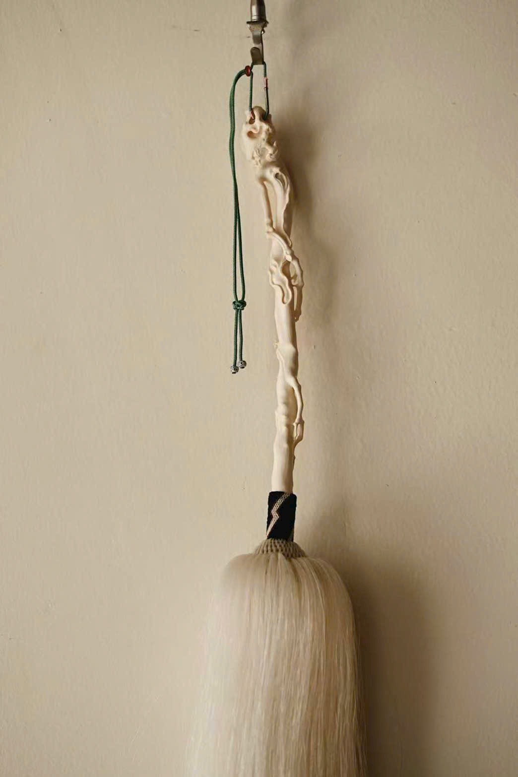 Cán phất trần được điêu khắc từ ng.à voi ma mút, tạo hình như dây mây quấn quanh, linh chi mọc nở, mang khí vận sinh sôi. Phần đầu phất trần dùng đuôi bờm ngựa, rũ xuống tự nhiên, sinh động mà mộc mạc.