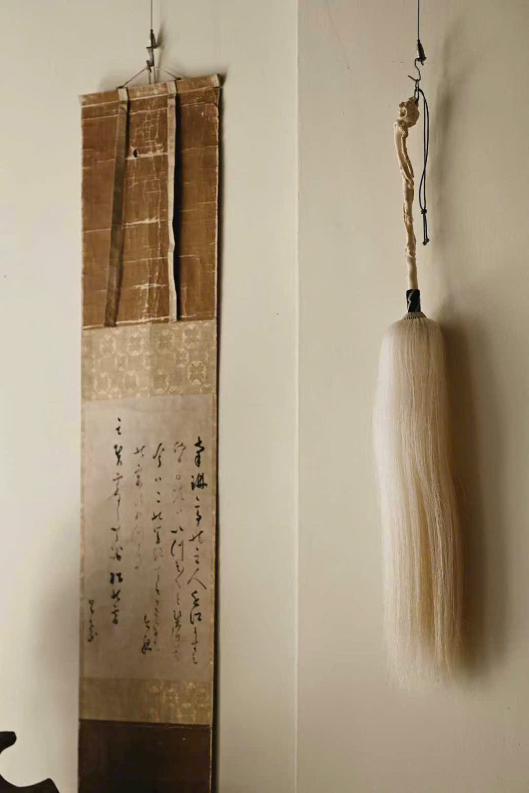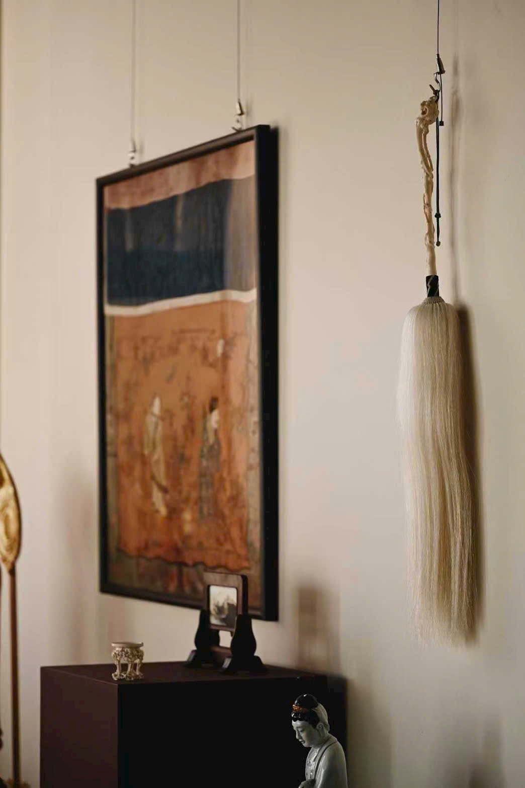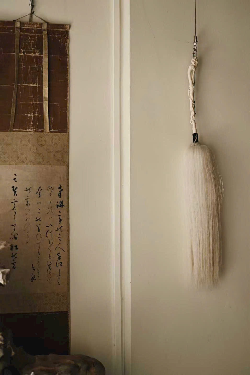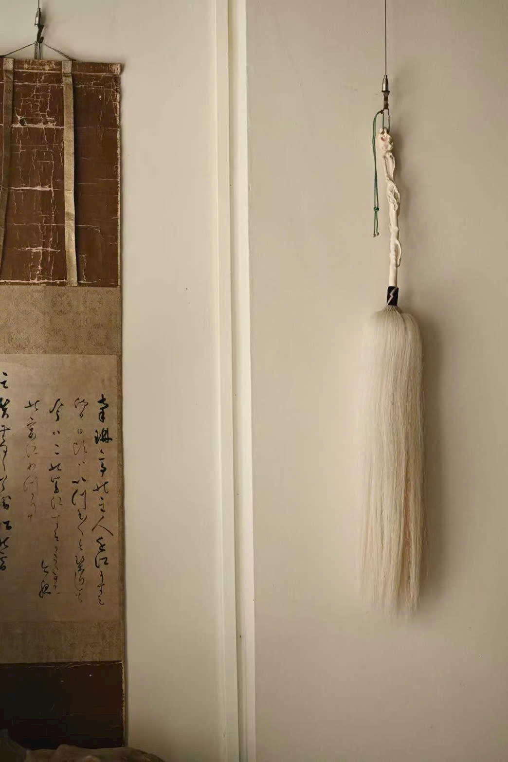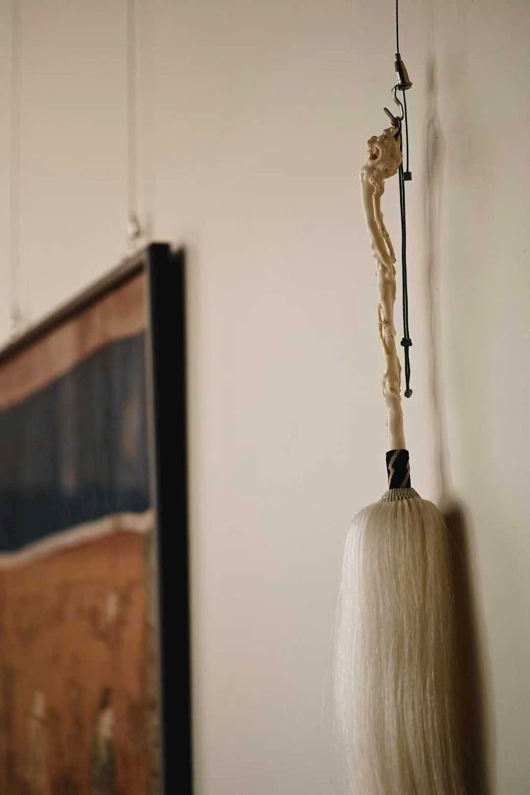 Cán phất trần được điêu khắc từ ng.à voi ma mút, tạo hình như dây mây quấn quanh, linh chi mọc nở, mang khí vận sinh sôi. Phần đầu phất trần dùng đuôi bờm ngựa, rũ xuống tự nhiên, sinh động mà mộc mạc.