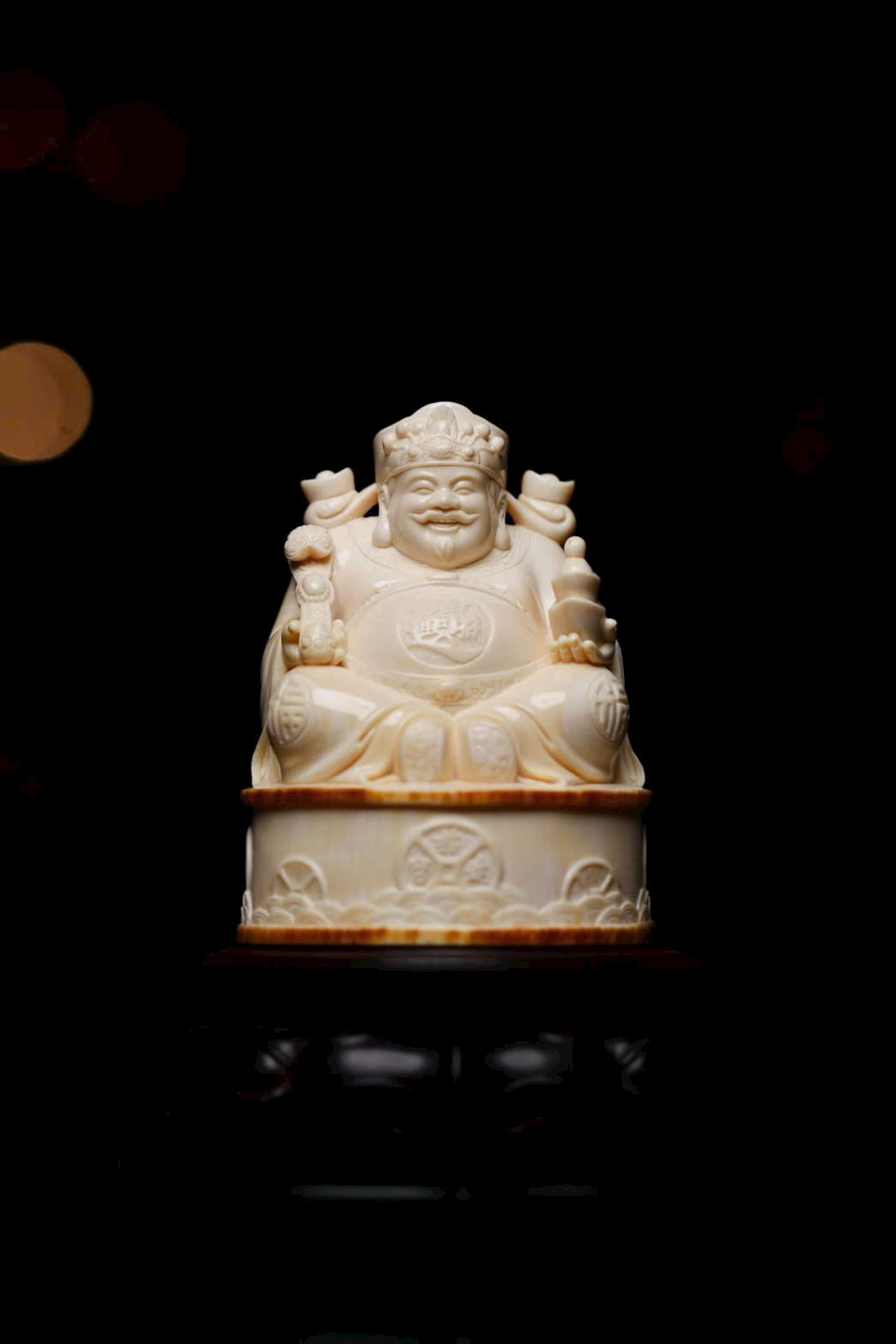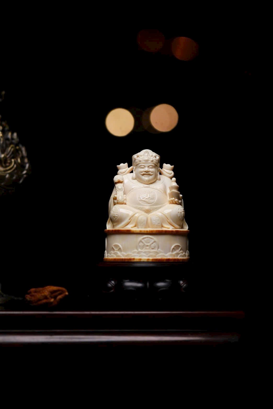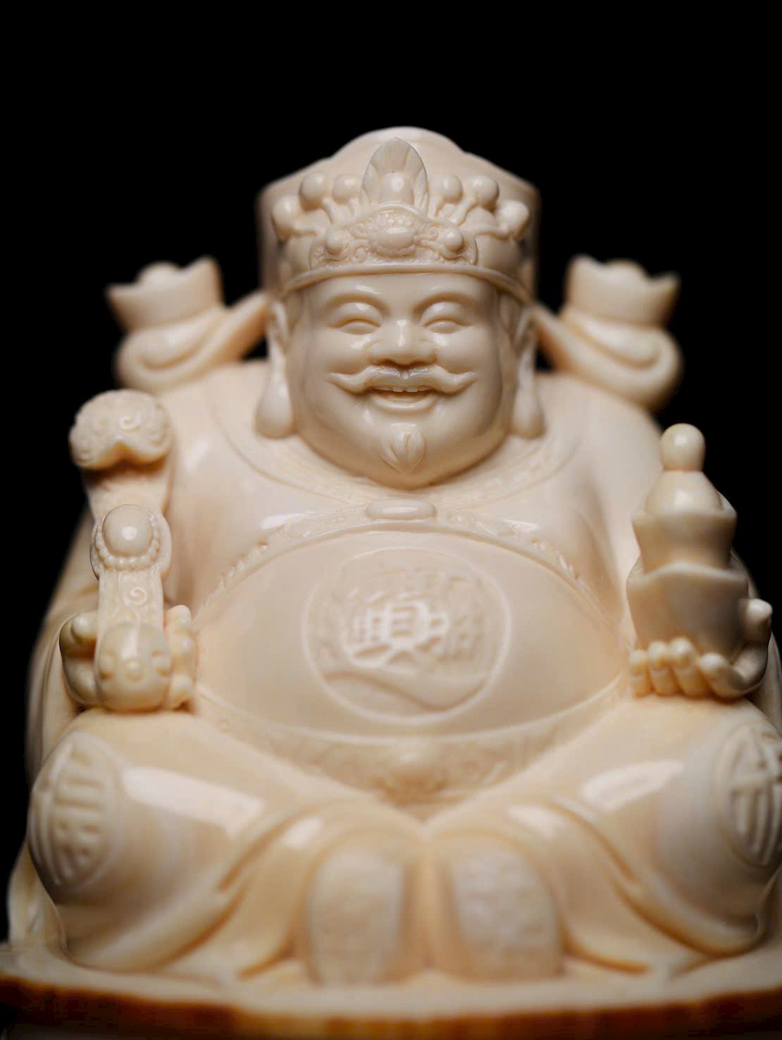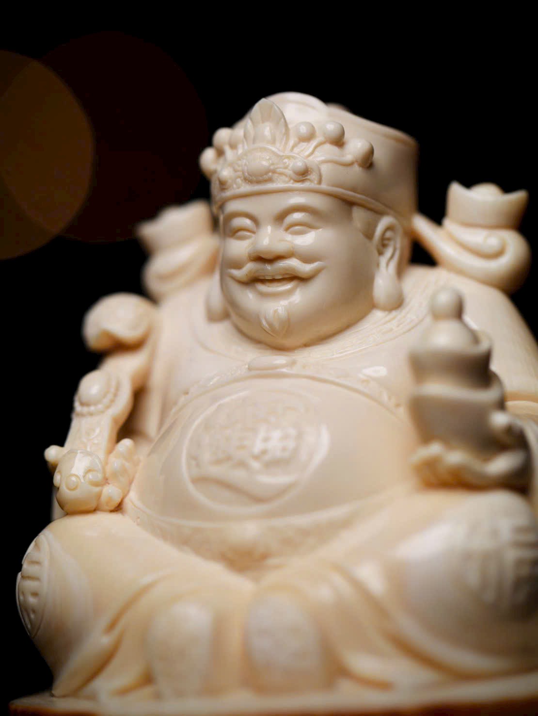 Tượng Tiểu Thần Tài được chế tác hoàn toàn thủ công từ ng.à voi ma mút 5A, tạo hình đầy đặn, có thần, đường nét mượt mà lưu loát. Thần Tài tay phải cầm Như Ý, tay trái nâng thỏi vàng, gương mặt hoan hỷ, thân thiện, cảm giác cầm tay mịn ấm, nhuận ngọc. Đặt yên một chỗ là chiêu tài – thêm hỷ, gửi lời chúc tài vận hanh thông, tiền vào không ngớt ✨