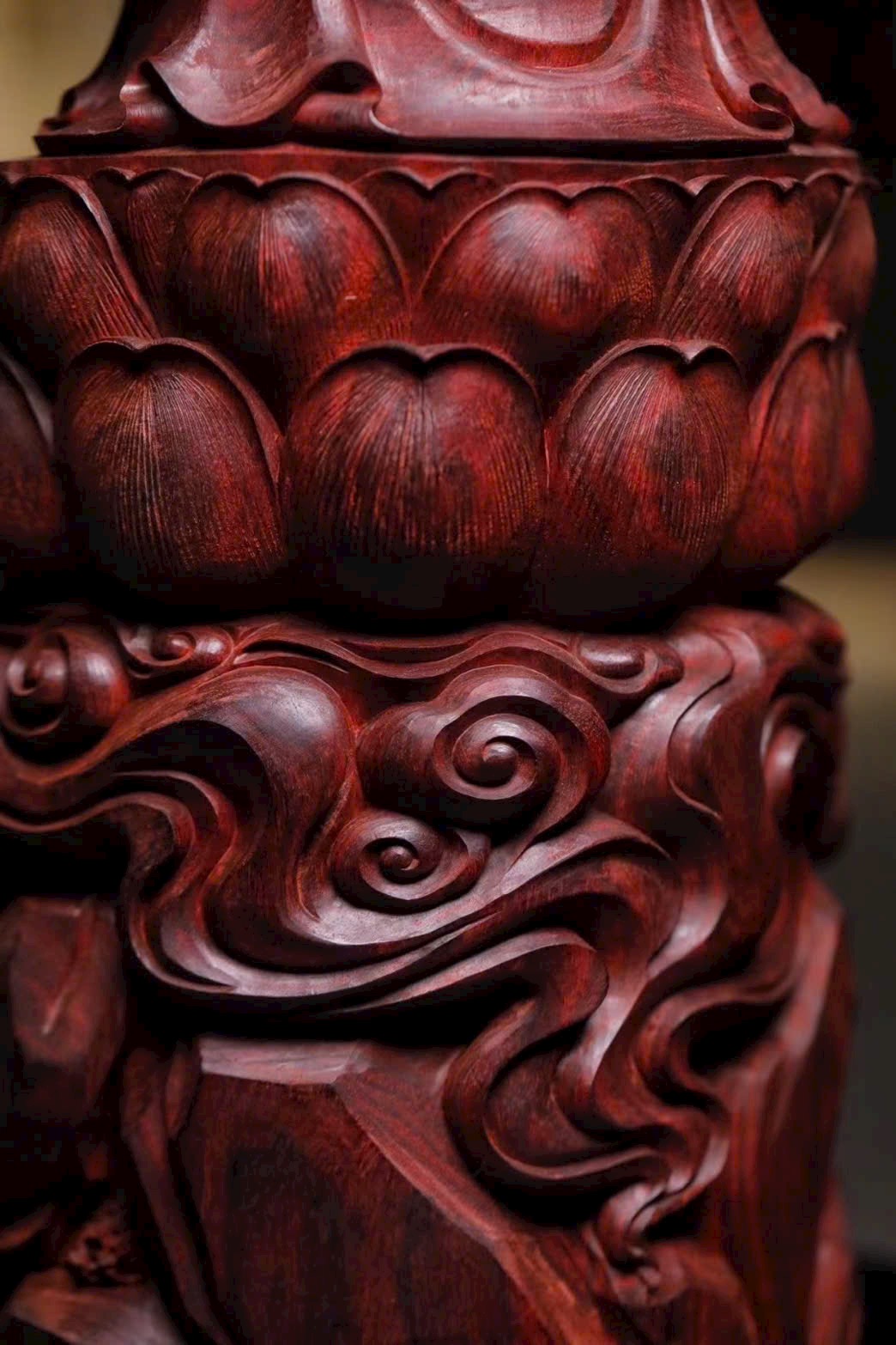 Chế tác từ một khối nguyên liệu hoàn chỉnh, sử dụng kỹ thuật điêu khắc tinh xảo bằng dao bén. Tượng pháp tướng có hình dáng cân đối và thanh nhã, khuôn mặt mở nét trang nghiêm, tinh tế, toát lên vẻ từ bi viên mãn. Đường nét điêu khắc gọn gàng, mượt mà và tự nhiên. Áo báu xếp lớp như mây nước lưu chuyển, Quan Âm tay cầm tịnh bình, ánh mắt nhìn xuống như lắng nghe tiếng khổ của chúng sinh, thể hiện trọn vẹn vẻ trang nghiêm và từ bi.