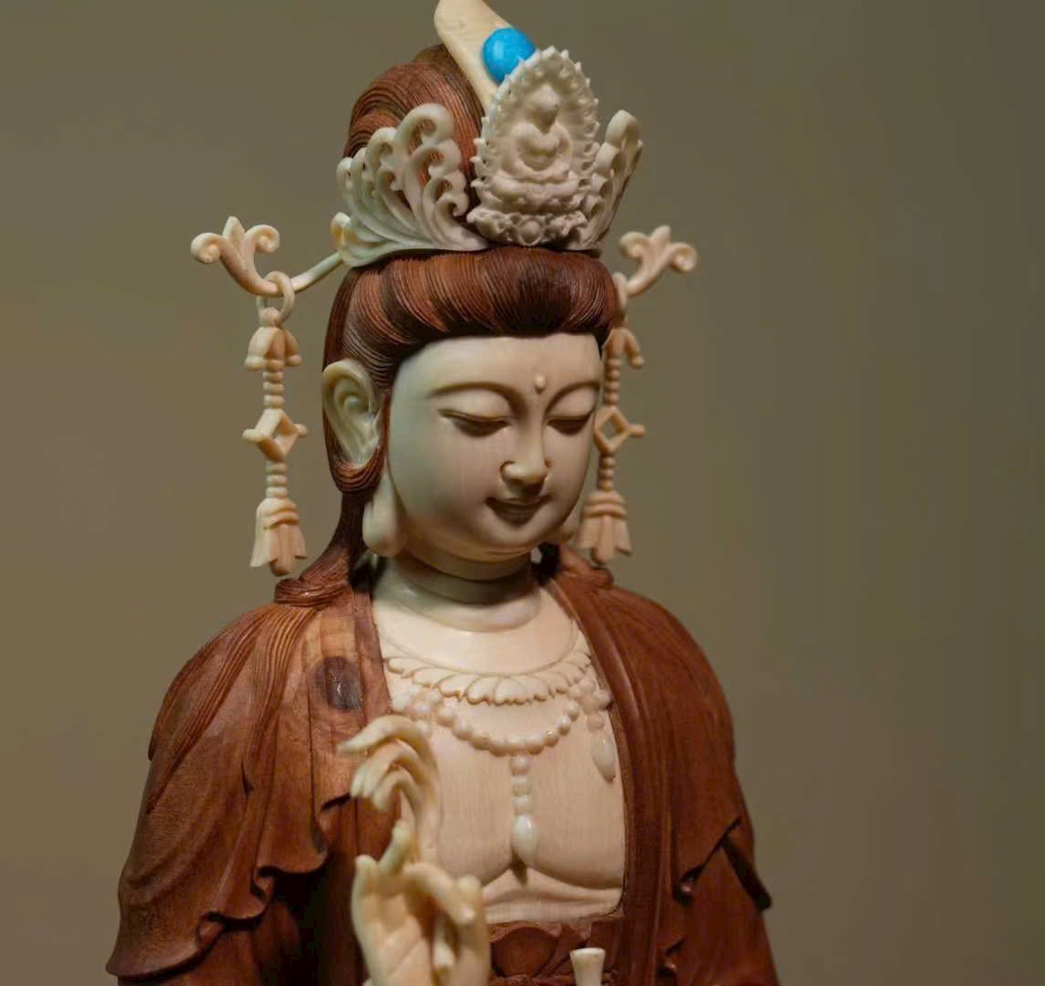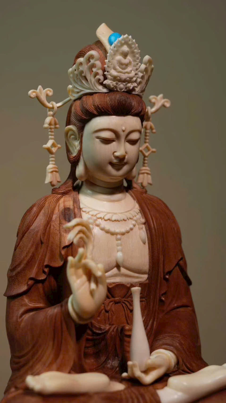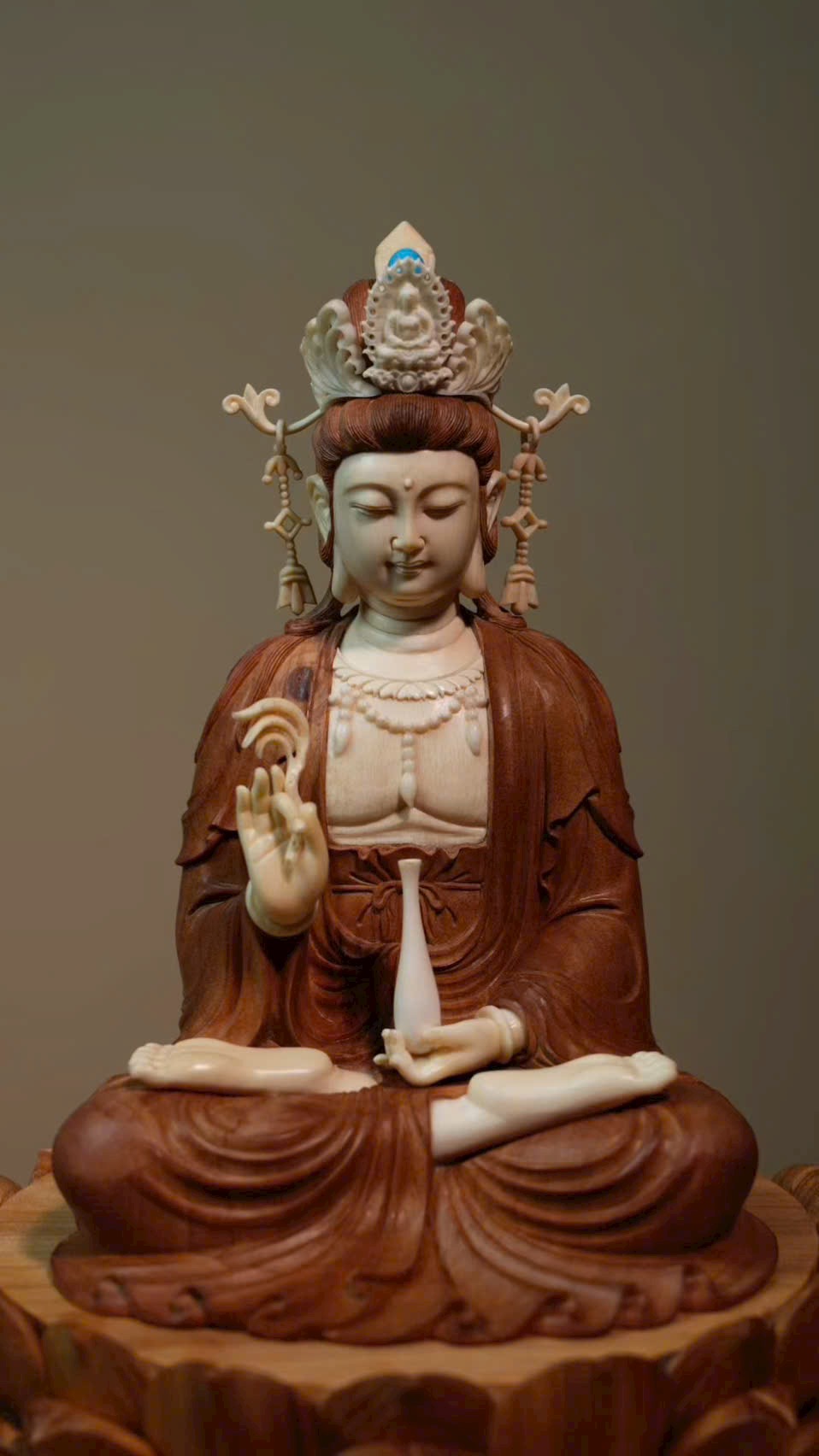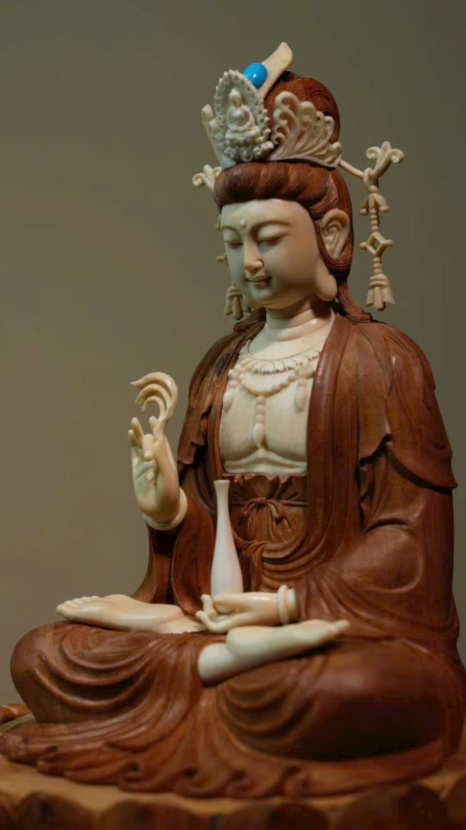 Y thiên y lụa mềm bay nhẹ, tôn lên dáng Quan Âm trang nghiêm mà linh động. Tay cầm tịnh bình và cành dương liễu, rưới cam lộ khắp nơi, ban phúc lành từ bi cho muôn loài.