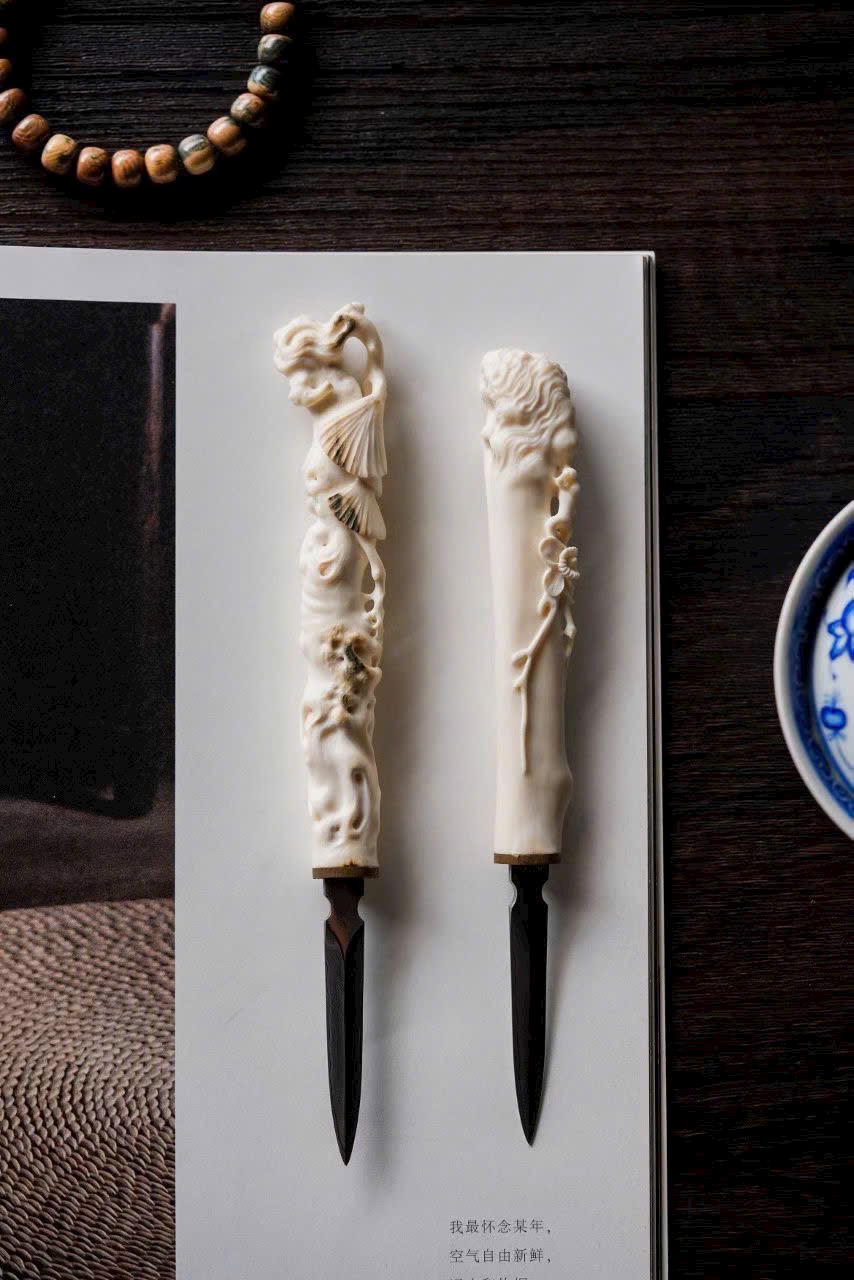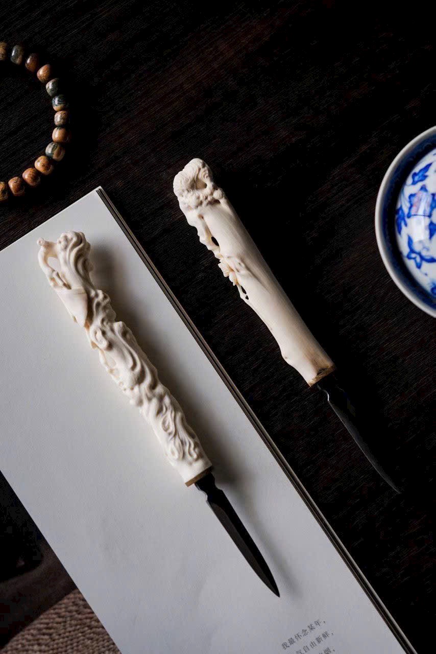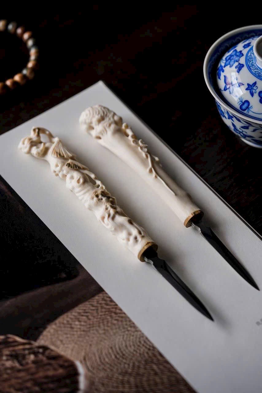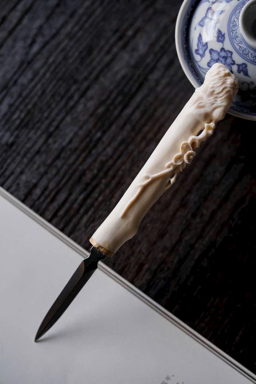 Chất ng.à như ngọc, đôi dao tạo hình nhánh mai giao thoa. Khắc cành mai già, lá non hé mở, gân lá rõ nét. Như tuyết phủ trà bàn, hương trà lan tỏa, dao mang theo sắc xuân tươi mới.