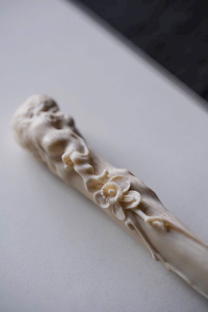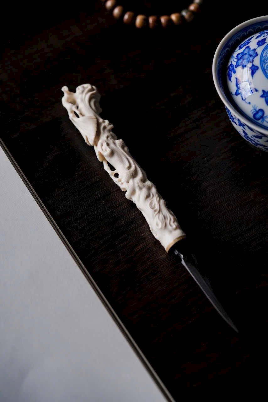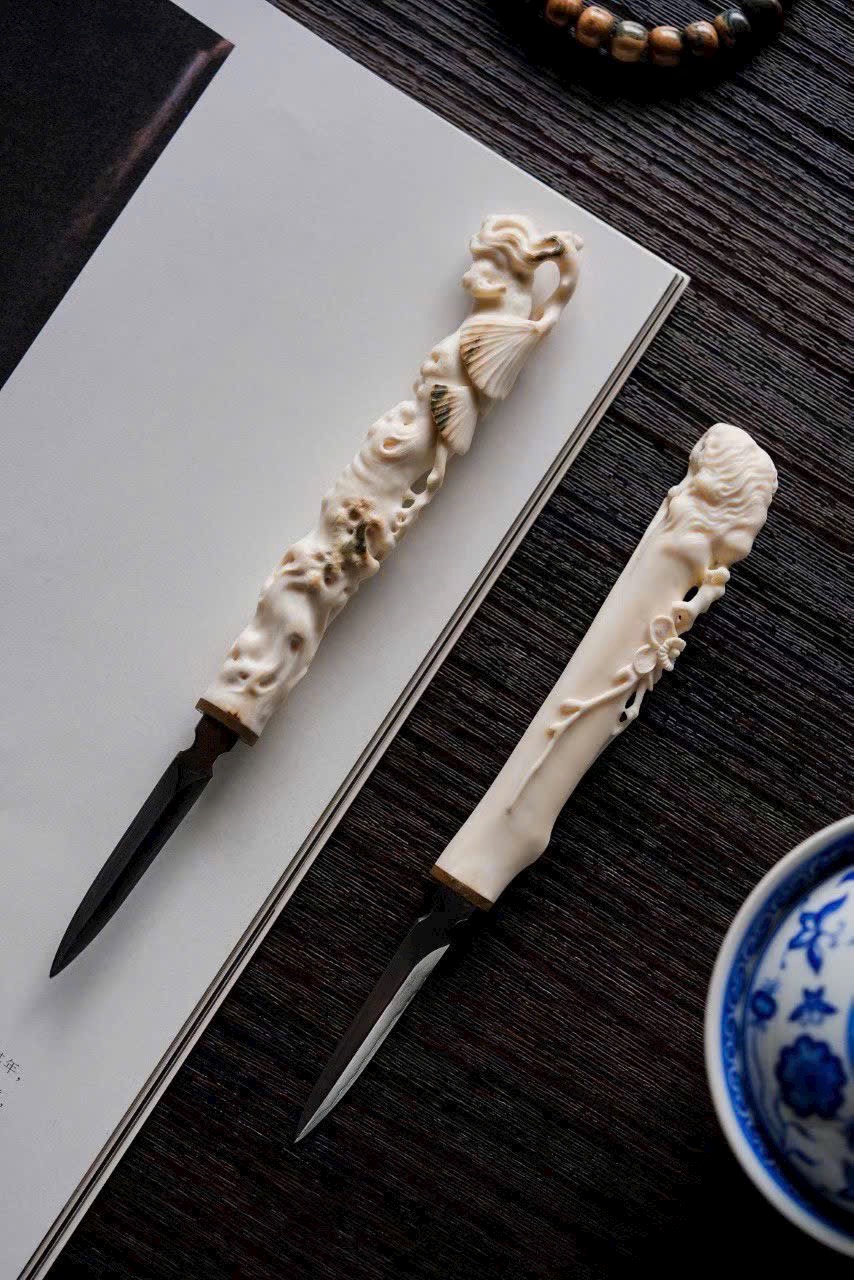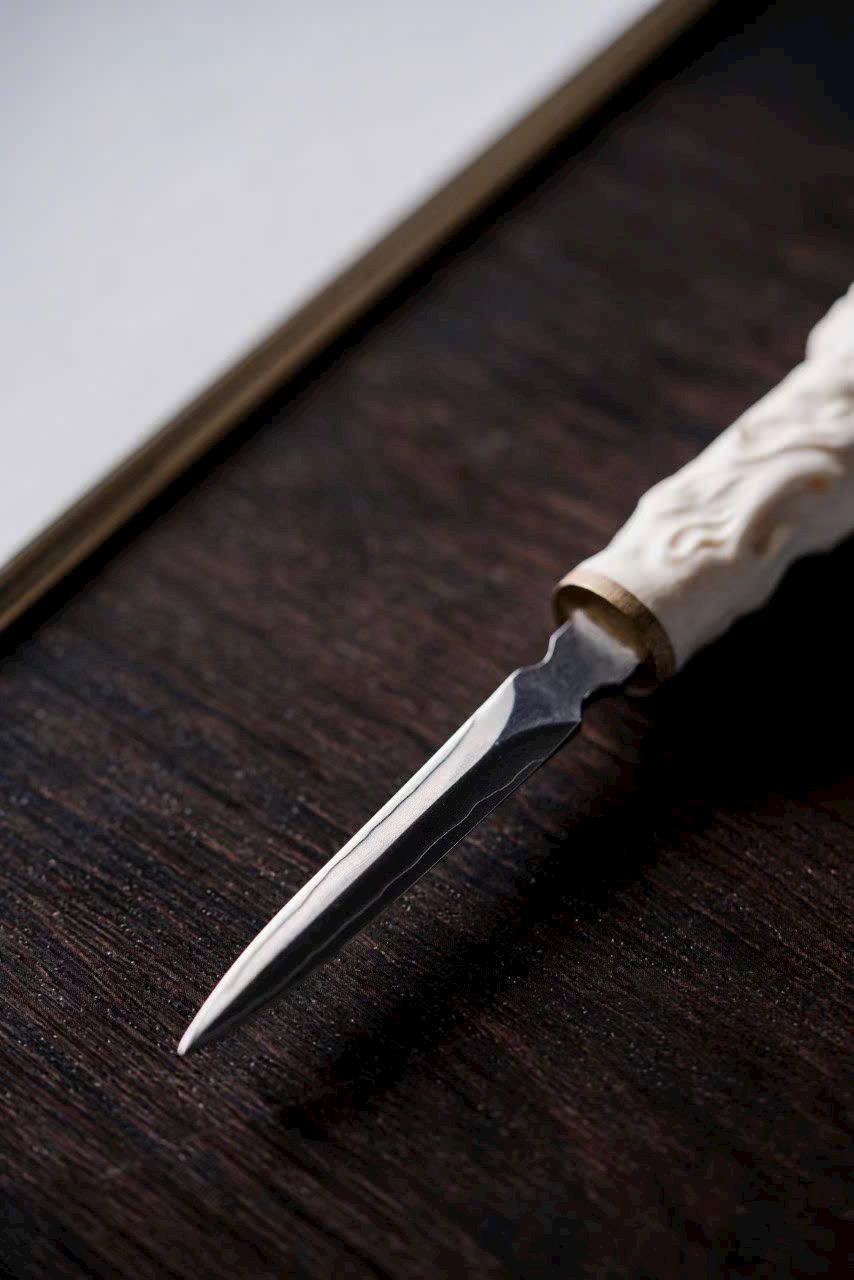 Chất ng.à như ngọc, đôi dao tạo hình nhánh mai giao thoa. Khắc cành mai già, lá non hé mở, gân lá rõ nét. Như tuyết phủ trà bàn, hương trà lan tỏa, dao mang theo sắc xuân tươi mới.