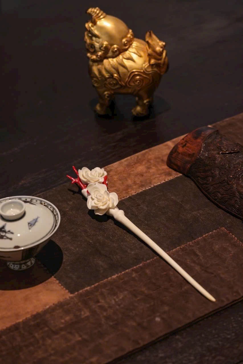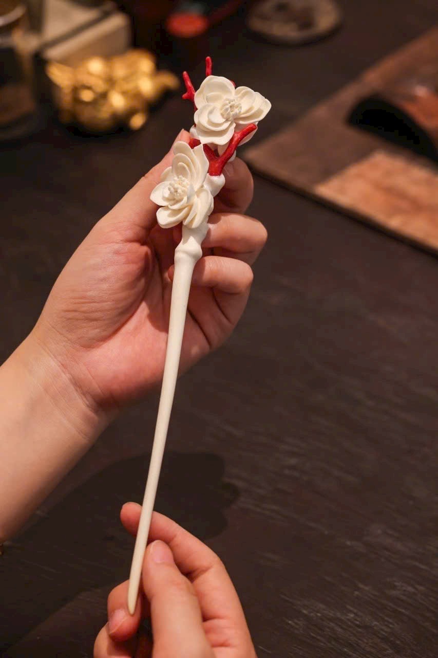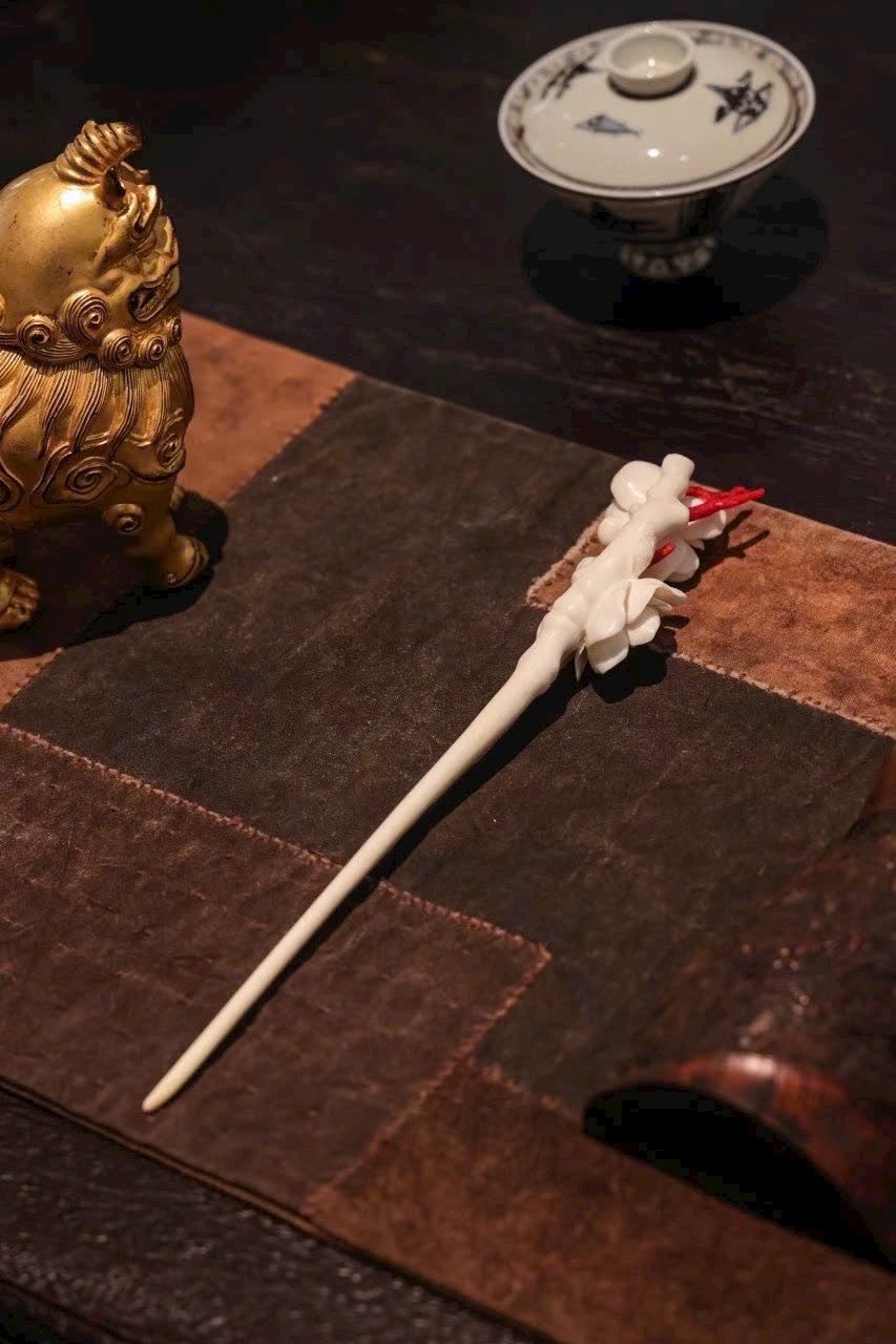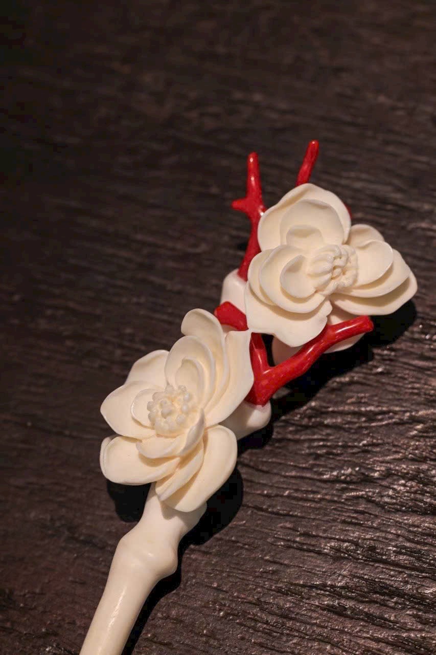 🌿 Chiếc trâm cài tóc được chạm khắc tinh xảo từ sừng hươu này mang hình dáng hoa hải đường, cành uốn lượn mềm mại, cánh hoa duyên dáng yêu kiều. Thân trâm có vân gợn như dấu vết của năm tháng, bộ phận bước diêu nhẹ rung, tựa như hoa hải đường đọng sương, tăng thêm phần dịu dàng, toát lên vẻ cổ điển đậm chất phương Đông.