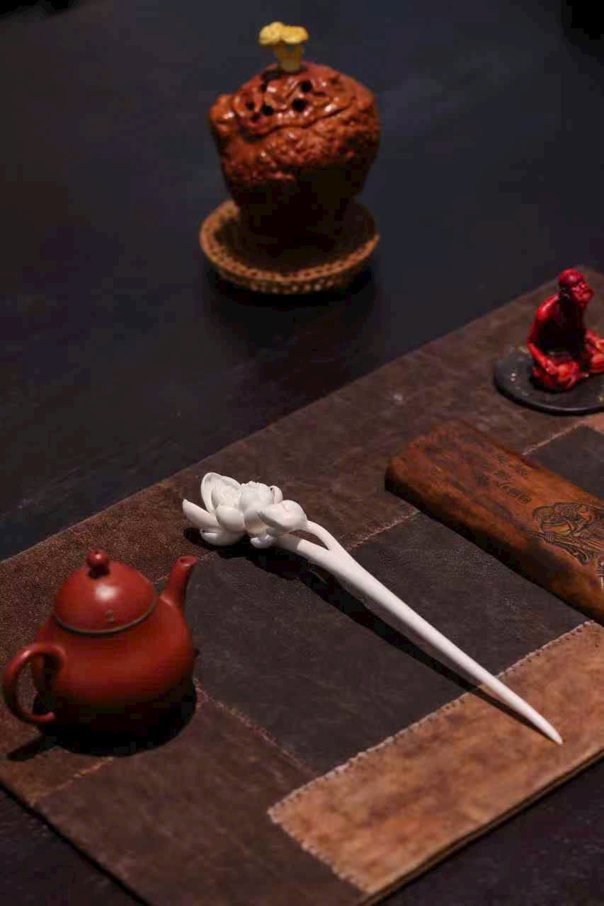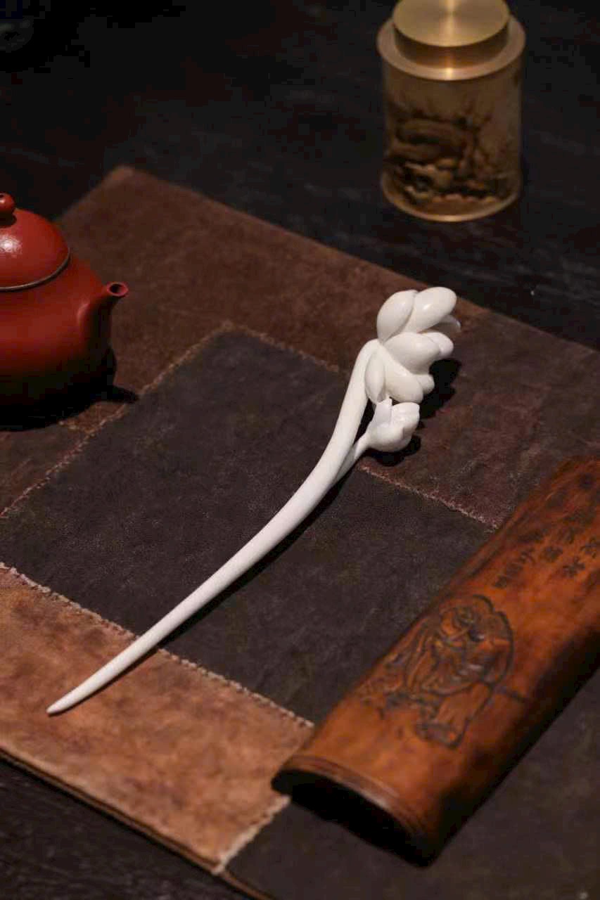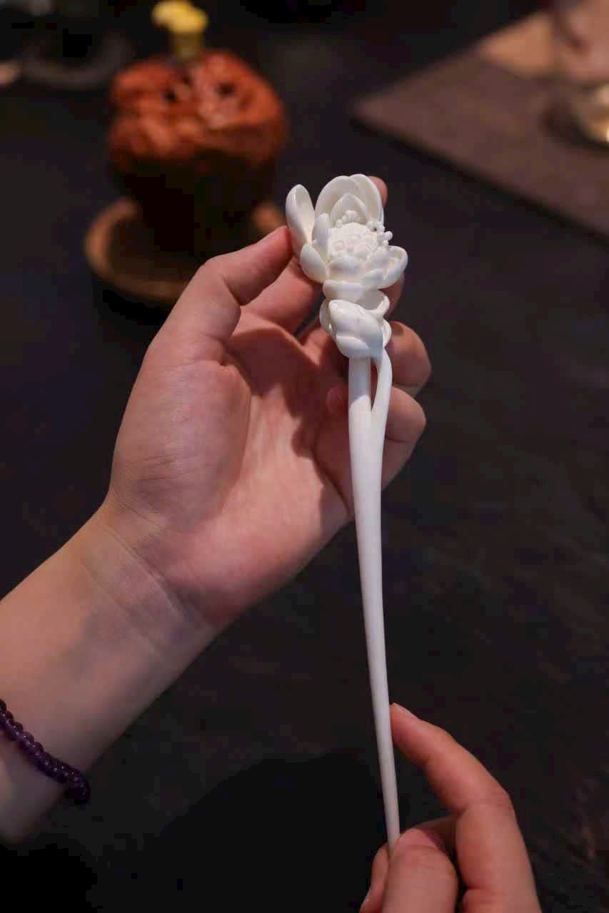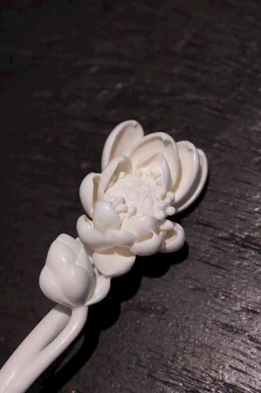 Sừng hươu mịn màng, chạm khắc một đóa sen vừa độ nở. Gân lá tinh xảo, nhụy sen ẩn chứa nét duyên; đầu trâm như giọt sương sắp rơi chưa rơi. Khi cài lên tóc, hương sen nhẹ theo bước, toát lên vẻ thanh tao, thoát tục.