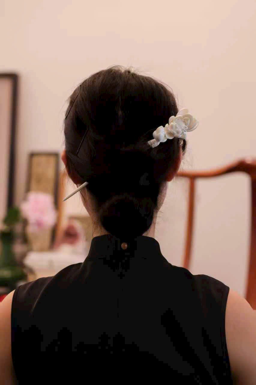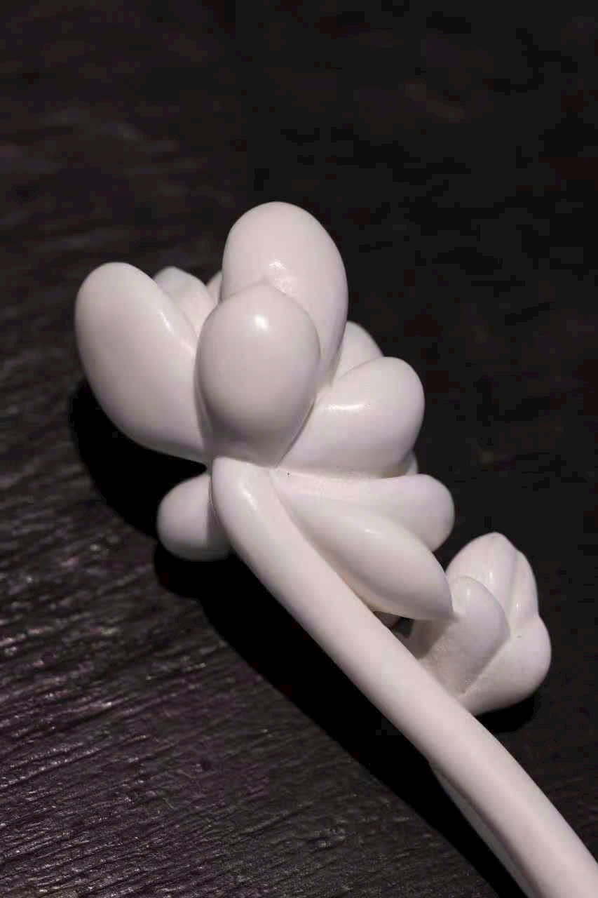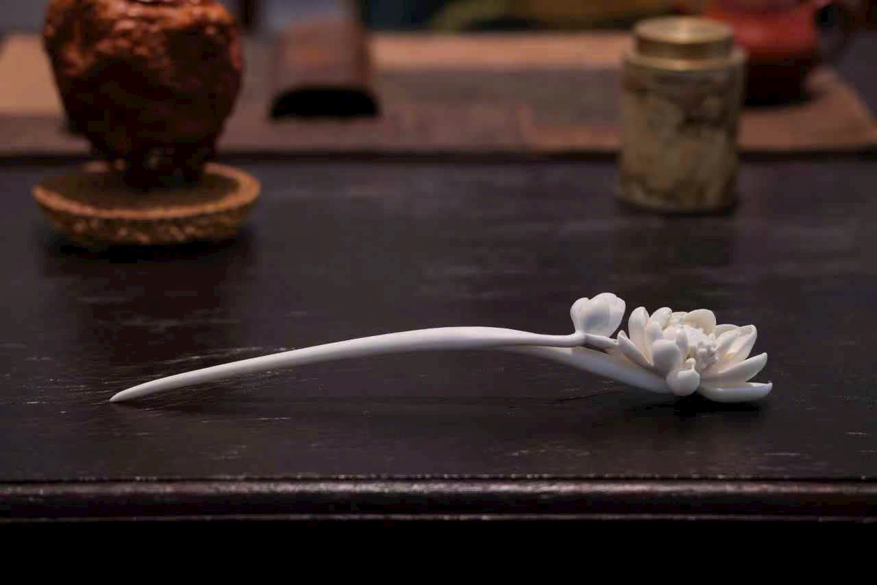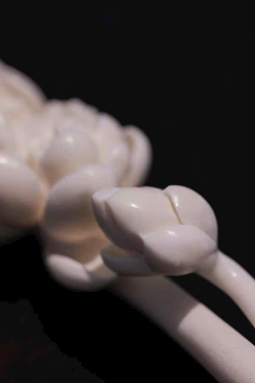 Sừng hươu mịn màng, chạm khắc một đóa sen vừa độ nở. Gân lá tinh xảo, nhụy sen ẩn chứa nét duyên; đầu trâm như giọt sương sắp rơi chưa rơi. Khi cài lên tóc, hương sen nhẹ theo bước, toát lên vẻ thanh tao, thoát tục.