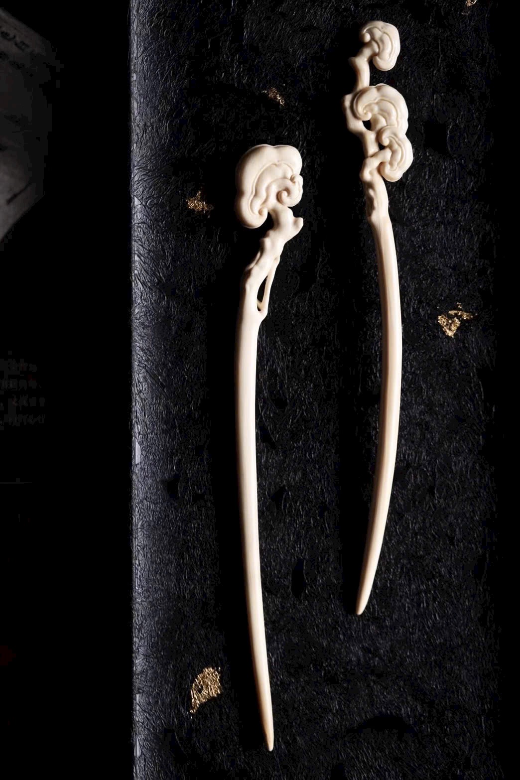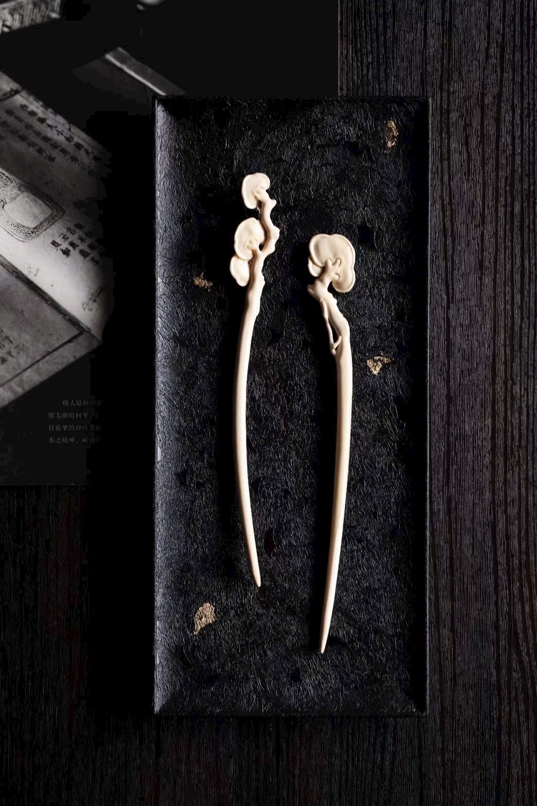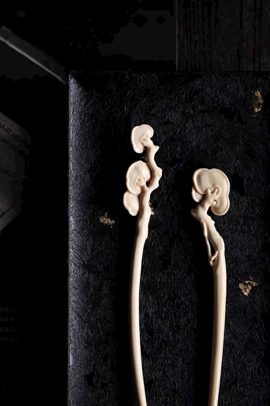 Màu ngà trắng ngần như tuyết tụ trên lớp mỡ đông, khéo léo chạm khắc hình linh chi mọc giữa mây vờn. Thân trâm uốn lượn mềm mại, tán nấm xếp lớp ẩn giọt sương tinh tế. Khi cài nghiêng trên mái tóc đen, như thể tiên thảo tỏa hương thầm, toát lên vẻ thanh nhã của cảnh rừng sâu thoát tục.