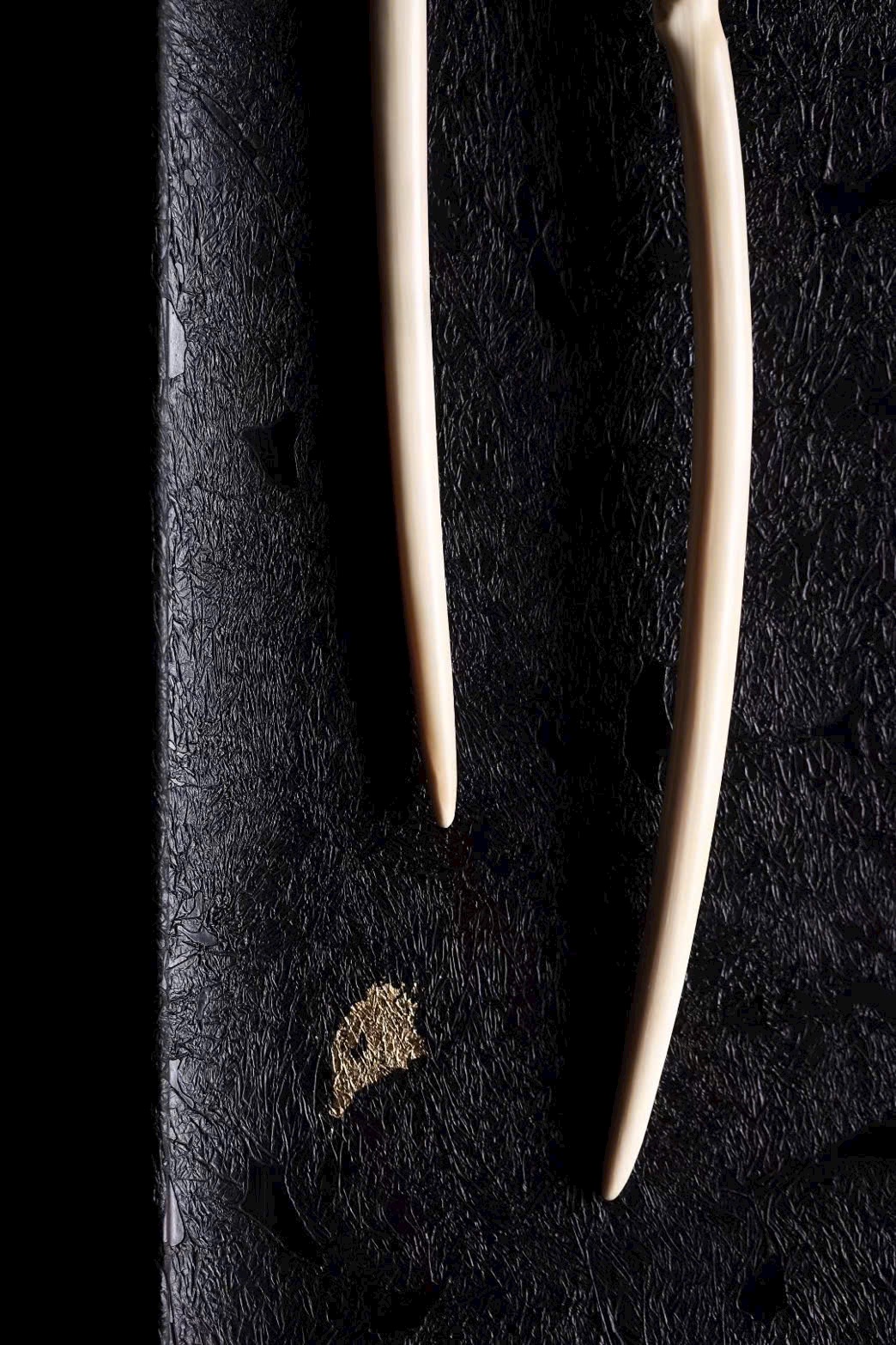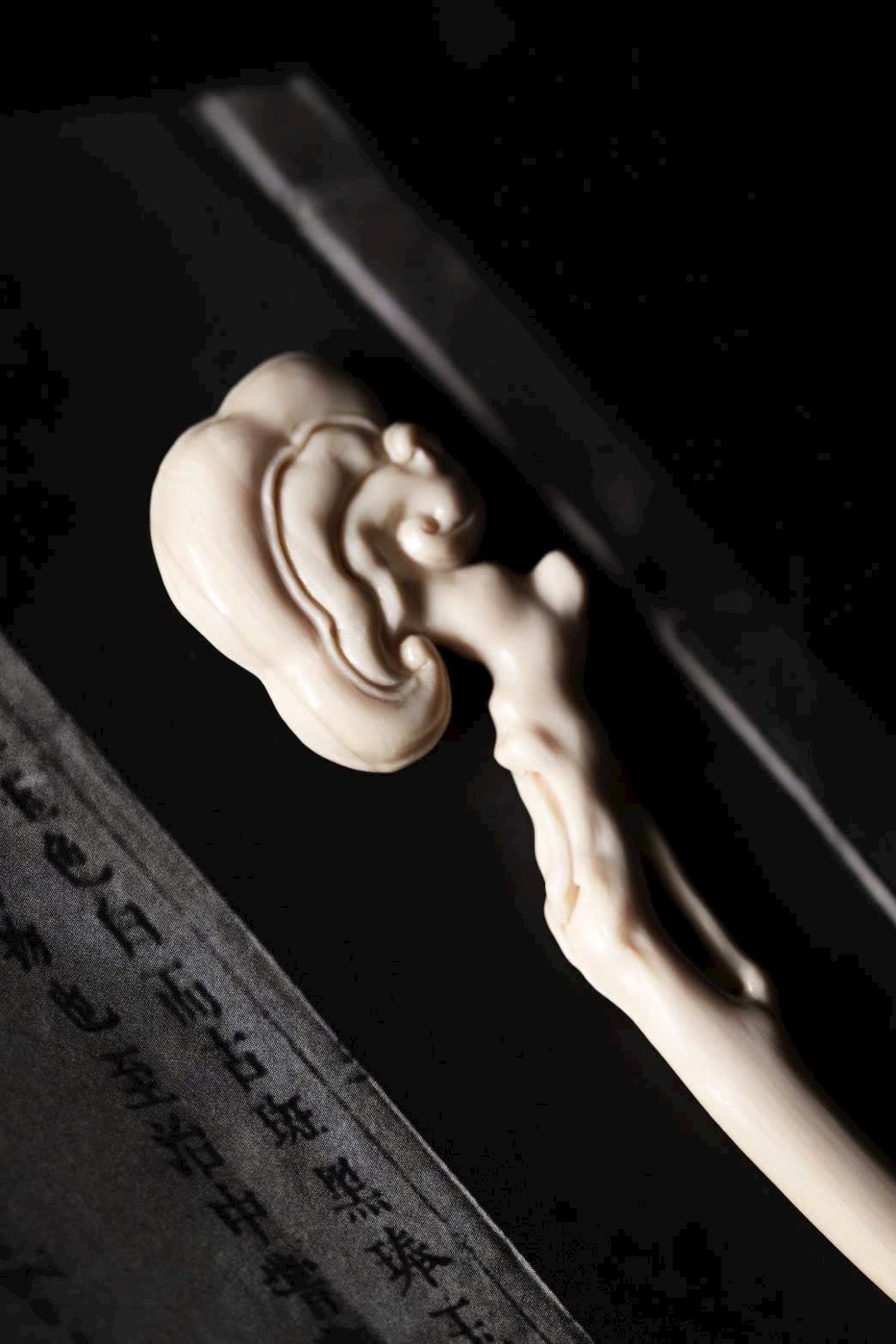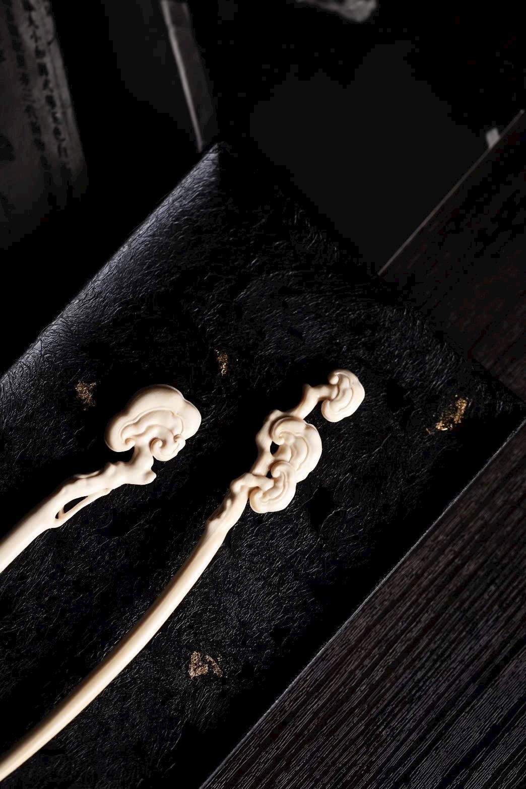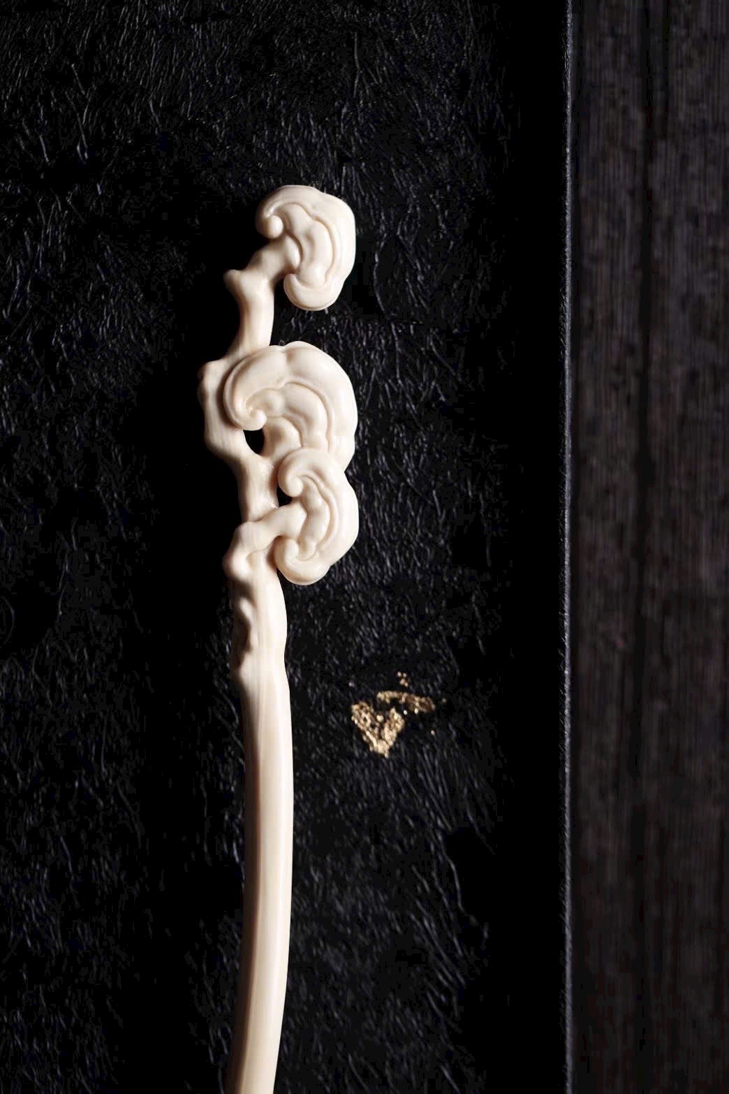 Màu ngà trắng ngần như tuyết tụ trên lớp mỡ đông, khéo léo chạm khắc hình linh chi mọc giữa mây vờn. Thân trâm uốn lượn mềm mại, tán nấm xếp lớp ẩn giọt sương tinh tế. Khi cài nghiêng trên mái tóc đen, như thể tiên thảo tỏa hương thầm, toát lên vẻ thanh nhã của cảnh rừng sâu thoát tục.