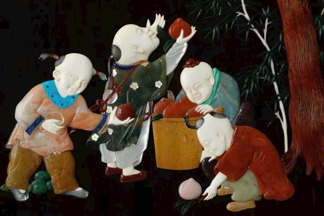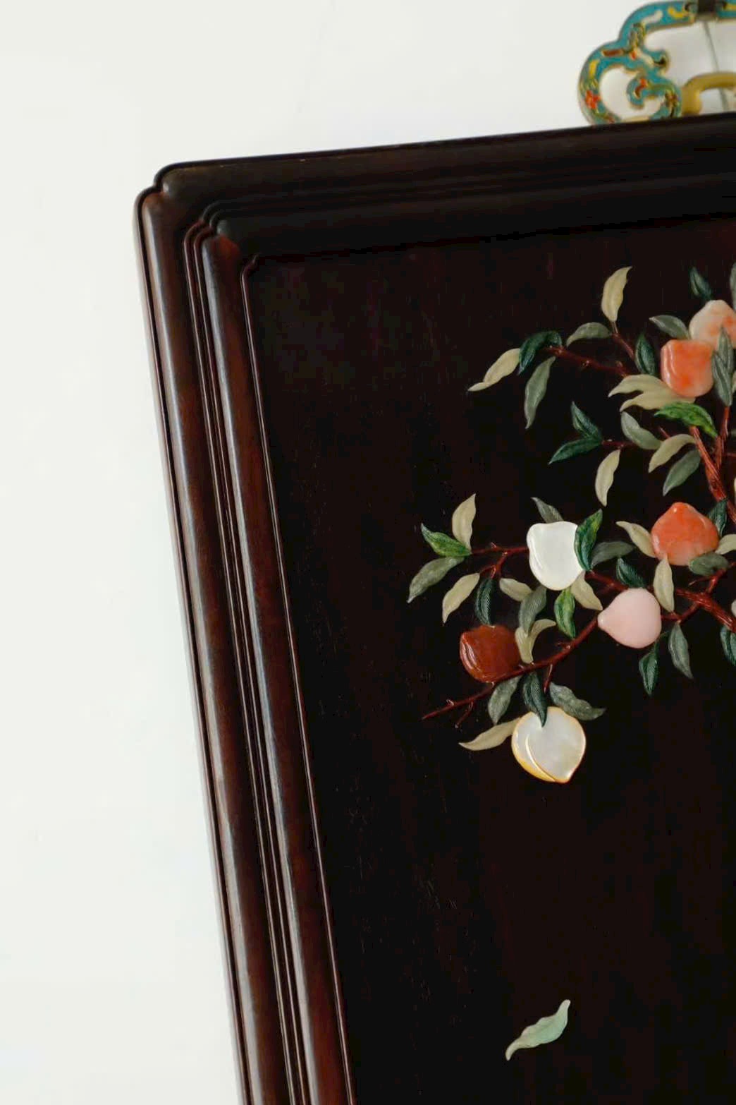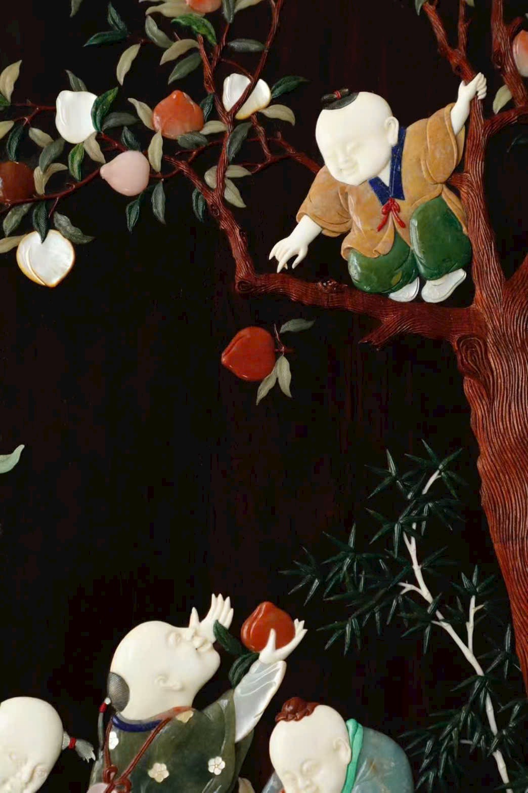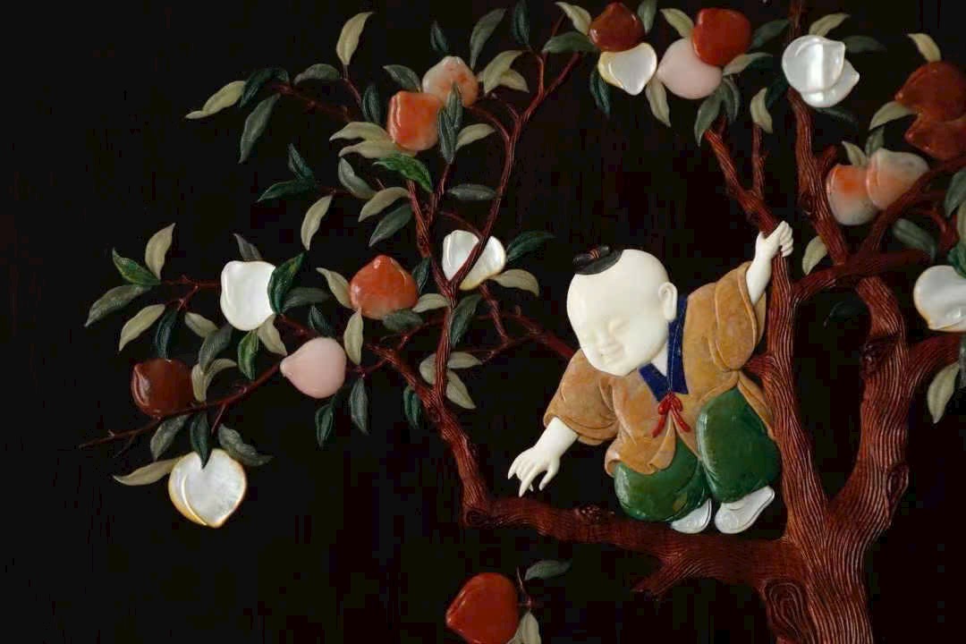 Kỹ pháp bách bảo khảm mềm mại, thanh nhã; đường dao gọn gàng, dứt khoát. Cây đào trĩu quả, trái đào đầy đặn; thân trúc đốt rõ ràng, cứng cáp mạnh mẽ. Tổng thể rực rỡ, chi tiết phong phú thu trọn trong tầm mắt. Ý nghĩa cát tường: phúc – thọ – khang – ninh, nhiều phúc nhiều thọ, bình an hỷ lạc. Tác phẩm toàn vẹn, không tì vết, có giá trị sưu tầm cao.