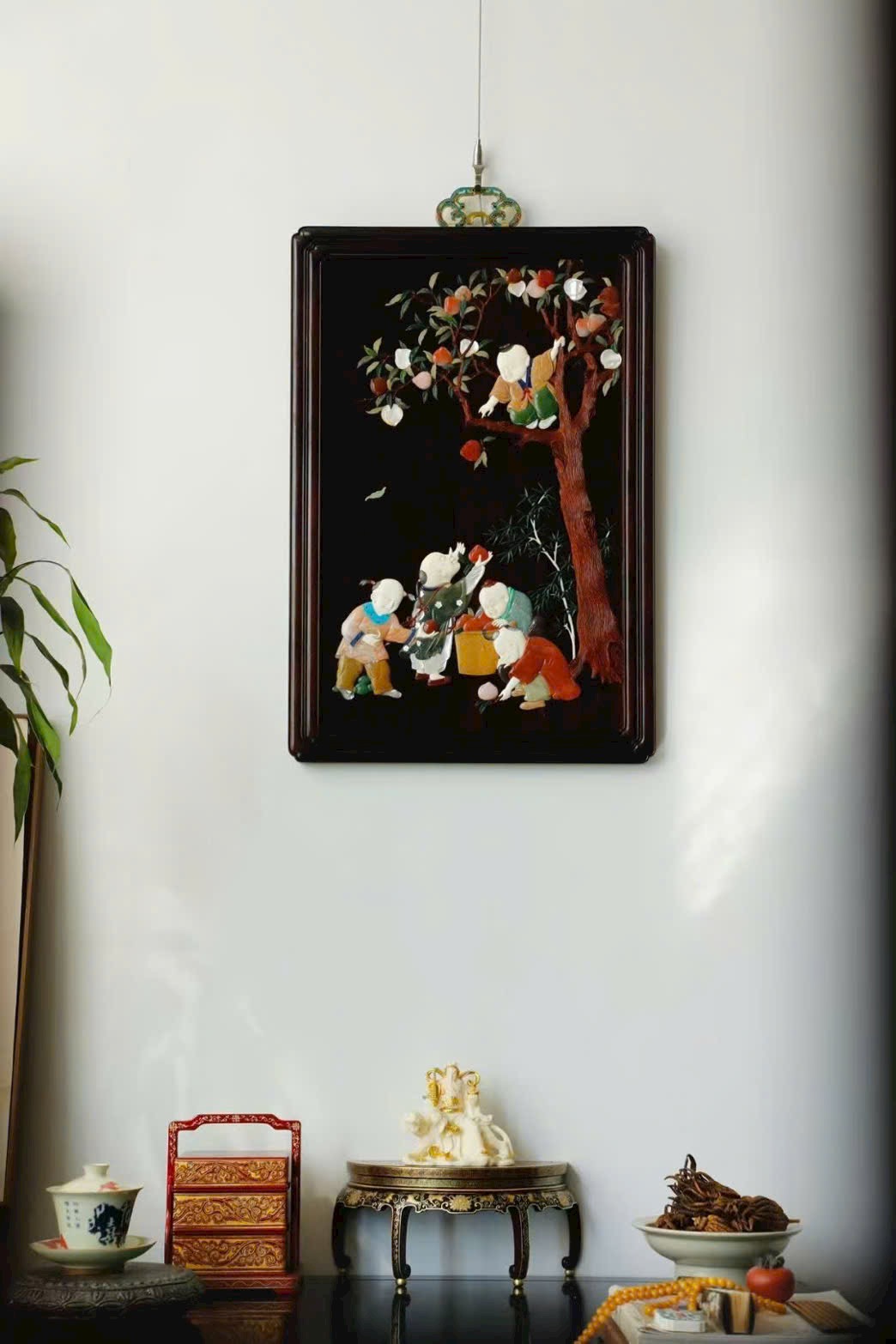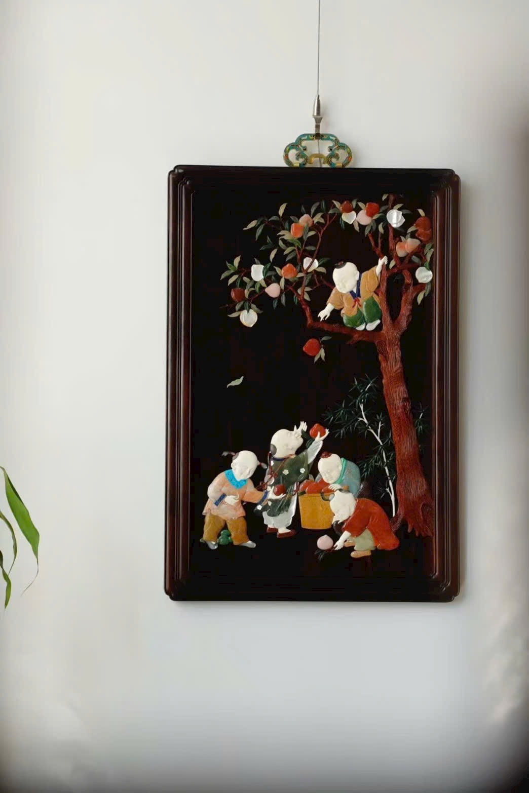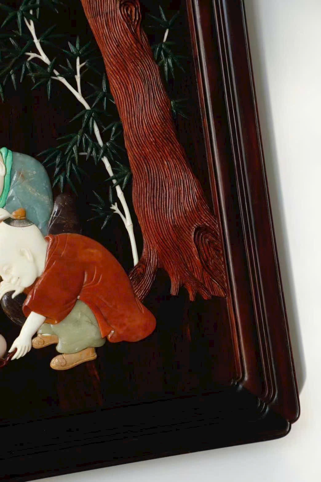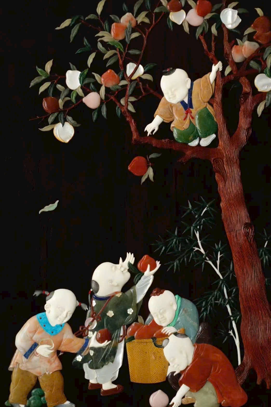 Kỹ pháp bách bảo khảm mềm mại, thanh nhã; đường dao gọn gàng, dứt khoát. Cây đào trĩu quả, trái đào đầy đặn; thân trúc đốt rõ ràng, cứng cáp mạnh mẽ. Tổng thể rực rỡ, chi tiết phong phú thu trọn trong tầm mắt. Ý nghĩa cát tường: phúc – thọ – khang – ninh, nhiều phúc nhiều thọ, bình an hỷ lạc. Tác phẩm toàn vẹn, không tì vết, có giá trị sưu tầm cao.