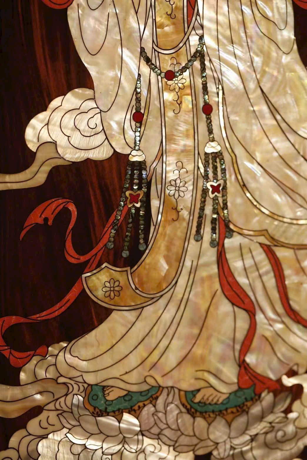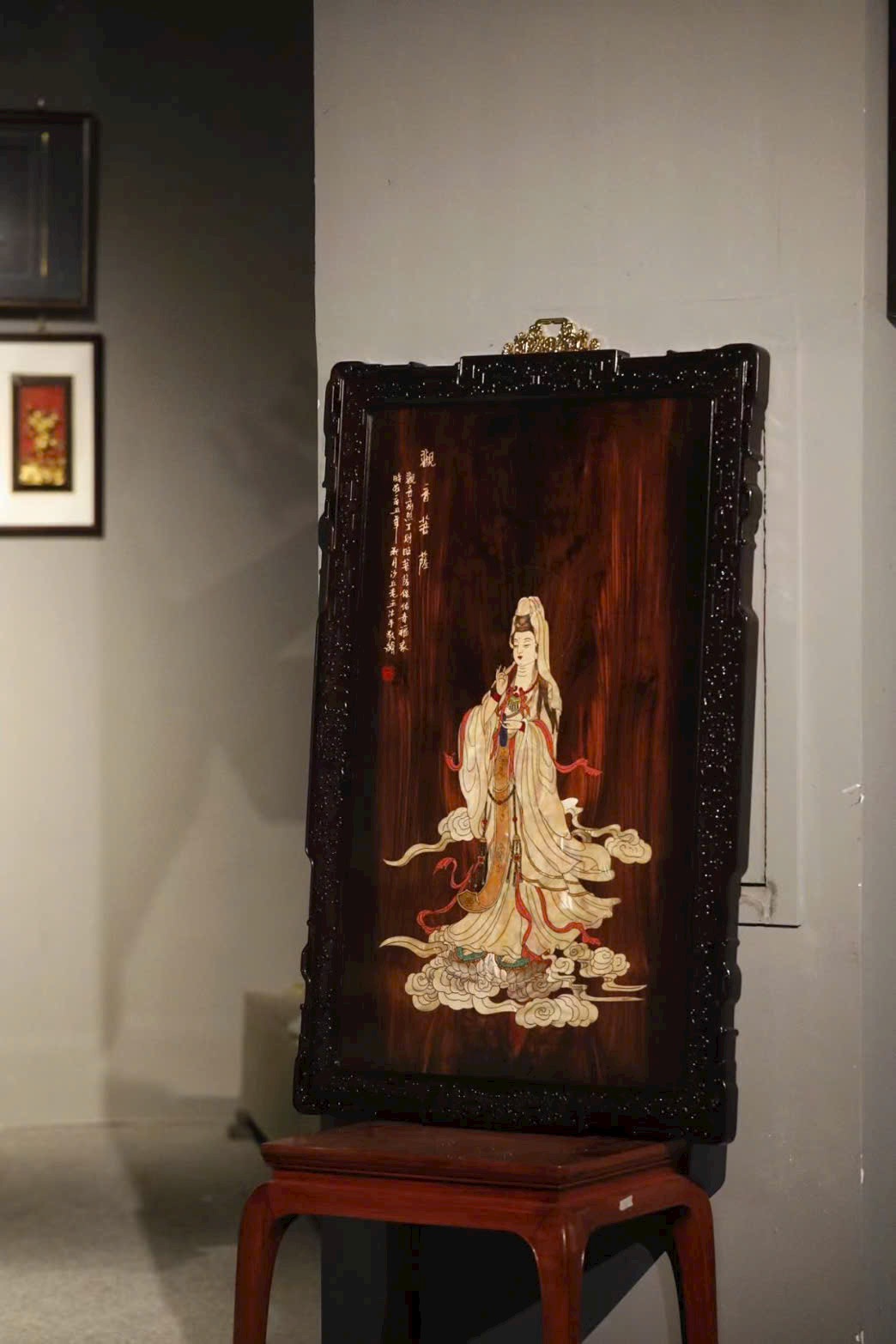 Quan Âm từ bi được khảm ốc tỉ mỉ, tà áo uyển chuyển, mây lành bay nhẹ. Khung gỗ tử đàn cổ kính, nền gỗ hồng sắc sâu – tôn vinh vẻ đẹp thủ công & tín ngưỡng phương Đông.