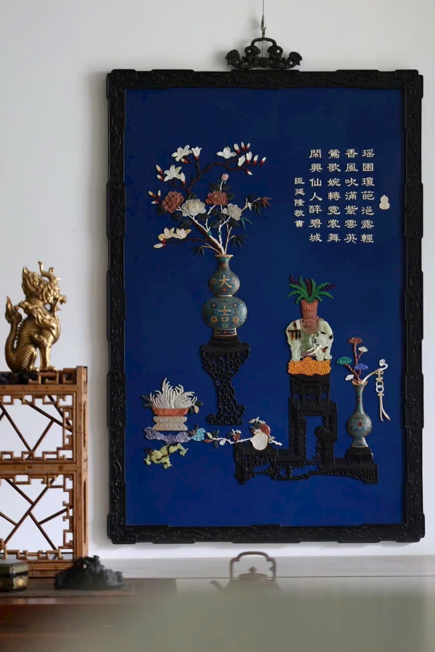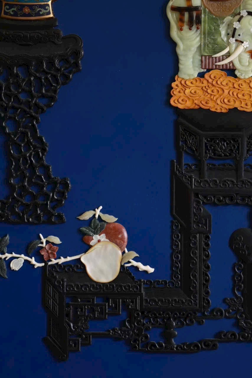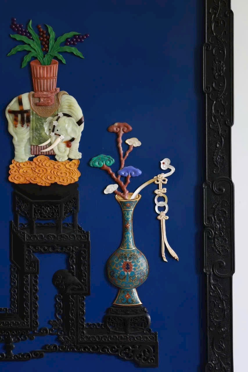 Khung làm từ gỗ tử đàn Zambia, nền tranh sơn mài, khảm họa tiết thanh nhã bằng đa dạng chất liệu quý: ngọc bích, mã não, ốc xà cừ, men châu… Họa tiết phong phú như “Tuế triêu bình an”, “Cát tường như ý”, tạo nên không khí thanh lịch, sinh động cho nội thất.