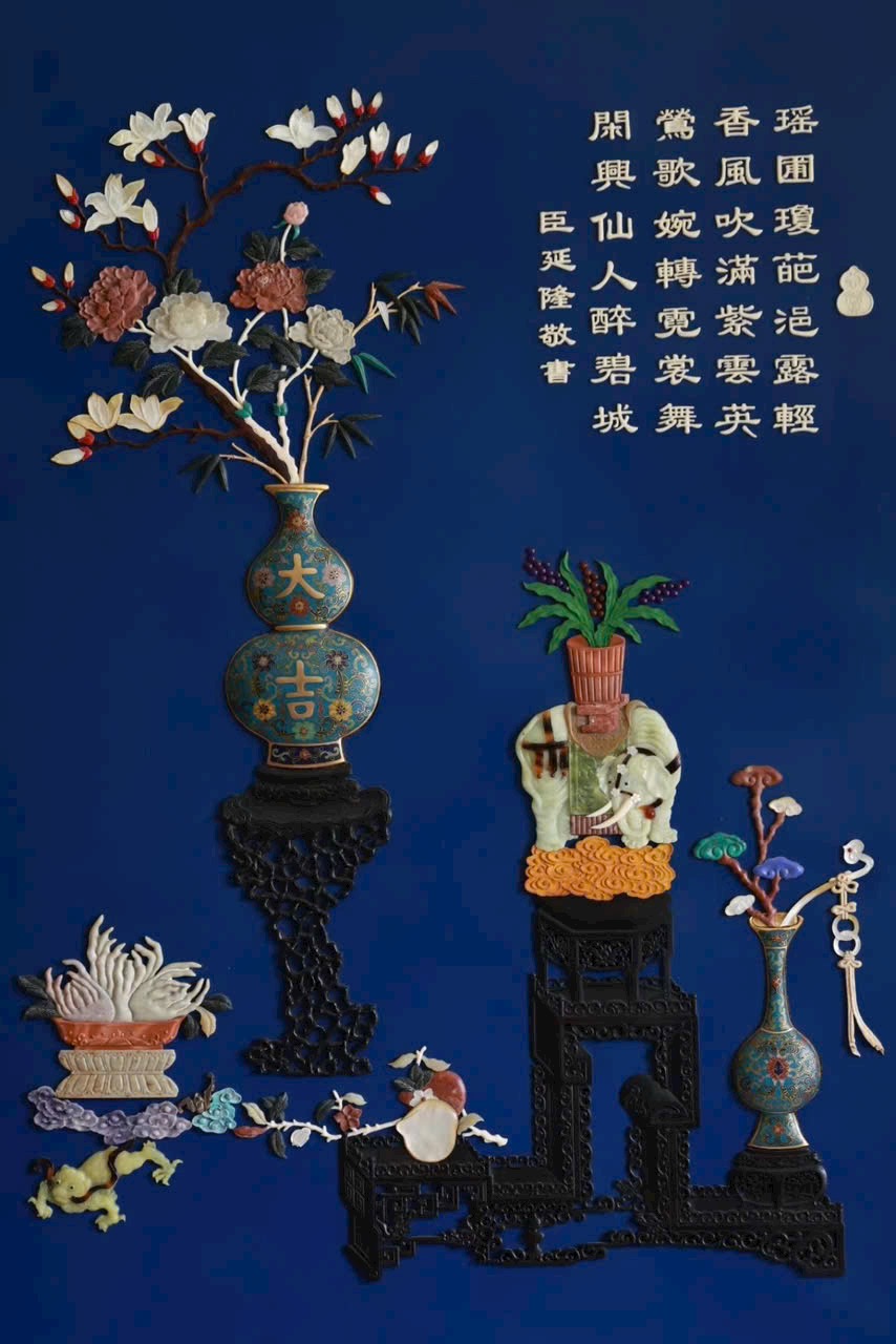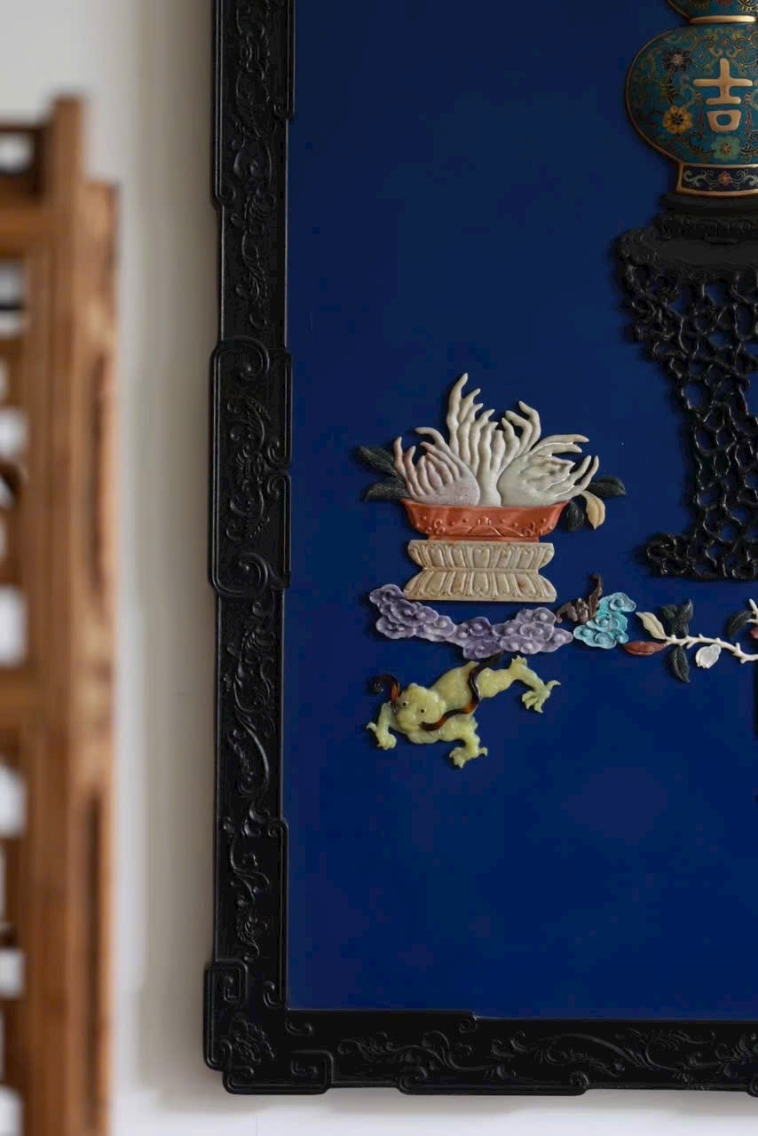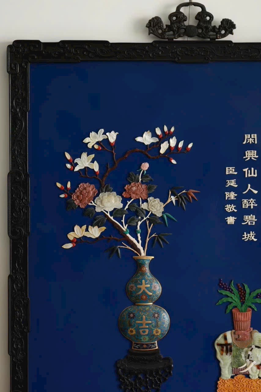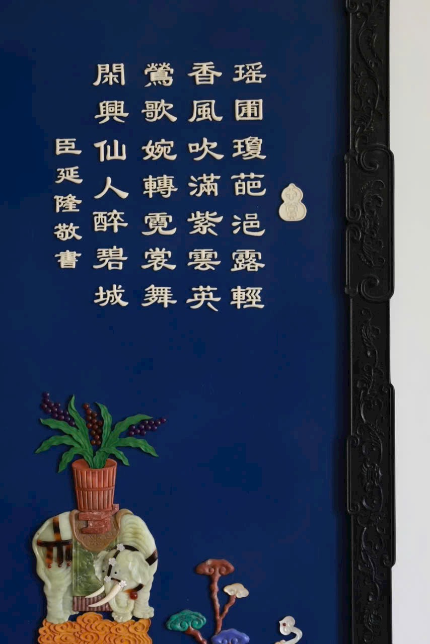 Khung làm từ gỗ tử đàn Zambia, nền tranh sơn mài, khảm họa tiết thanh nhã bằng đa dạng chất liệu quý: ngọc bích, mã não, ốc xà cừ, men châu… Họa tiết phong phú như “Tuế triêu bình an”, “Cát tường như ý”, tạo nên không khí thanh lịch, sinh động cho nội thất.