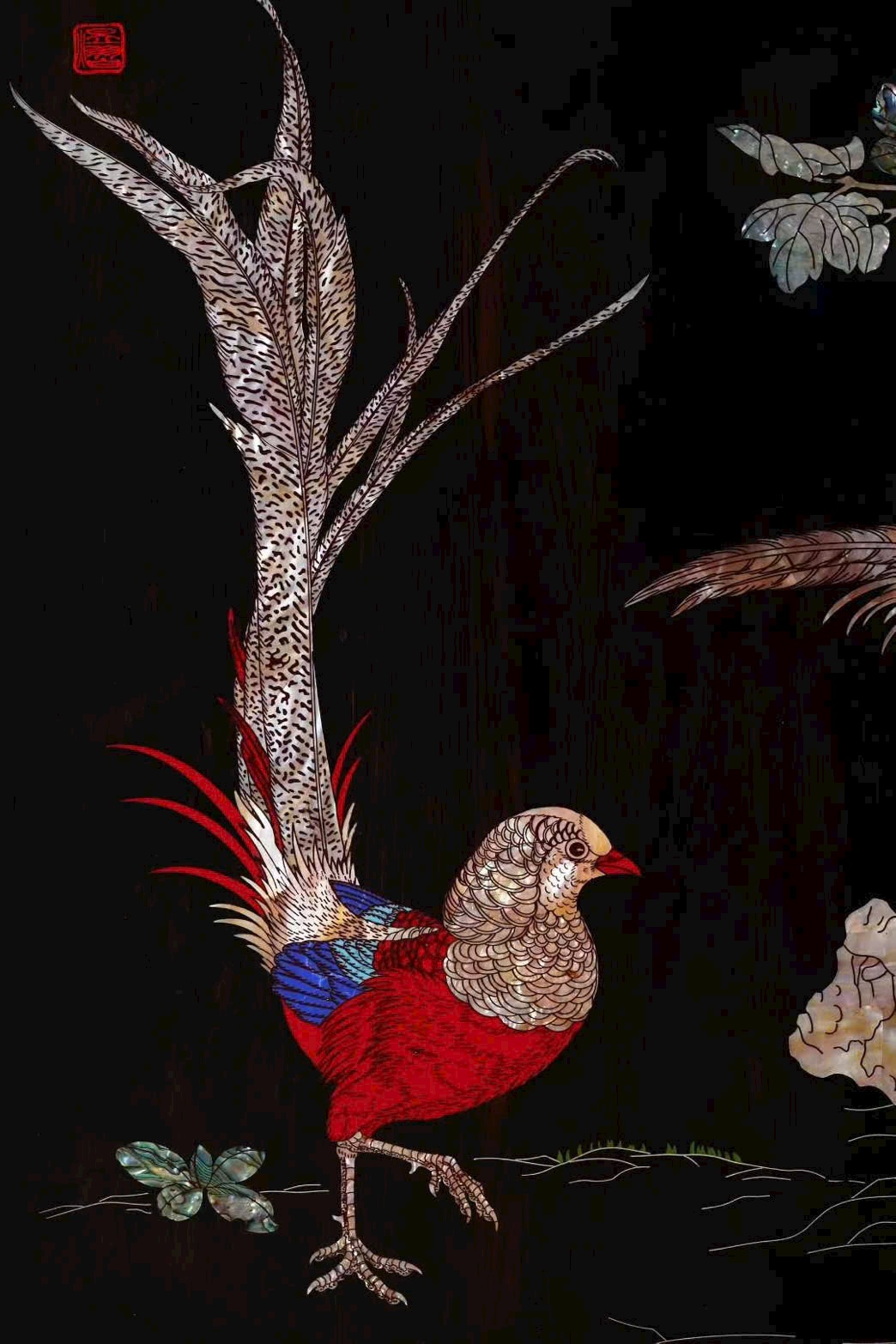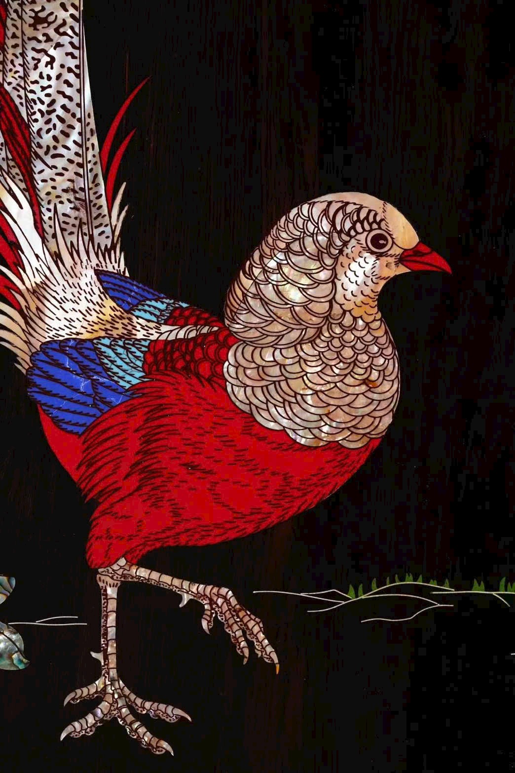 Gà cẩm với bộ lông rực rỡ tượng trưng đón cát tường, mẫu đơn mượn cành hoa hàm chứa phúc khí – phú quý, đúng nghĩa “gấm càng thêm hoa”, càng ngắm càng thấy quý.