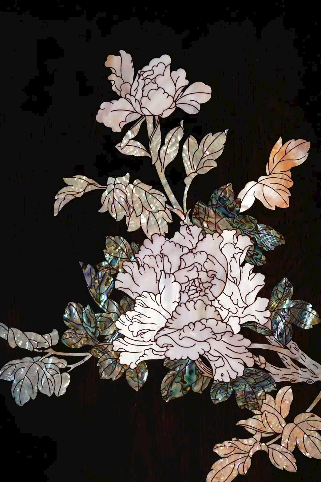 Phôi gỗ chọn tử quang đàn trăm năm tuổi, chất gỗ già dặn, sắc trầm sang. Xà cừ lấy từ vỏ trai biển sâu, trải qua 30 công đoạn mài lát – chạm khắc tinh vi, mới tạo nên khoảnh khắc rung cánh và hoa nở lung linh trong ánh sáng.