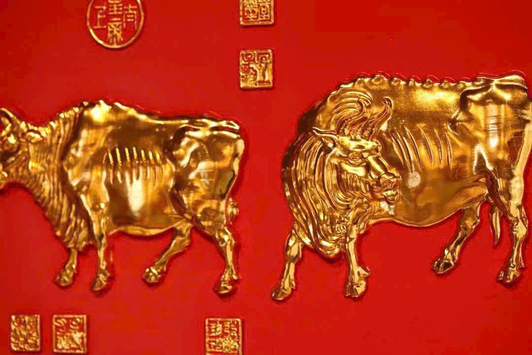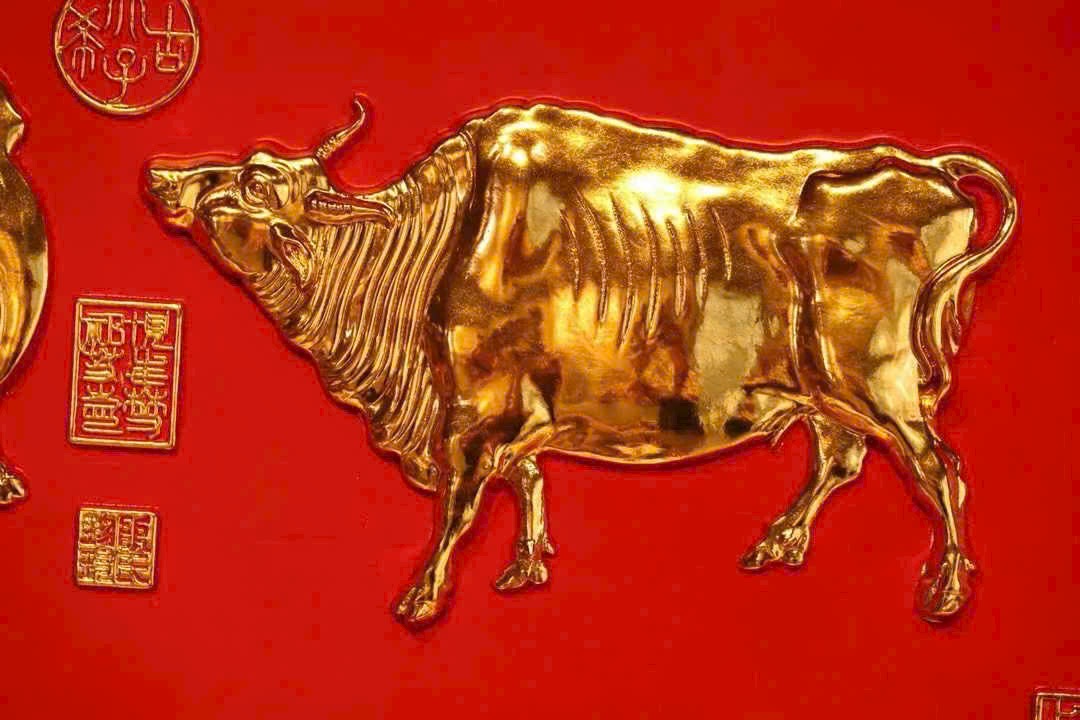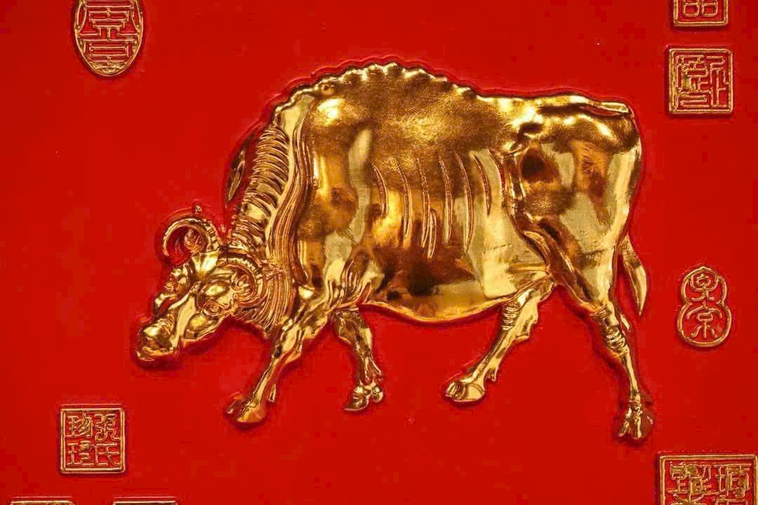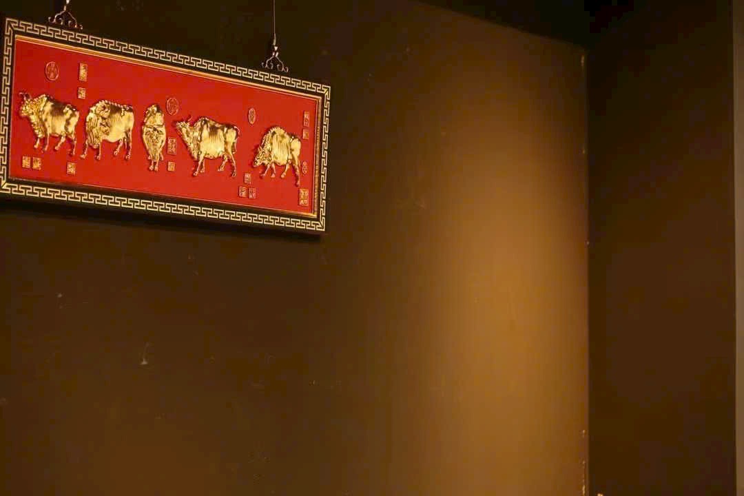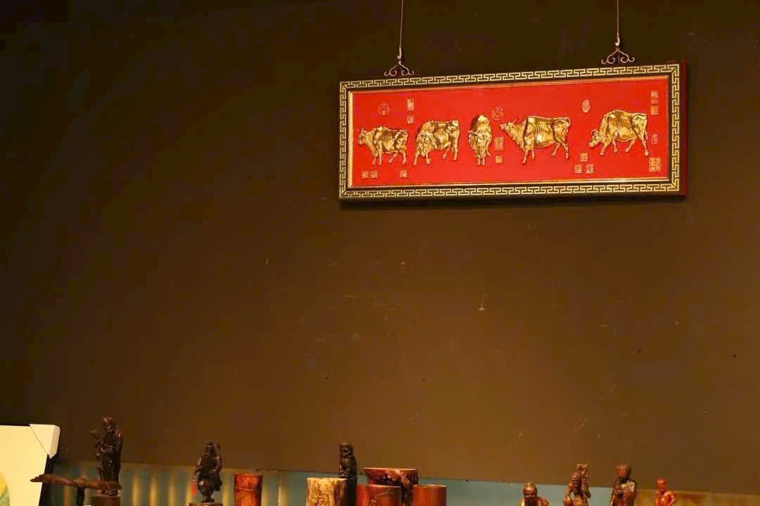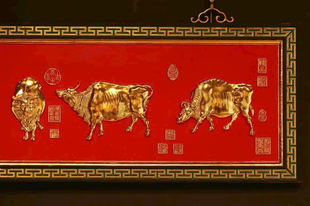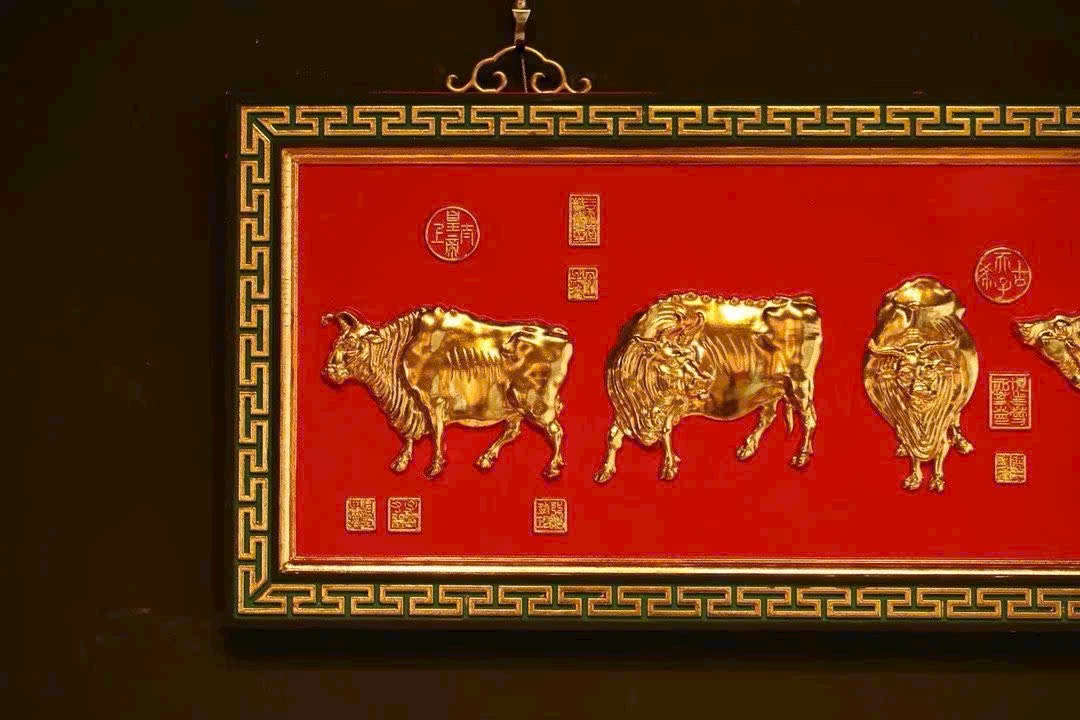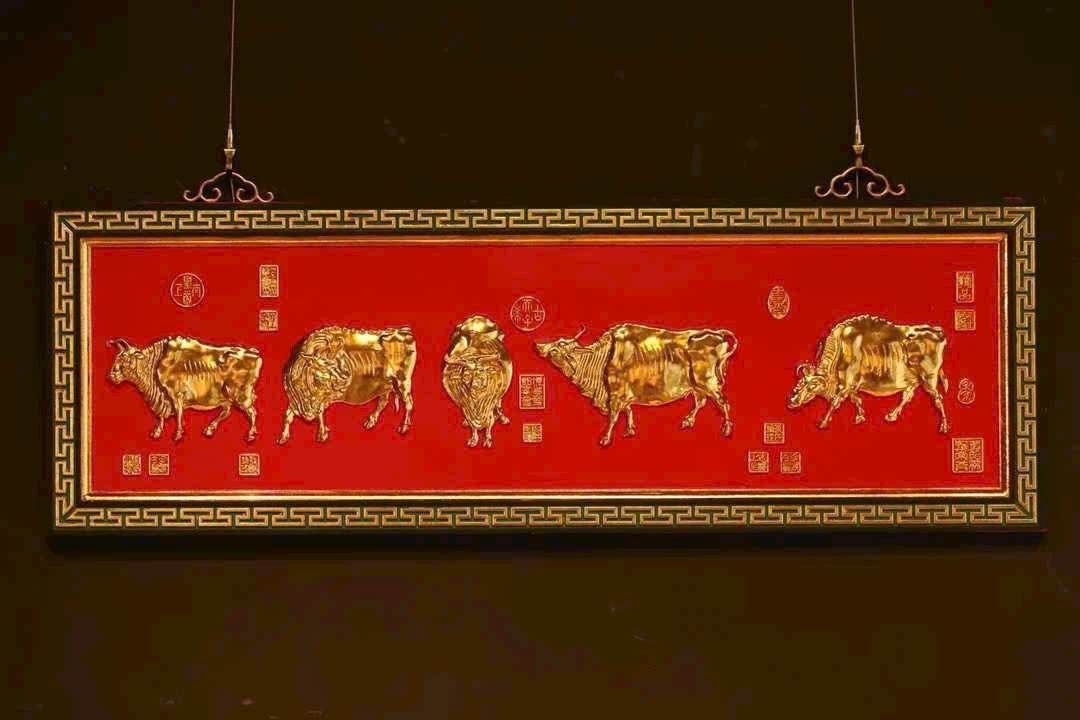 Lấy gỗ nam mộc làm nền, viền xung quanh chạm hoa văn hồi văn, phần trung tâm tinh khắc năm chú trâu, liền khối với tấm nền tạo thành tổng thể thống nhất. Bề mặt dát vàng thật, hiệu ứng nổi 3D rõ nét; nền sơn đỏ càng tăng vẻ trang trọng, hỷ khí.