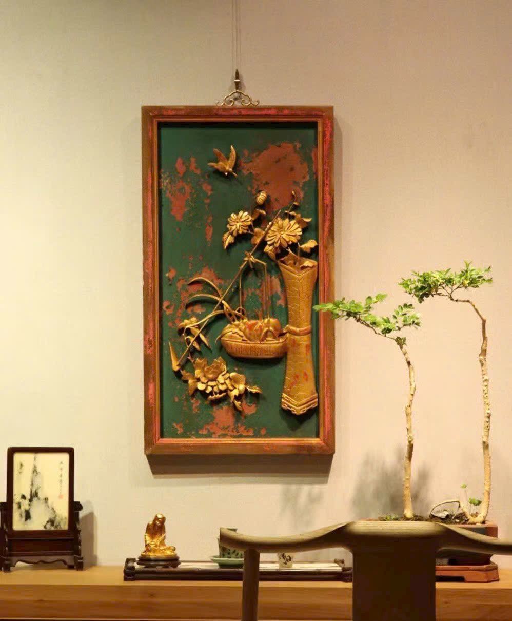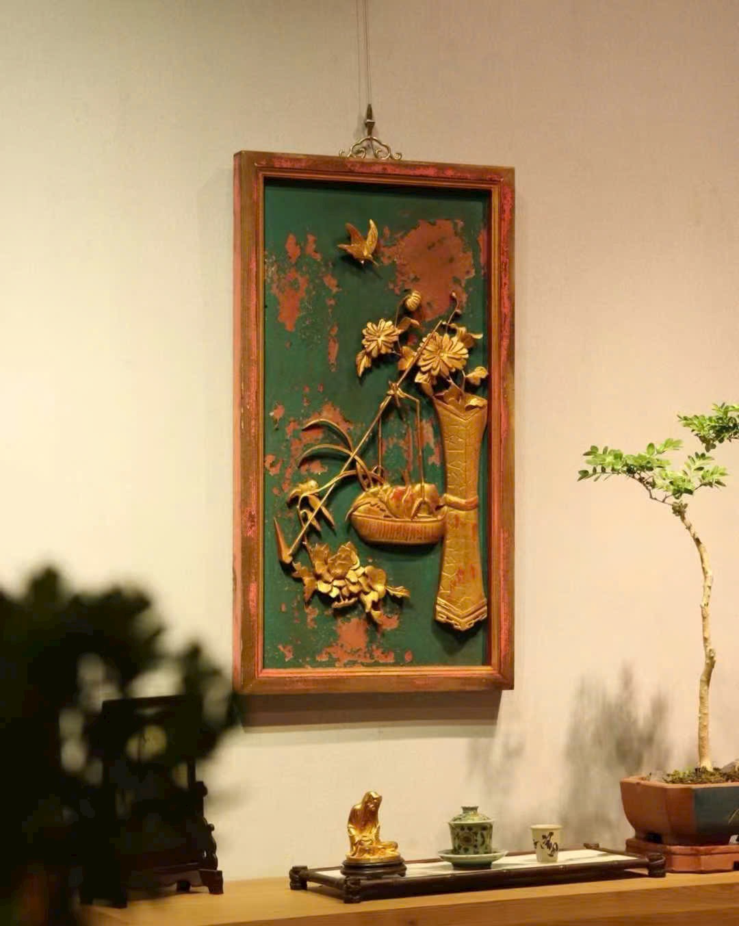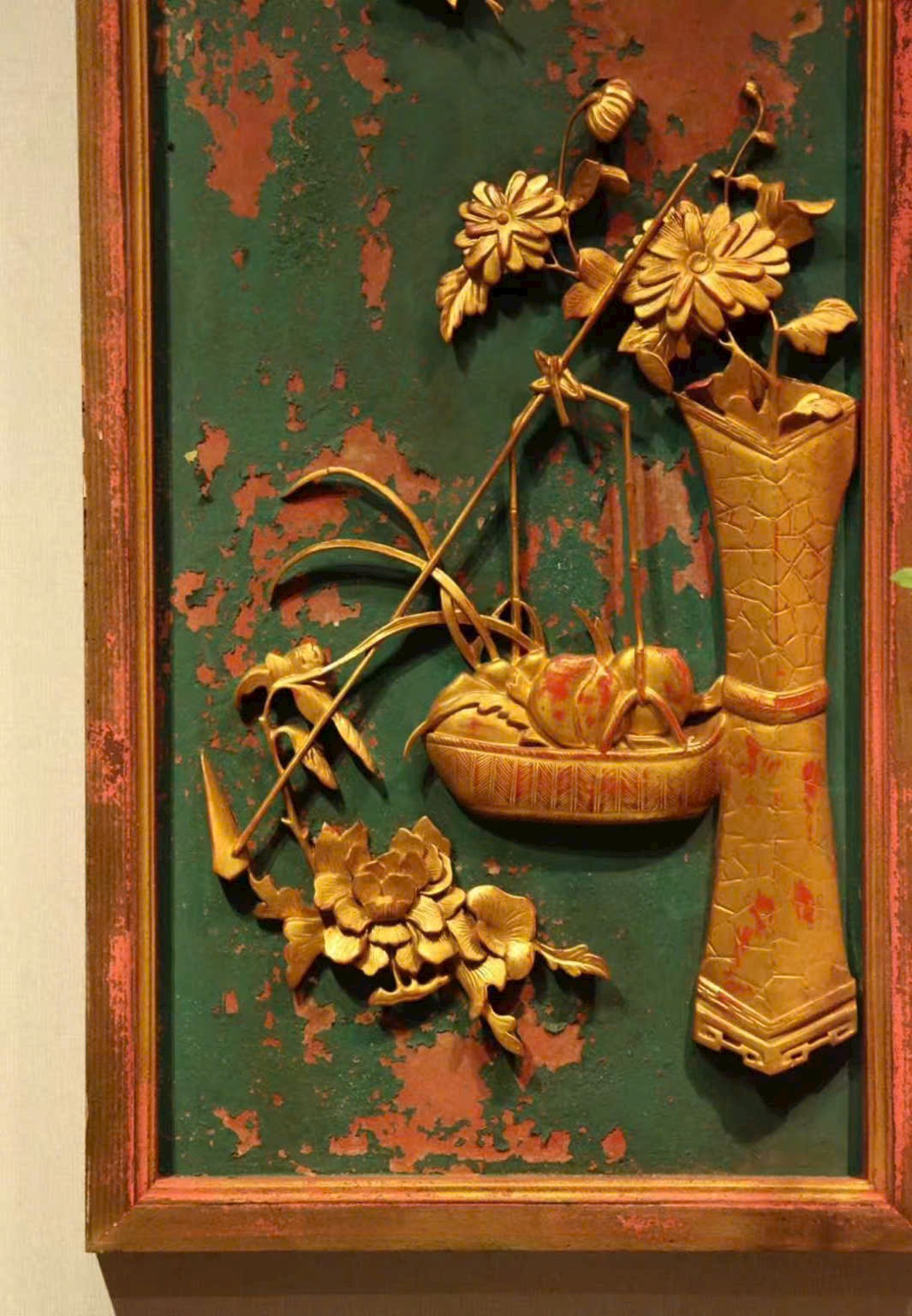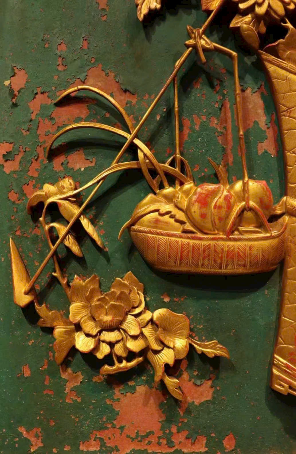 Khung ghép từ gỗ nam mộc cổ, chạm khắc lập thể sâu; kỹ pháp tinh xảo, đường dao lên xuống nhịp nhàng, tạo nên đồ án hoa khai phú quý. Bố cục kim – thủy đầy đặn, chim hỷ thước lượn bay trên cao, dáng vẻ uyển chuyển như đang cất tiếng hót; hoa mẫu đơn nở rộ phóng khoáng, đào tiên trong giỏ sống động như thật, tinh xảo đến từng chi tiết. Treo trong không gian nội thất, toát lên vẻ cổ phác nhã nhặn, tinh tế vô cùng.