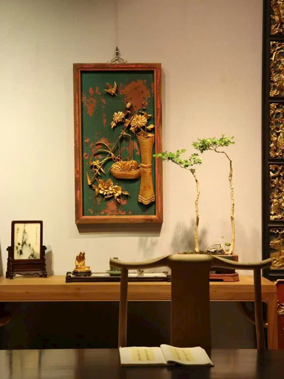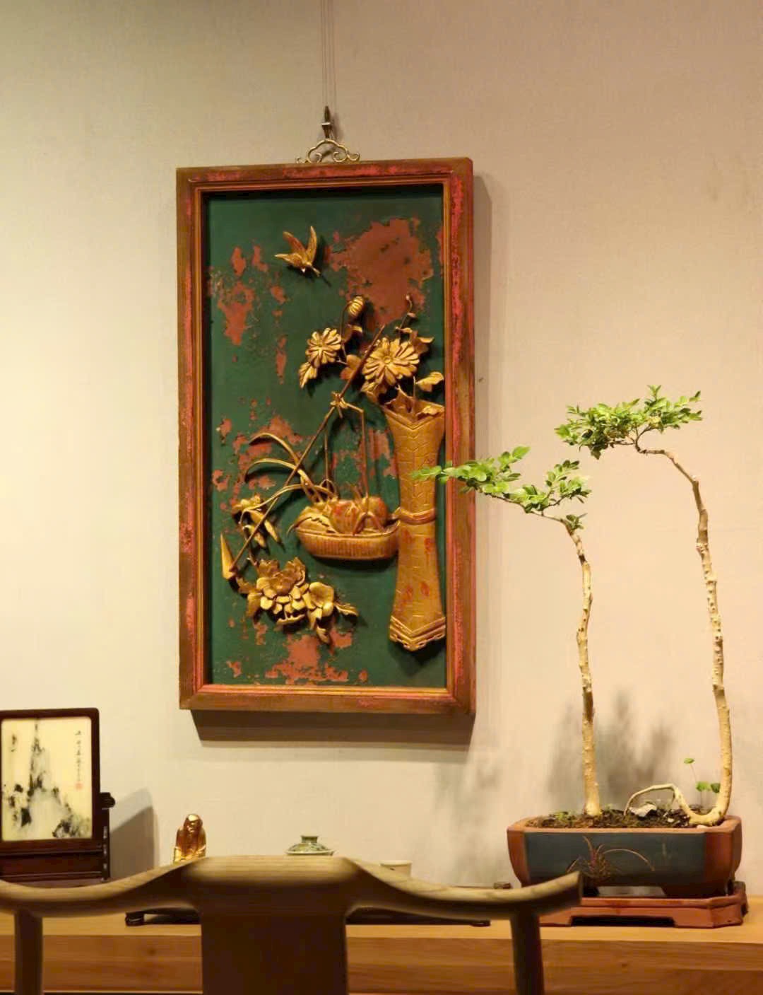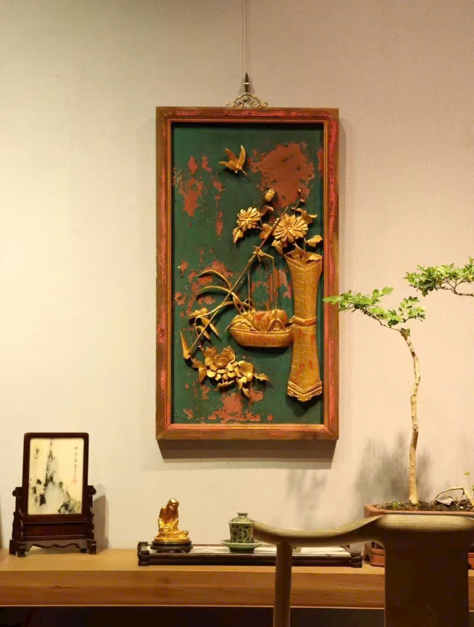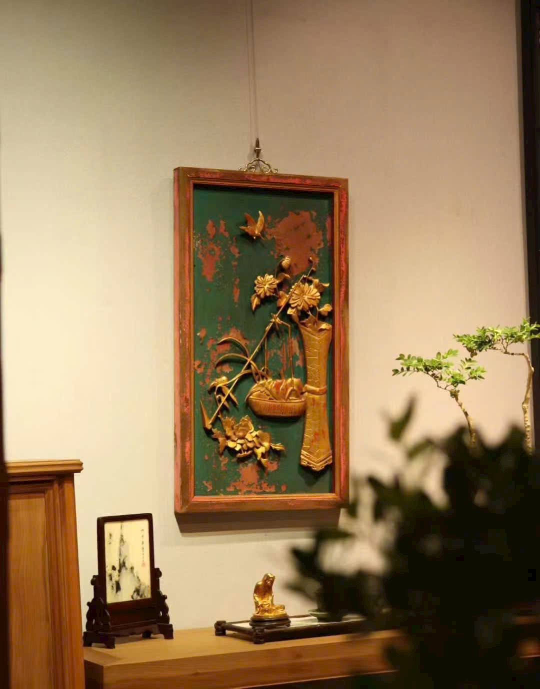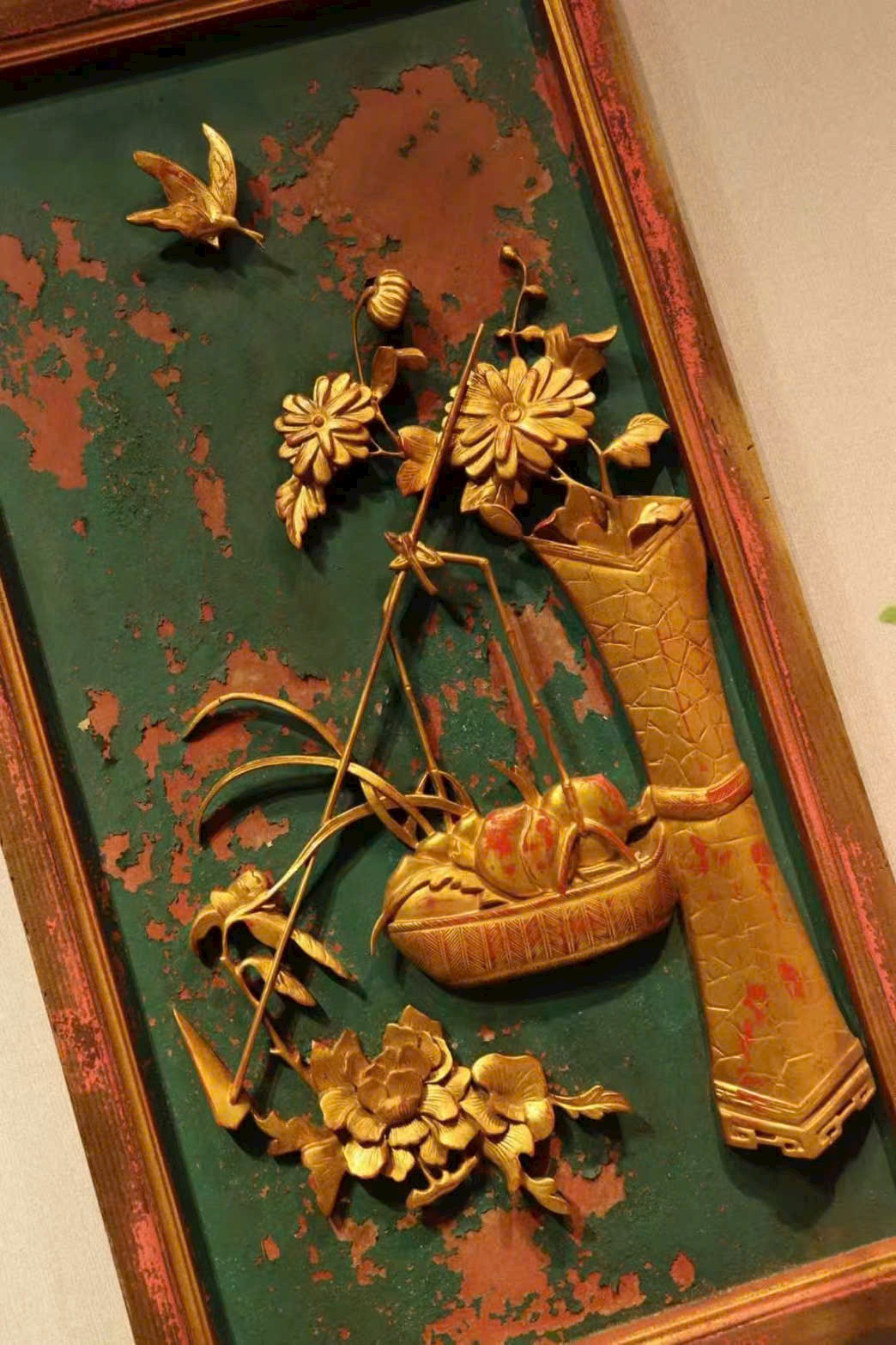 Khung ghép từ gỗ nam mộc cổ, chạm khắc lập thể sâu; kỹ pháp tinh xảo, đường dao lên xuống nhịp nhàng, tạo nên đồ án hoa khai phú quý. Bố cục kim – thủy đầy đặn, chim hỷ thước lượn bay trên cao, dáng vẻ uyển chuyển như đang cất tiếng hót; hoa mẫu đơn nở rộ phóng khoáng, đào tiên trong giỏ sống động như thật, tinh xảo đến từng chi tiết. Treo trong không gian nội thất, toát lên vẻ cổ phác nhã nhặn, tinh tế vô cùng.