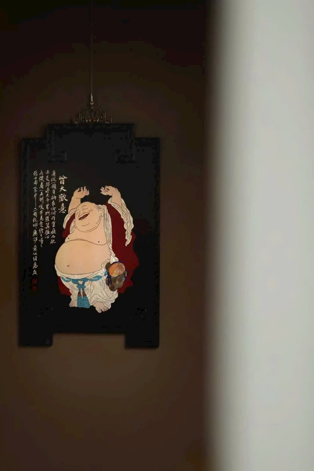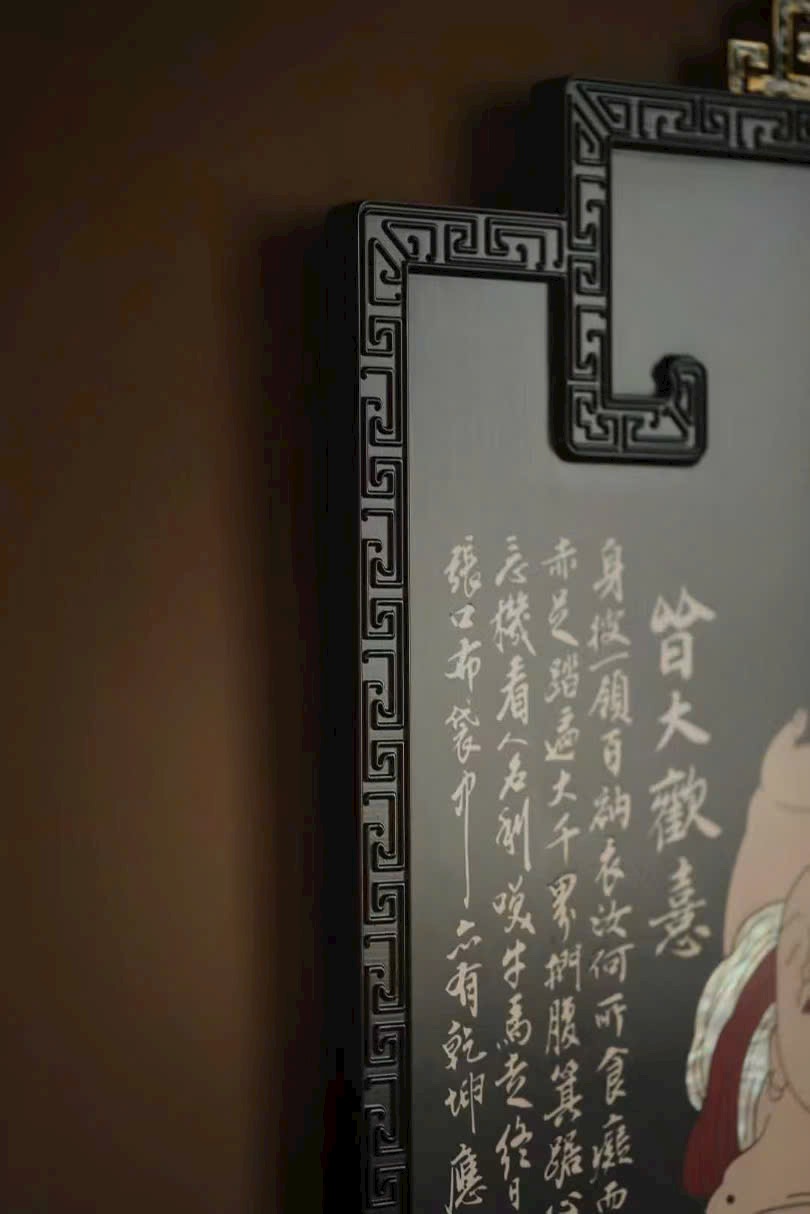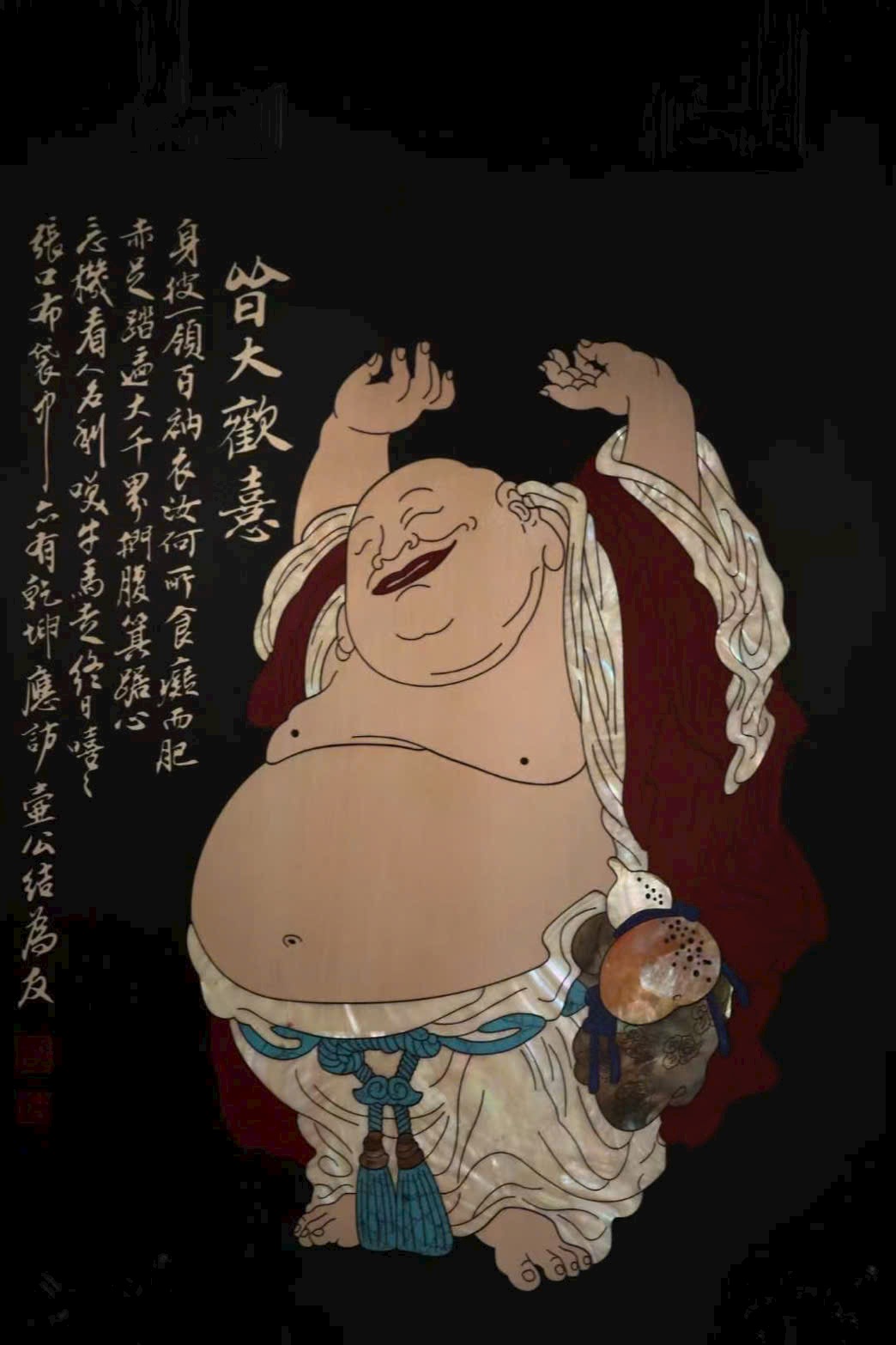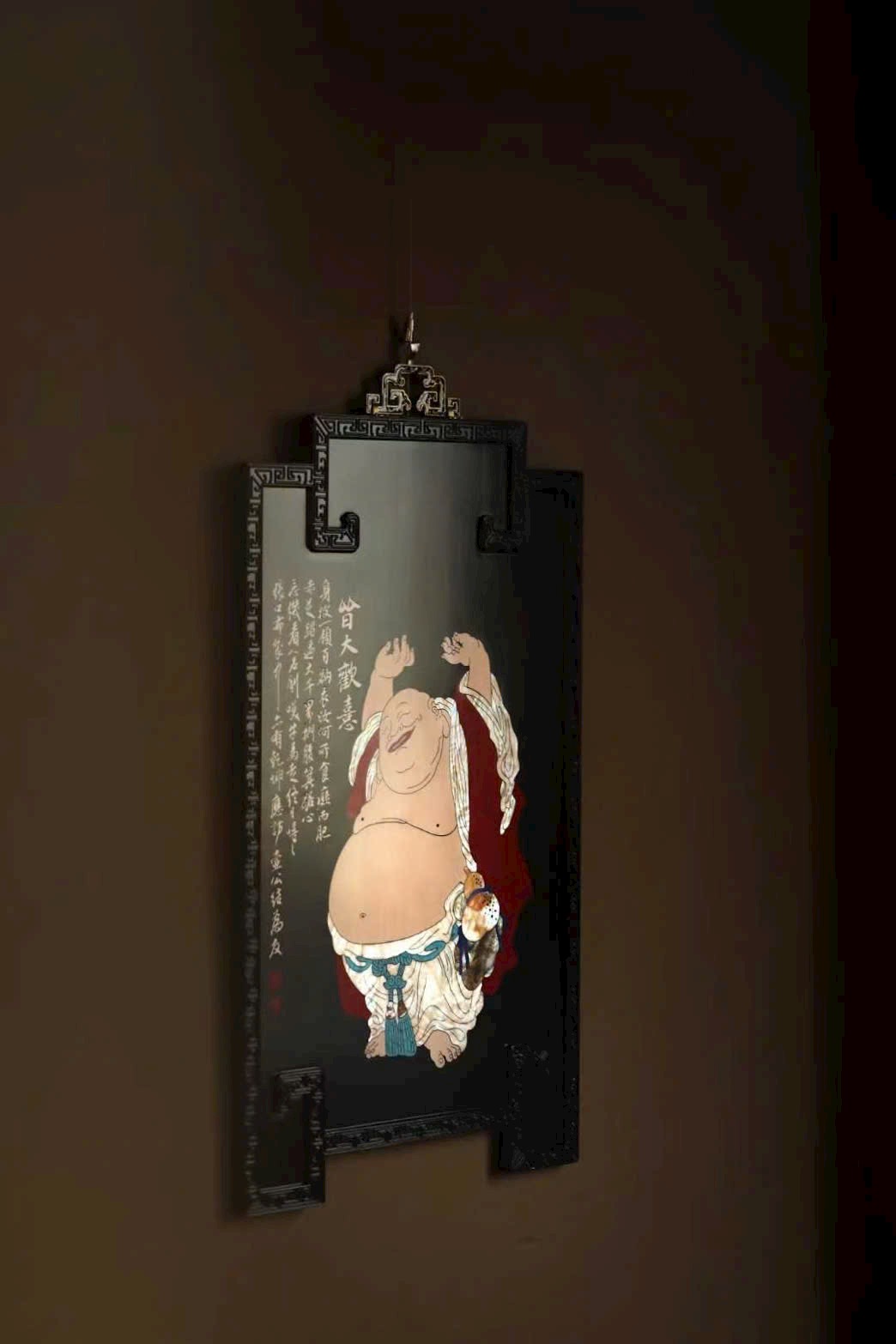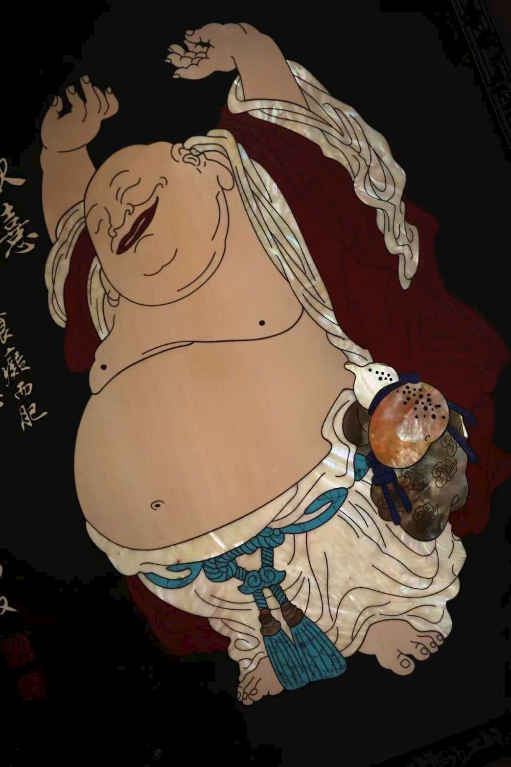 Thiết kế bằng gỗ Trắc khảm trai, khổ 50 × 80 × 3 cm; một nét đỏ tươi nổi bật làm nền cho nụ cười rạng rỡ của Phật Di Lặc, bụng lớn chứa chan niềm vui thế gian.