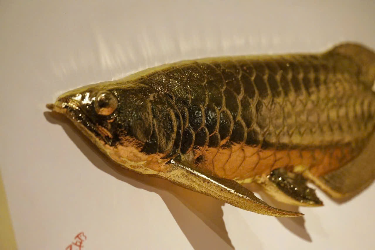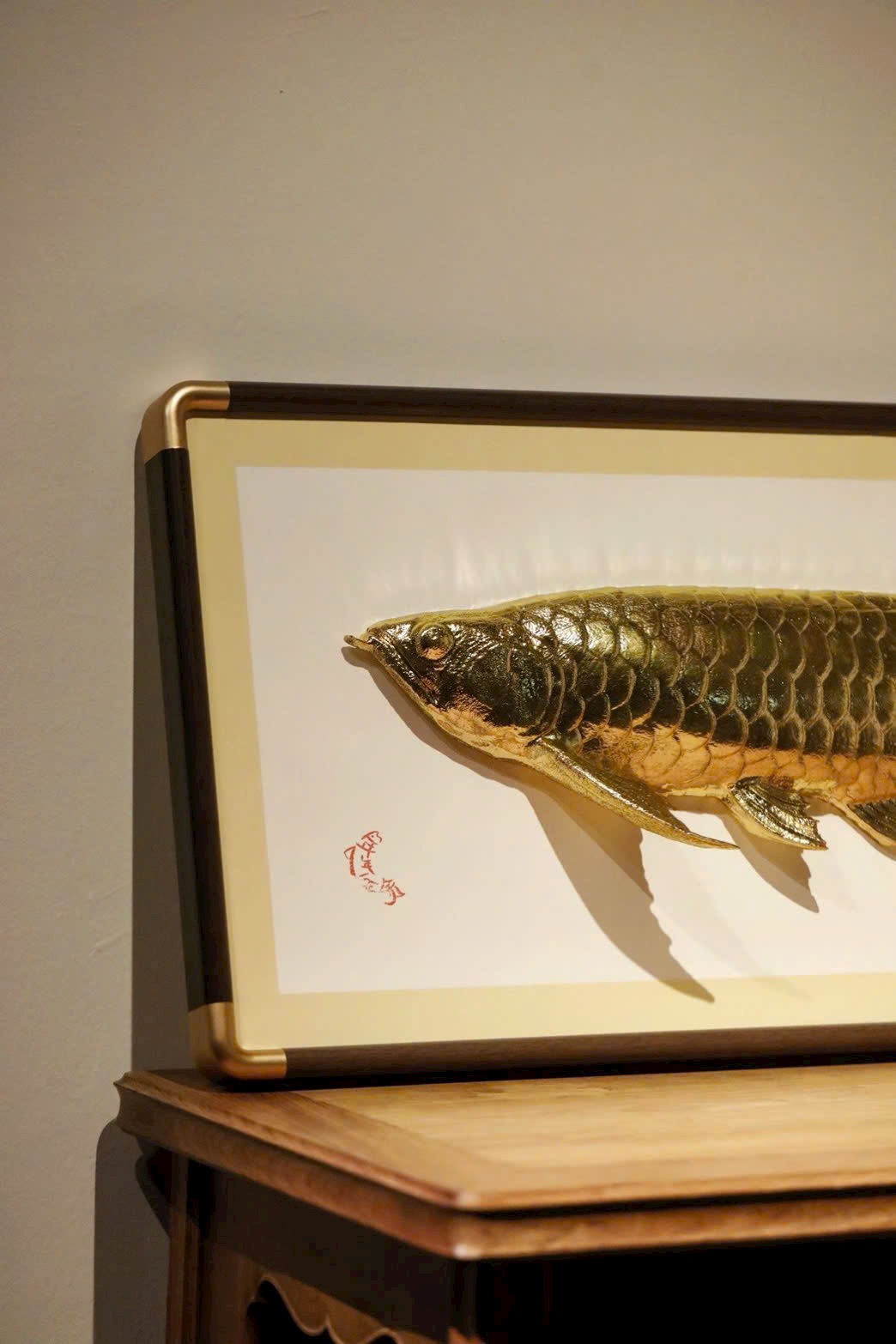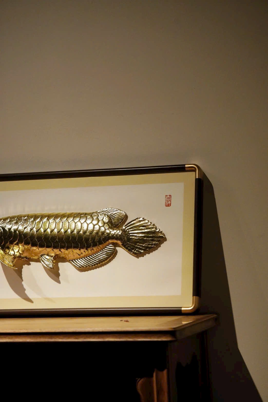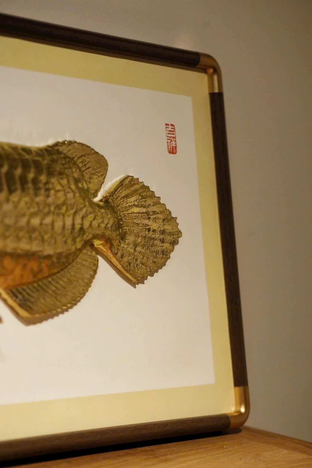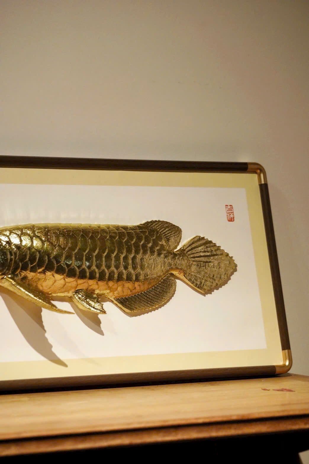 Lấy gỗ long não làm nền, phủ vàng thật để tạo vảy; toàn bộ tranh treo lấy hình tượng cá rồng vàng.