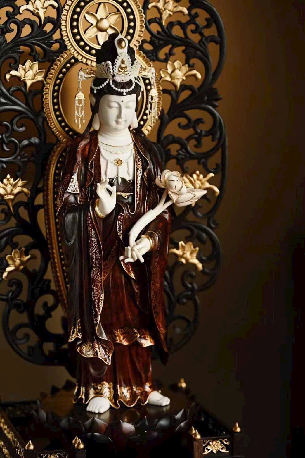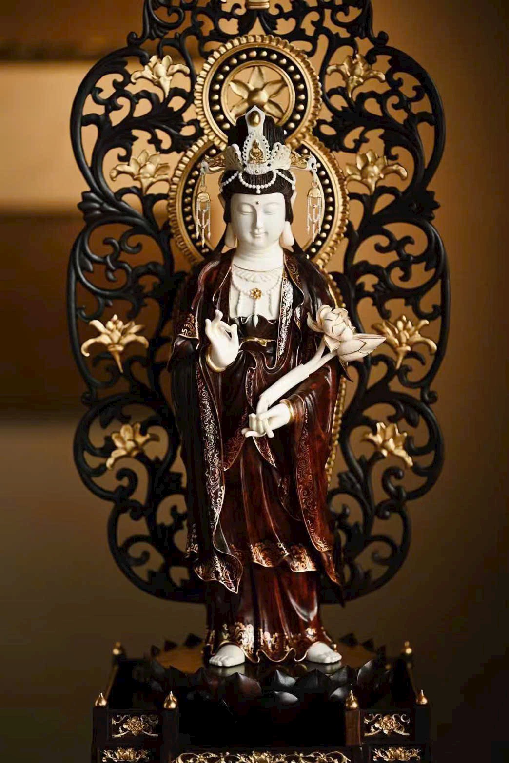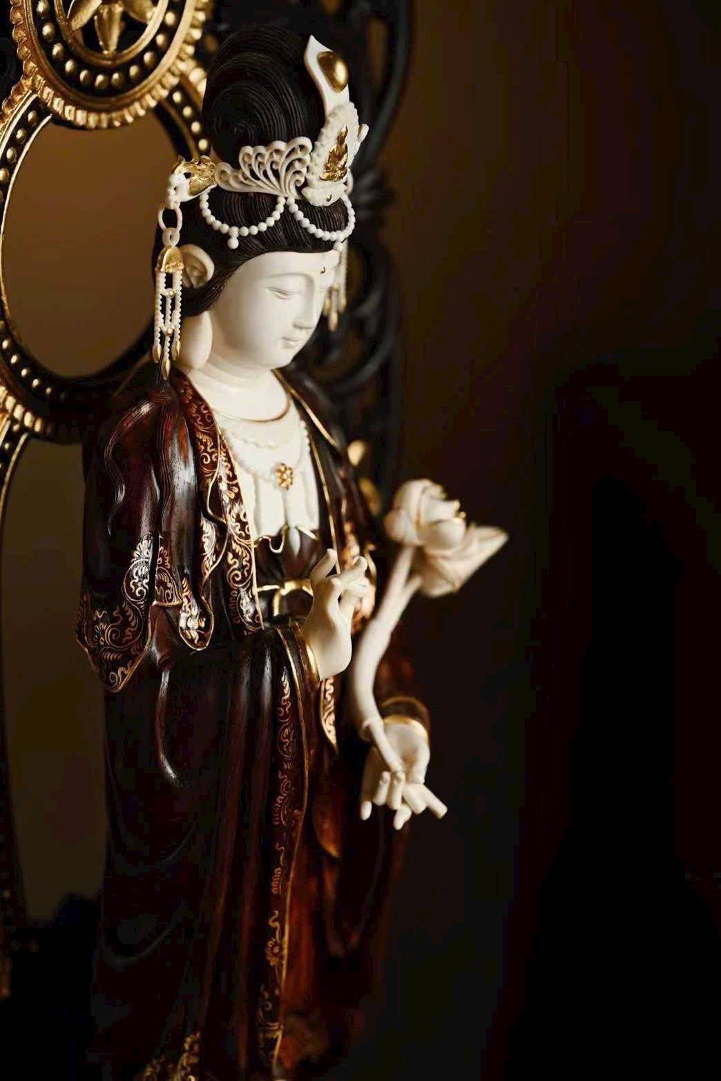 Tượng tạc trang nghiêm, Bồ Tát tĩnh đứng trên tòa sen, bảo quan vấn tóc, mày mắt thanh tú, dung nhan viên mãn. Vai phủ dải lụa mềm mại, tà váy và dải y buông rủ uyển chuyển tự nhiên. Bồ Tát tay nâng đóa sen hé nở, thân thái yểu điệu thanh nhã, điểm vẽ kim tuyến rực rỡ, biểu tướng cát tường thù thắng.