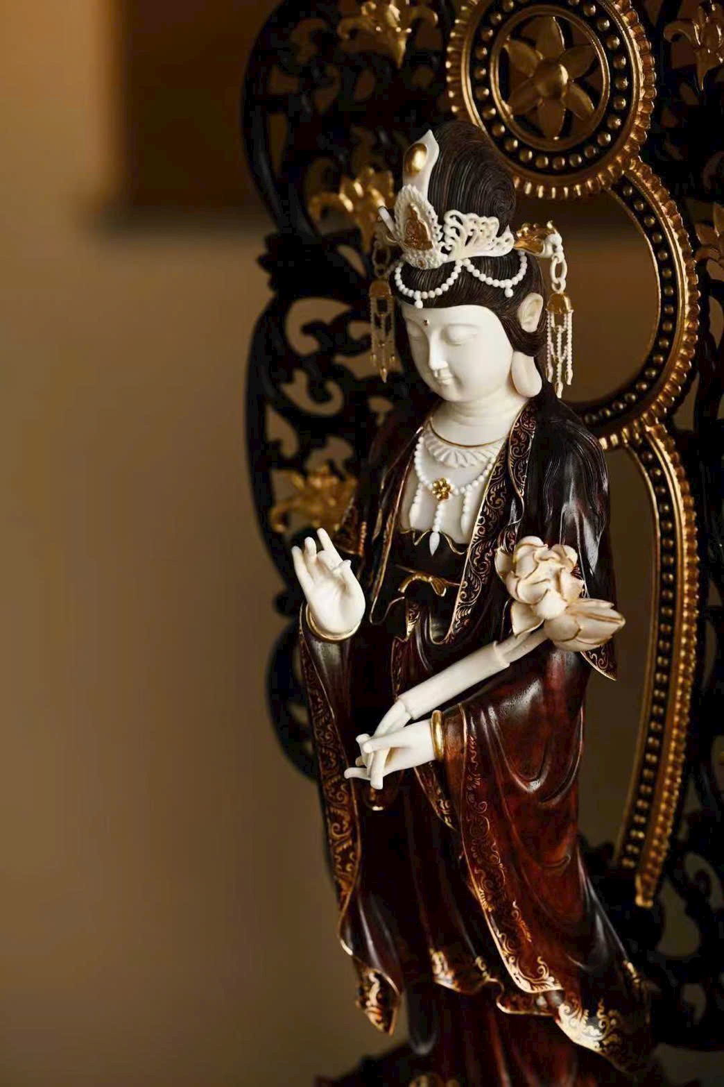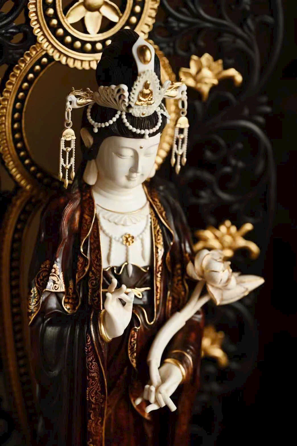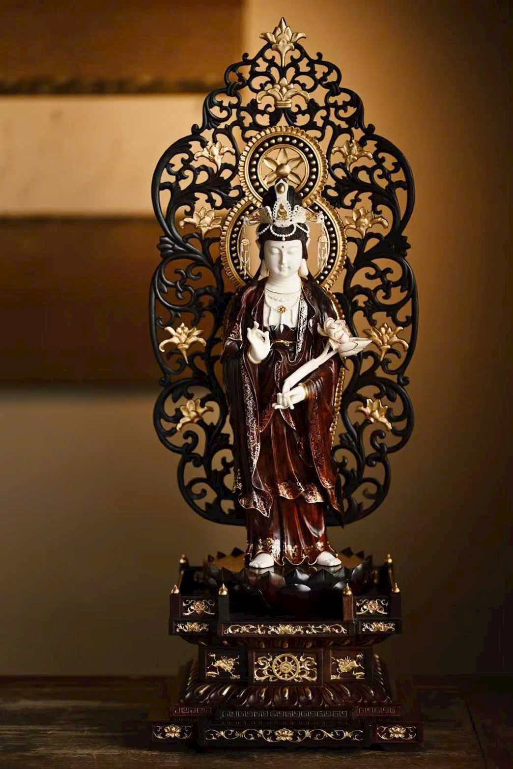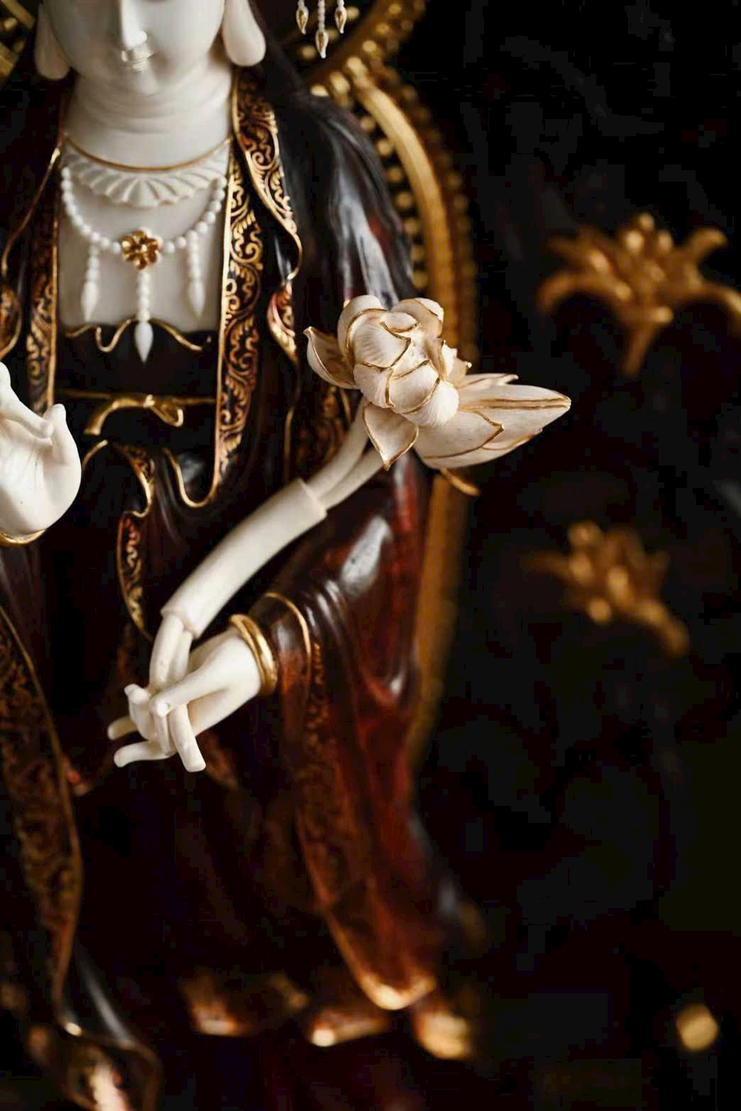 Tượng tạc trang nghiêm, Bồ Tát tĩnh đứng trên tòa sen, bảo quan vấn tóc, mày mắt thanh tú, dung nhan viên mãn. Vai phủ dải lụa mềm mại, tà váy và dải y buông rủ uyển chuyển tự nhiên. Bồ Tát tay nâng đóa sen hé nở, thân thái yểu điệu thanh nhã, điểm vẽ kim tuyến rực rỡ, biểu tướng cát tường thù thắng.
