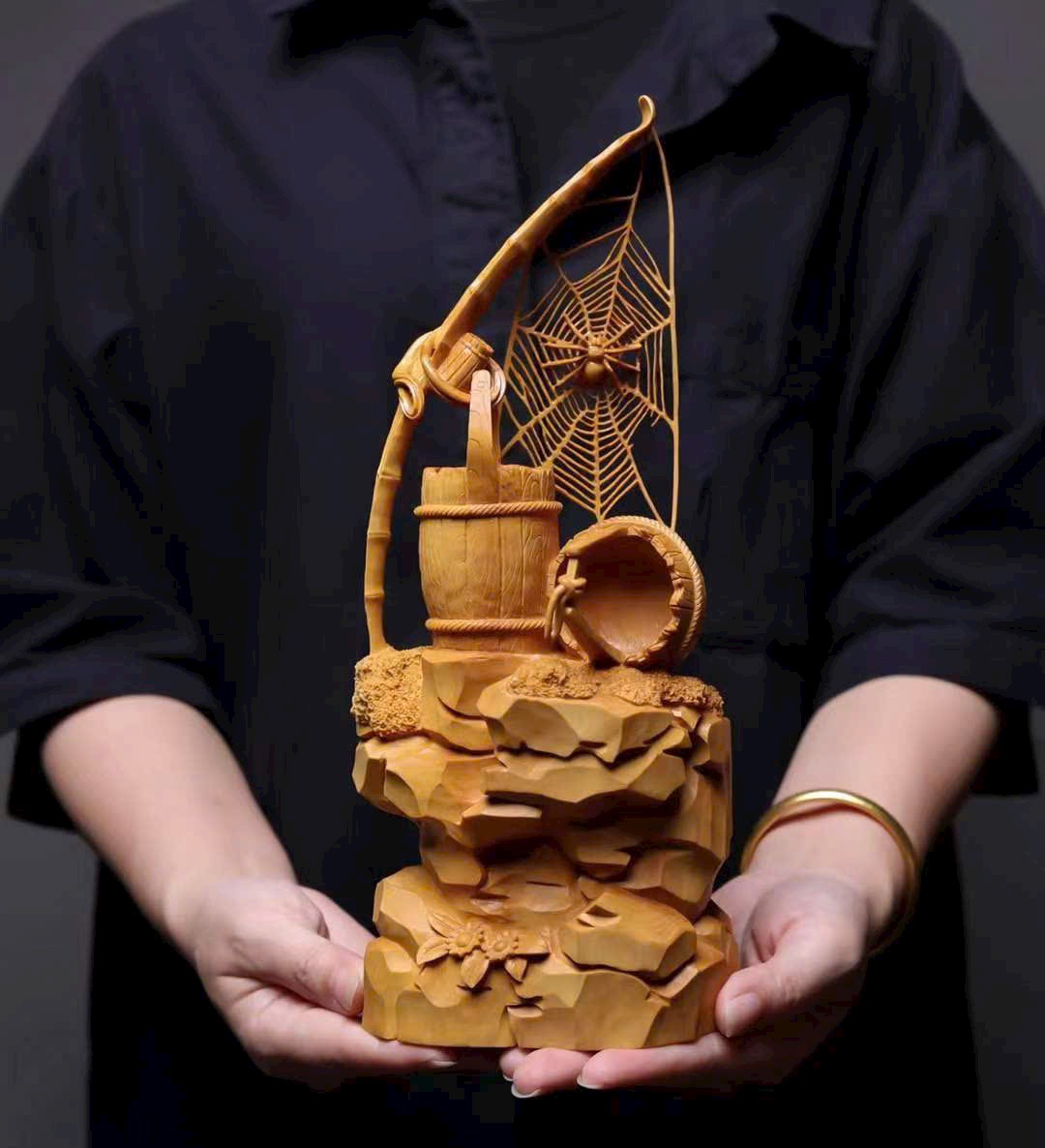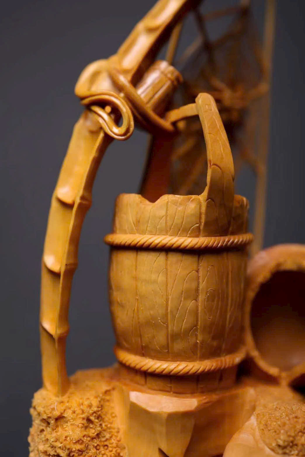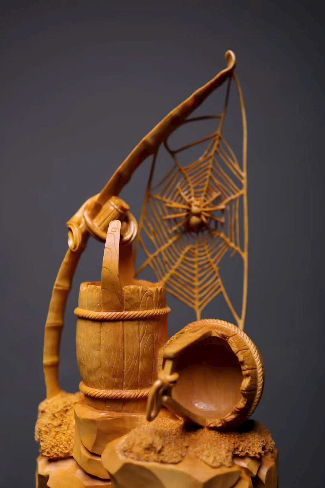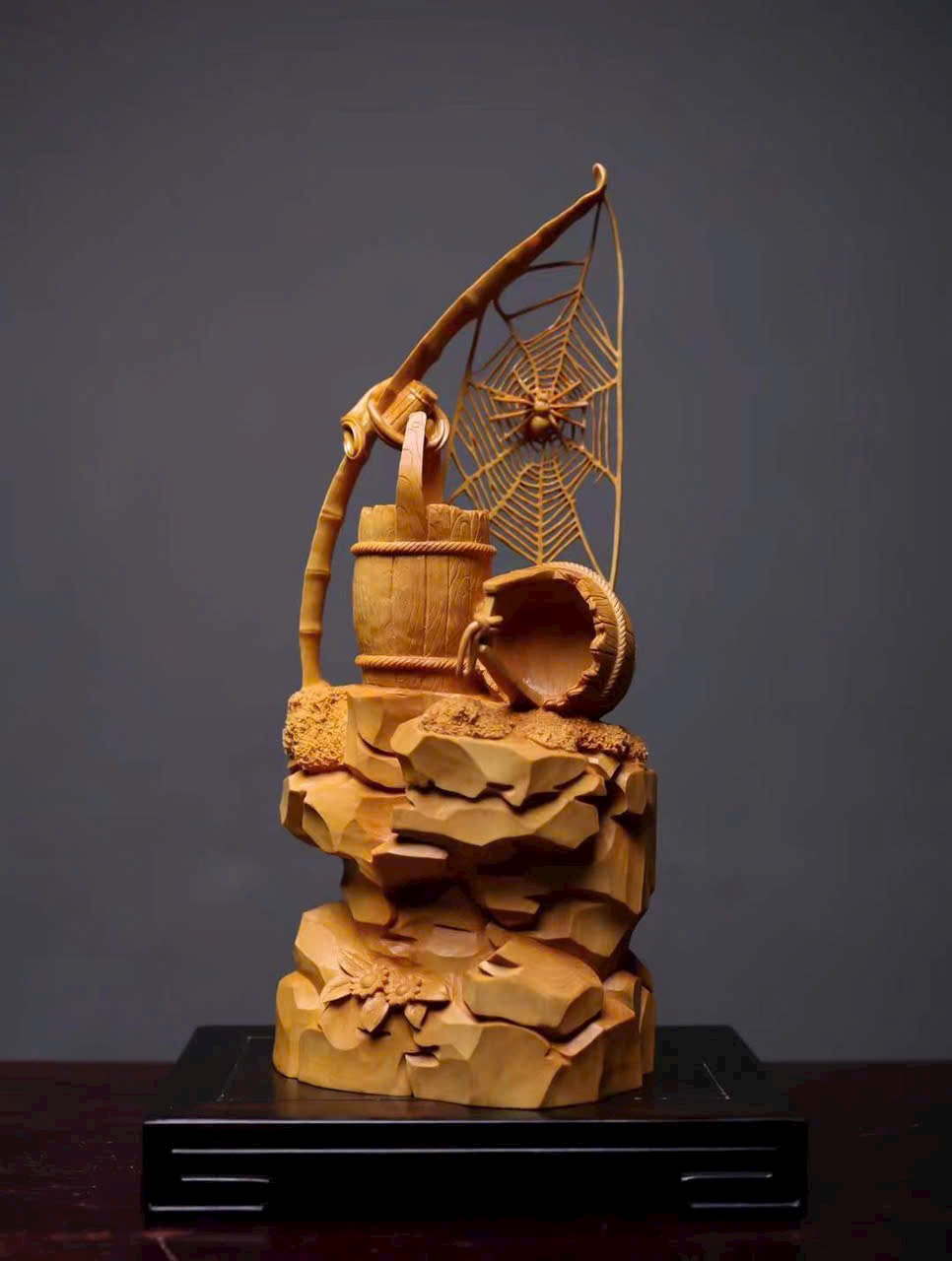 Mạng nhện đan xen rõ nét, kết cấu vân gỗ như thùng gỗ sống động, giỏ trúc được khắc chạm tinh tế. Tất cả cùng tựa trên khối đá núi tầng tầng lớp lớp, hiểm trở tự nhiên. Tác phẩm khéo léo dung hòa giữa vật dụng đời thường và yếu tố thiên nhiên, khắc họa nên bức tranh mộc mạc mà đầy tinh ý — là sự diễn giải sinh động của nghệ thuật điêu khắc gỗ truyền thống về triết lý nhân sinh và ý nghĩa cát tường.