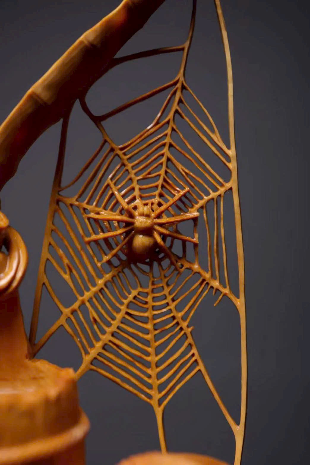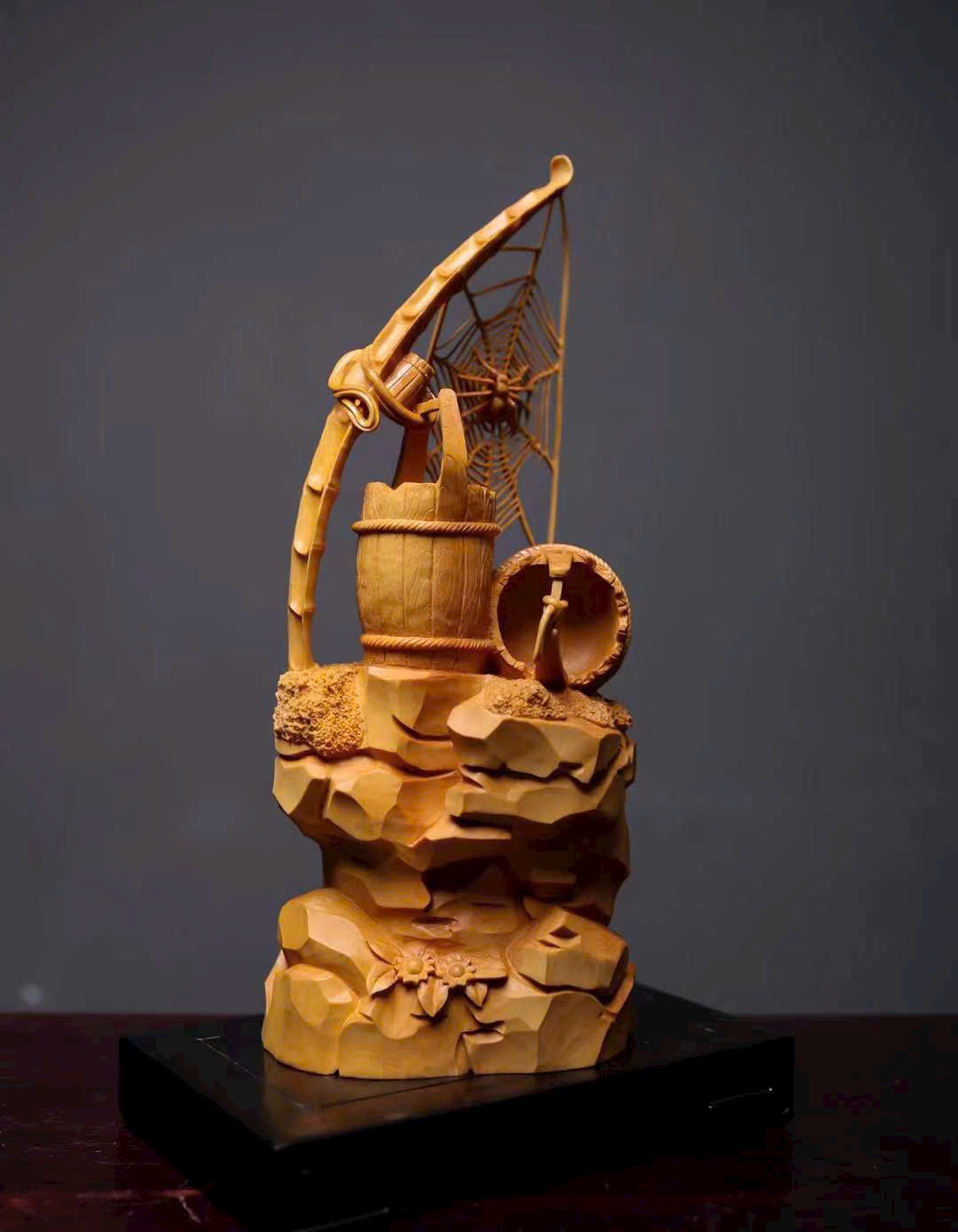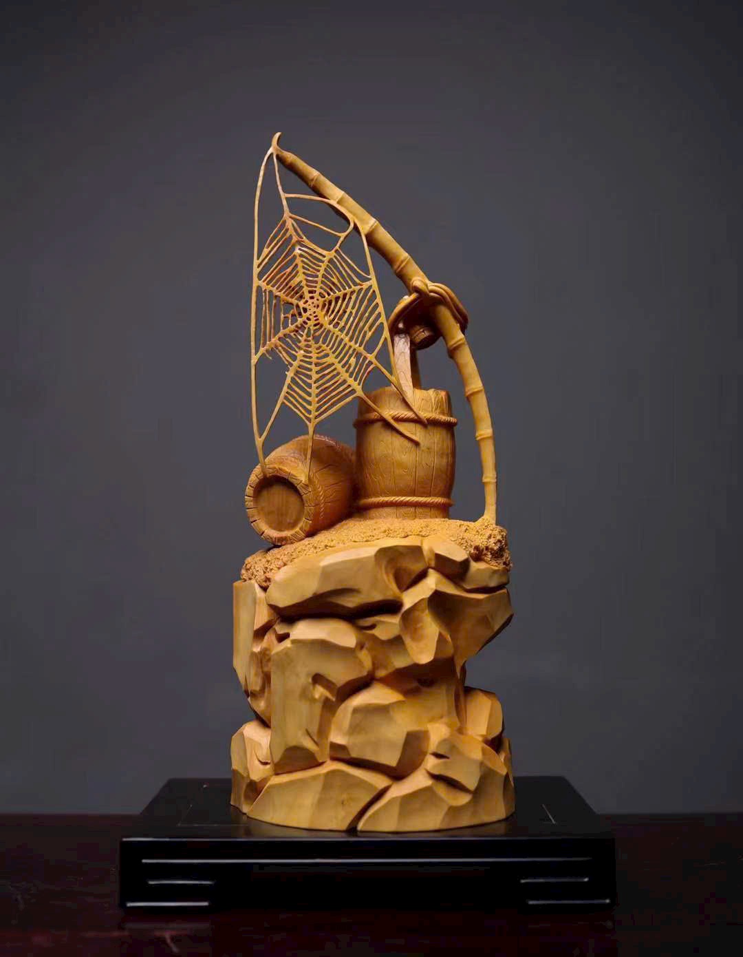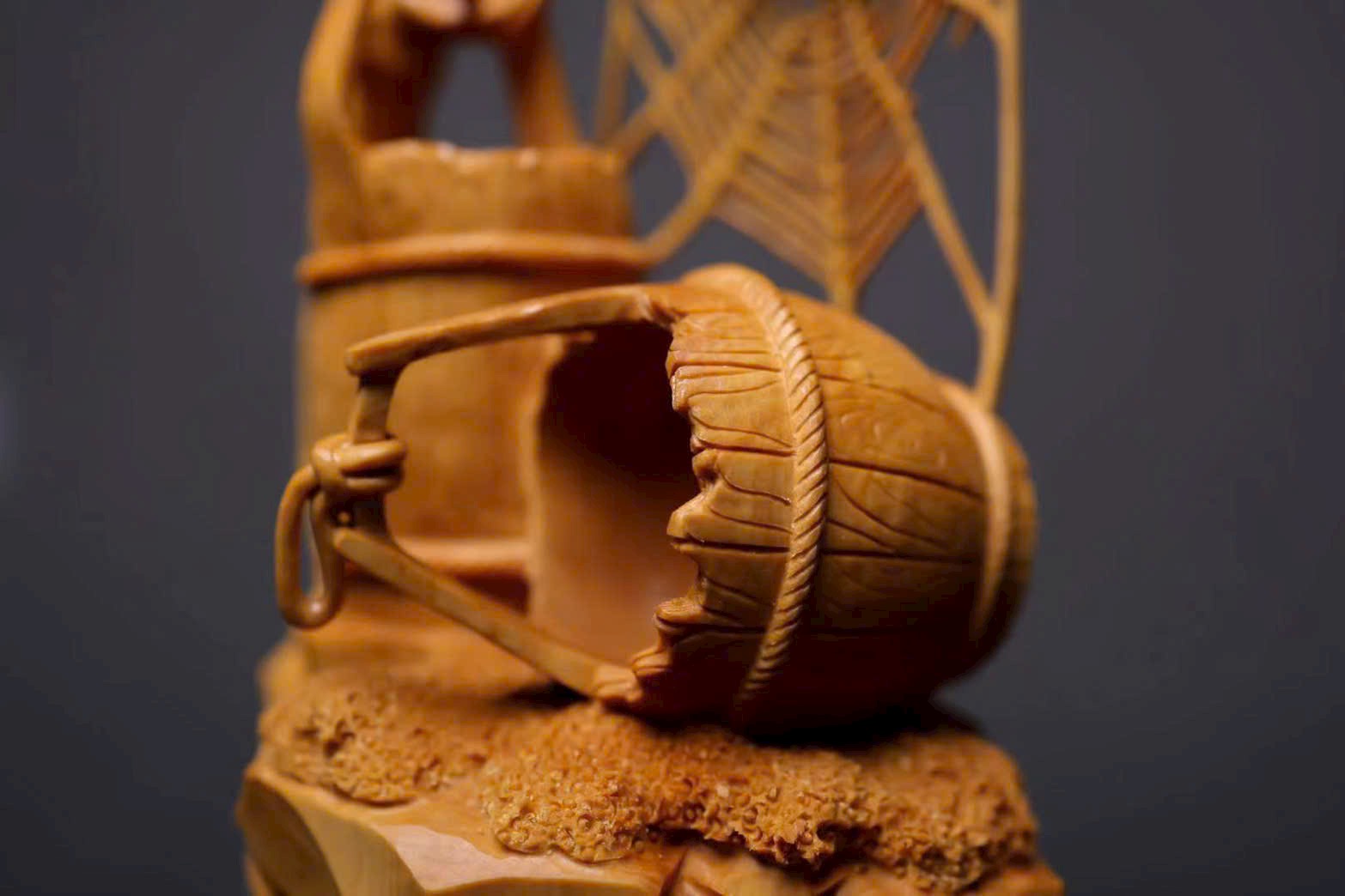 Mạng nhện đan xen rõ nét, kết cấu vân gỗ như thùng gỗ sống động, giỏ trúc được khắc chạm tinh tế. Tất cả cùng tựa trên khối đá núi tầng tầng lớp lớp, hiểm trở tự nhiên. Tác phẩm khéo léo dung hòa giữa vật dụng đời thường và yếu tố thiên nhiên, khắc họa nên bức tranh mộc mạc mà đầy tinh ý — là sự diễn giải sinh động của nghệ thuật điêu khắc gỗ truyền thống về triết lý nhân sinh và ý nghĩa cát tường.