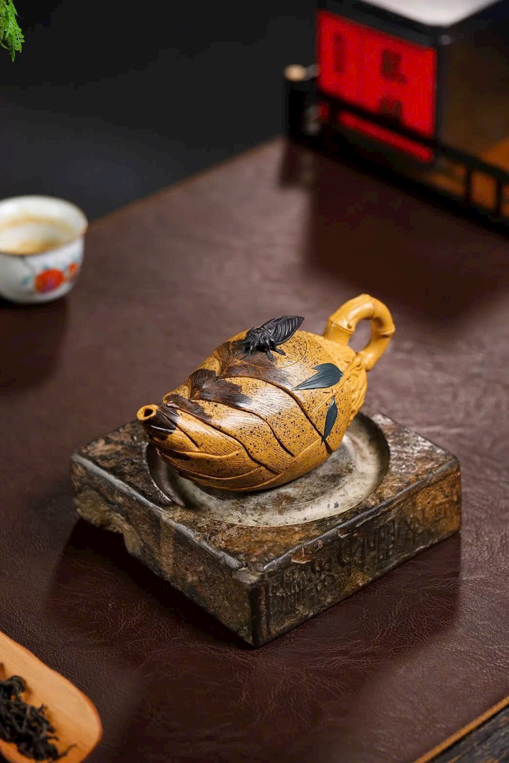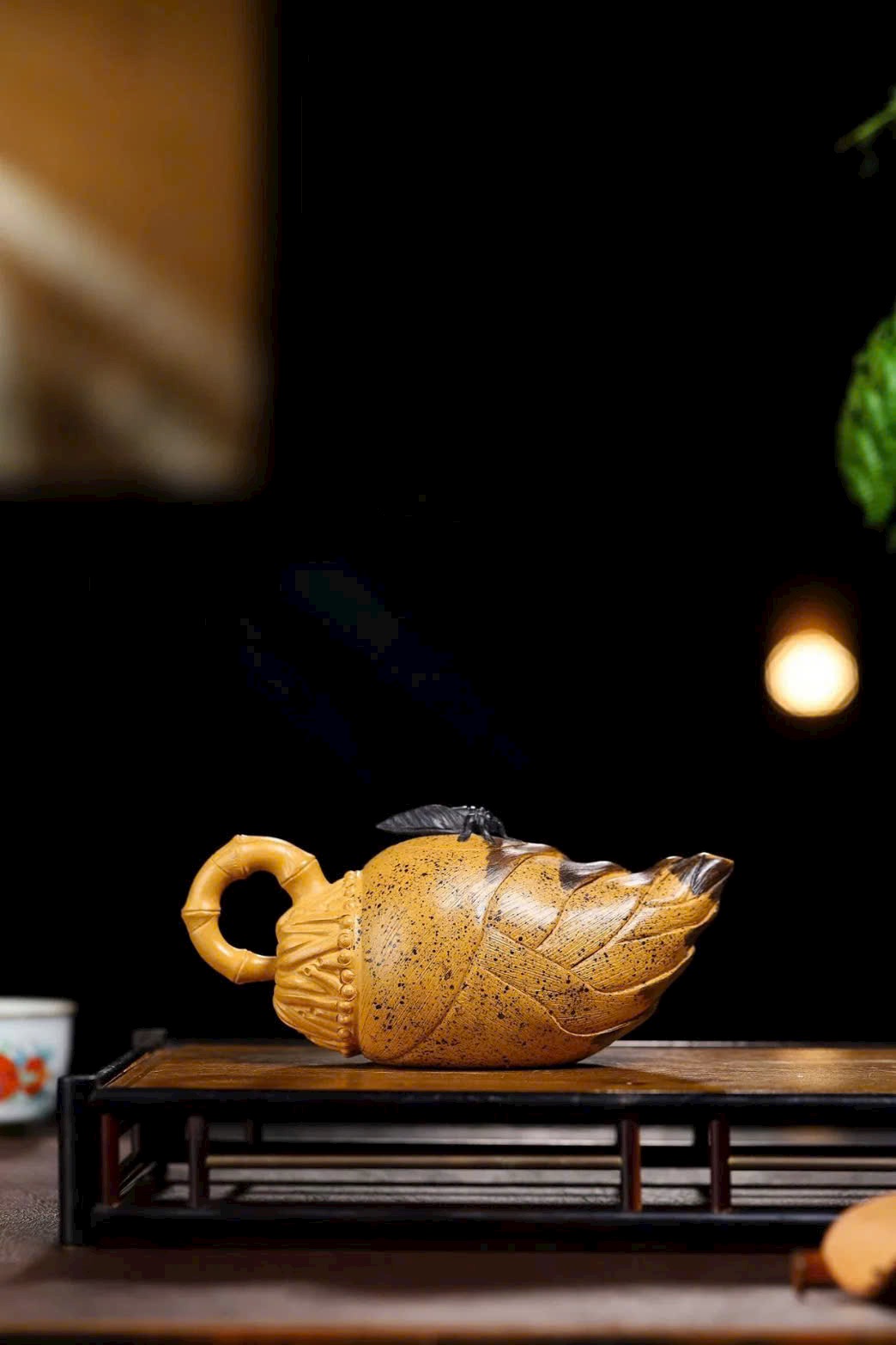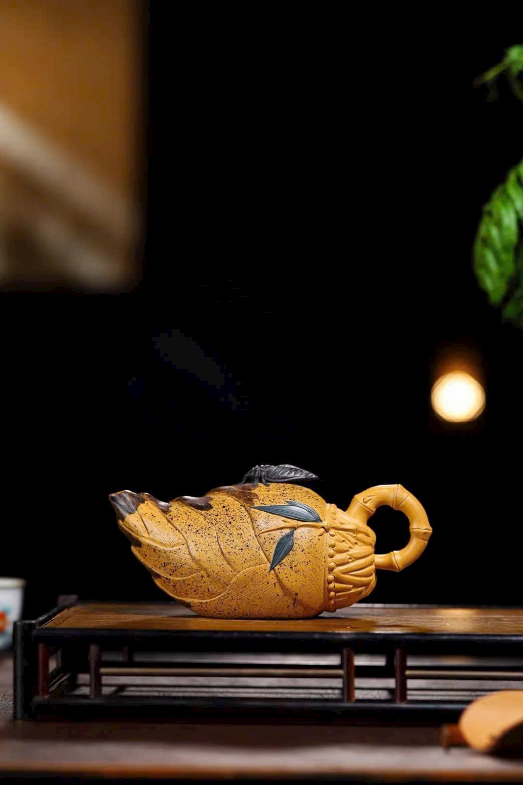 Chiếc ấm lấy hình tượng tre và ve sầu làm yếu tố chủ đạo, mang ý nghĩa biết đủ – tri túc, tạo nên nét thú vị và cuốn hút.