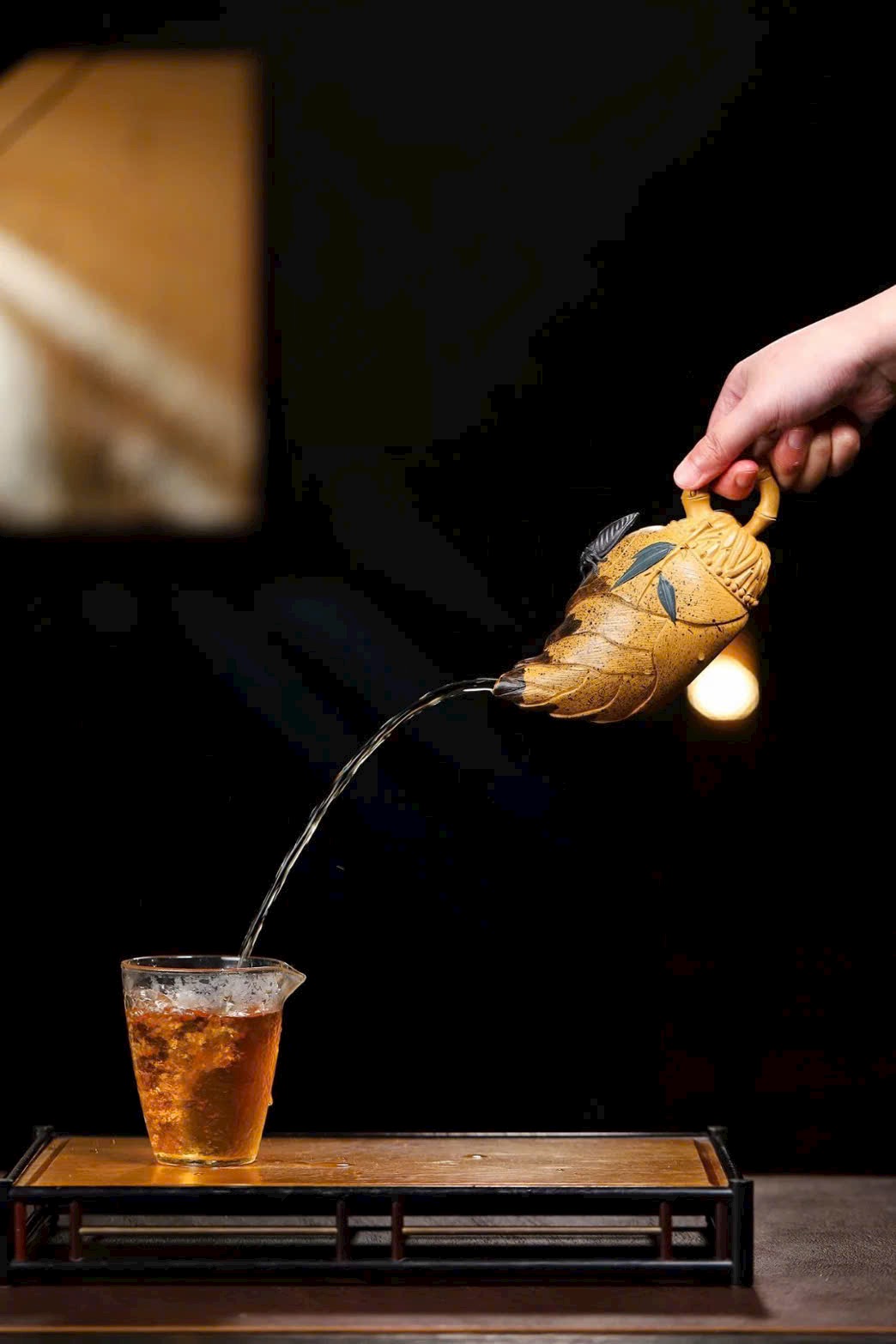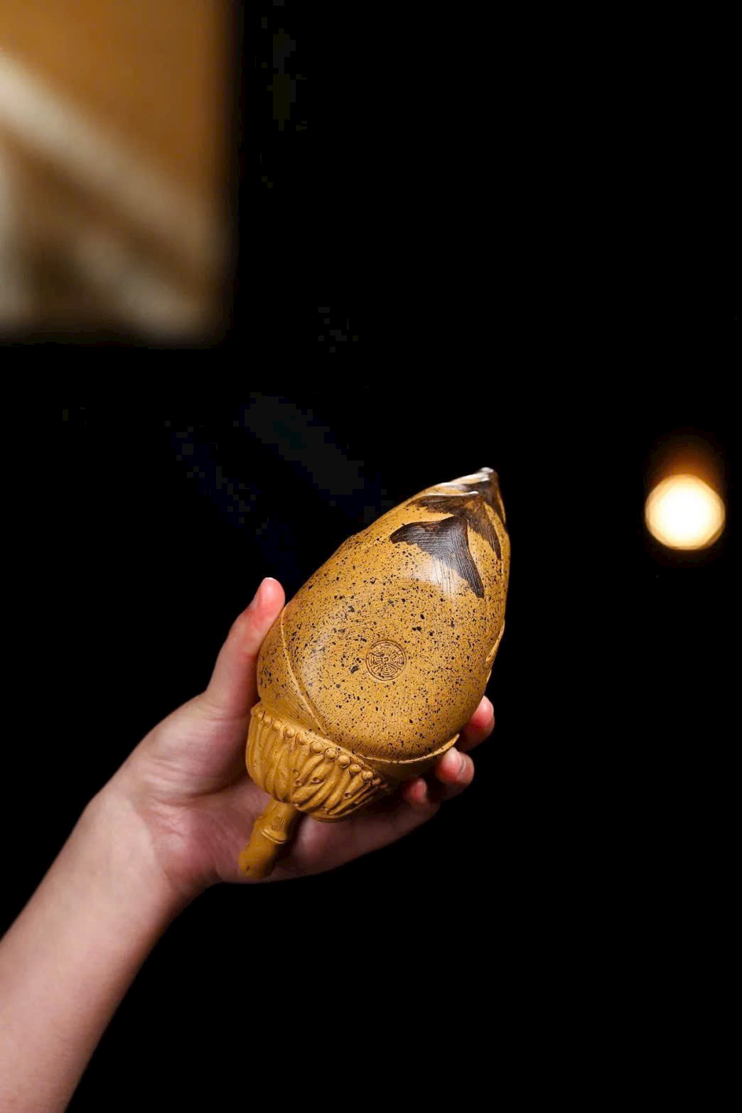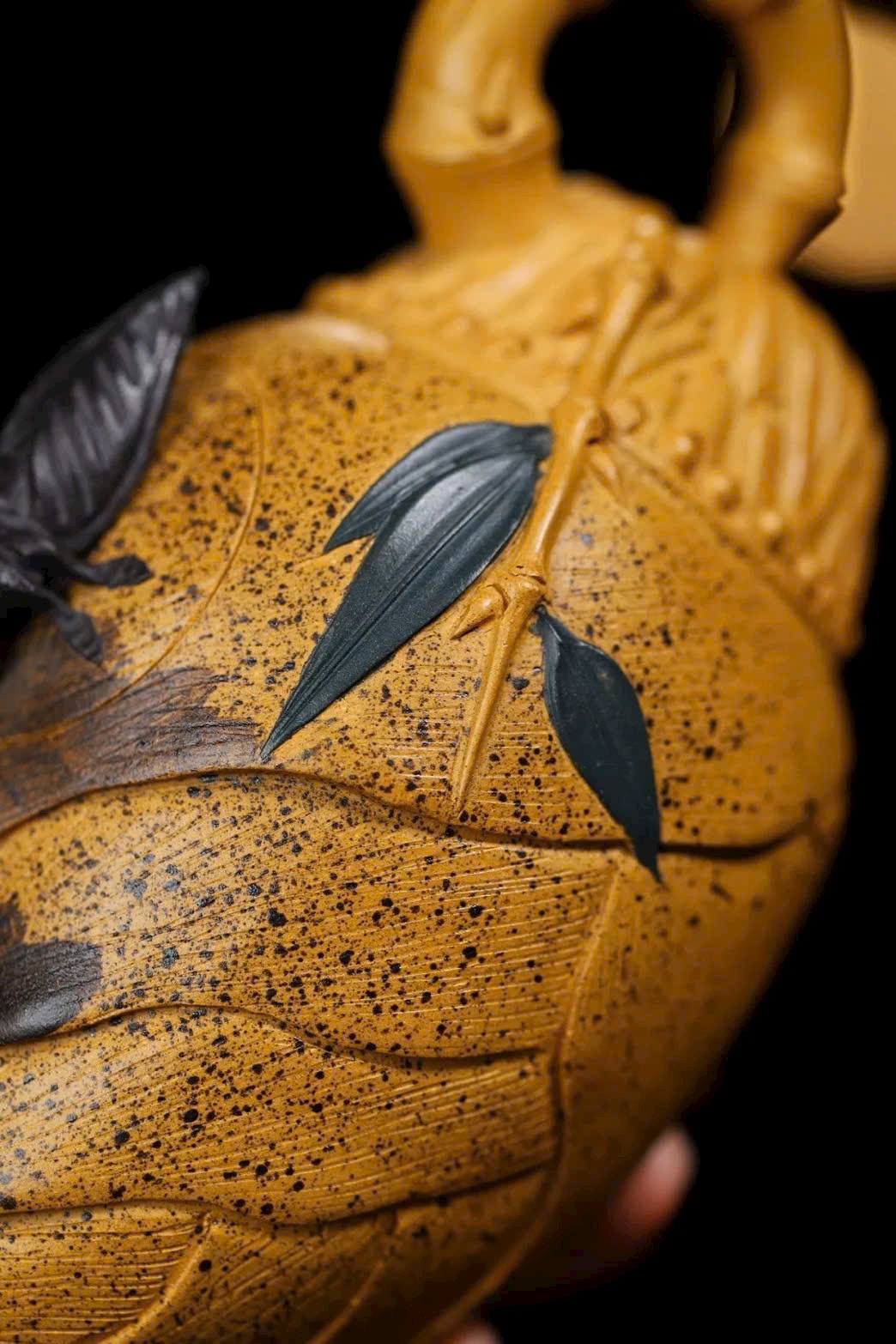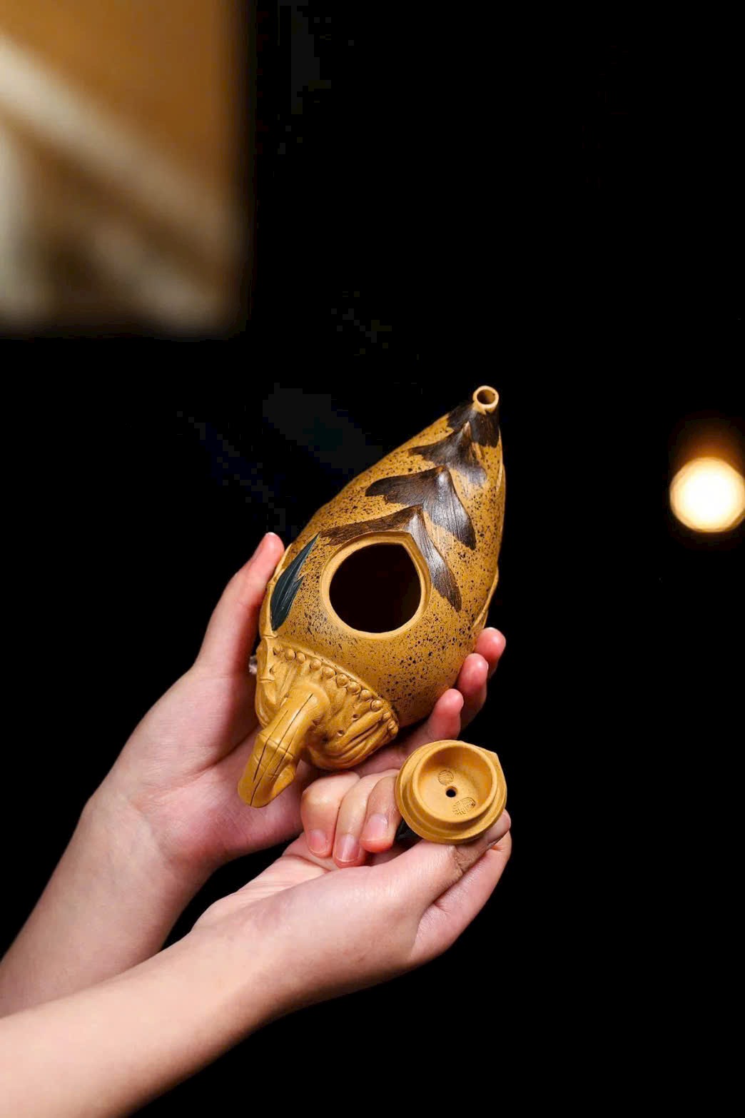 Toàn bộ thân ấm được tạo hình như một búp măng tre, kỹ thuật chế tác rất khó. Nắp ấm khớp chặt, đường vân tinh tế, tổng thể tạo hình chân thực, mang nhiều cảm hứng nghệ thuật.