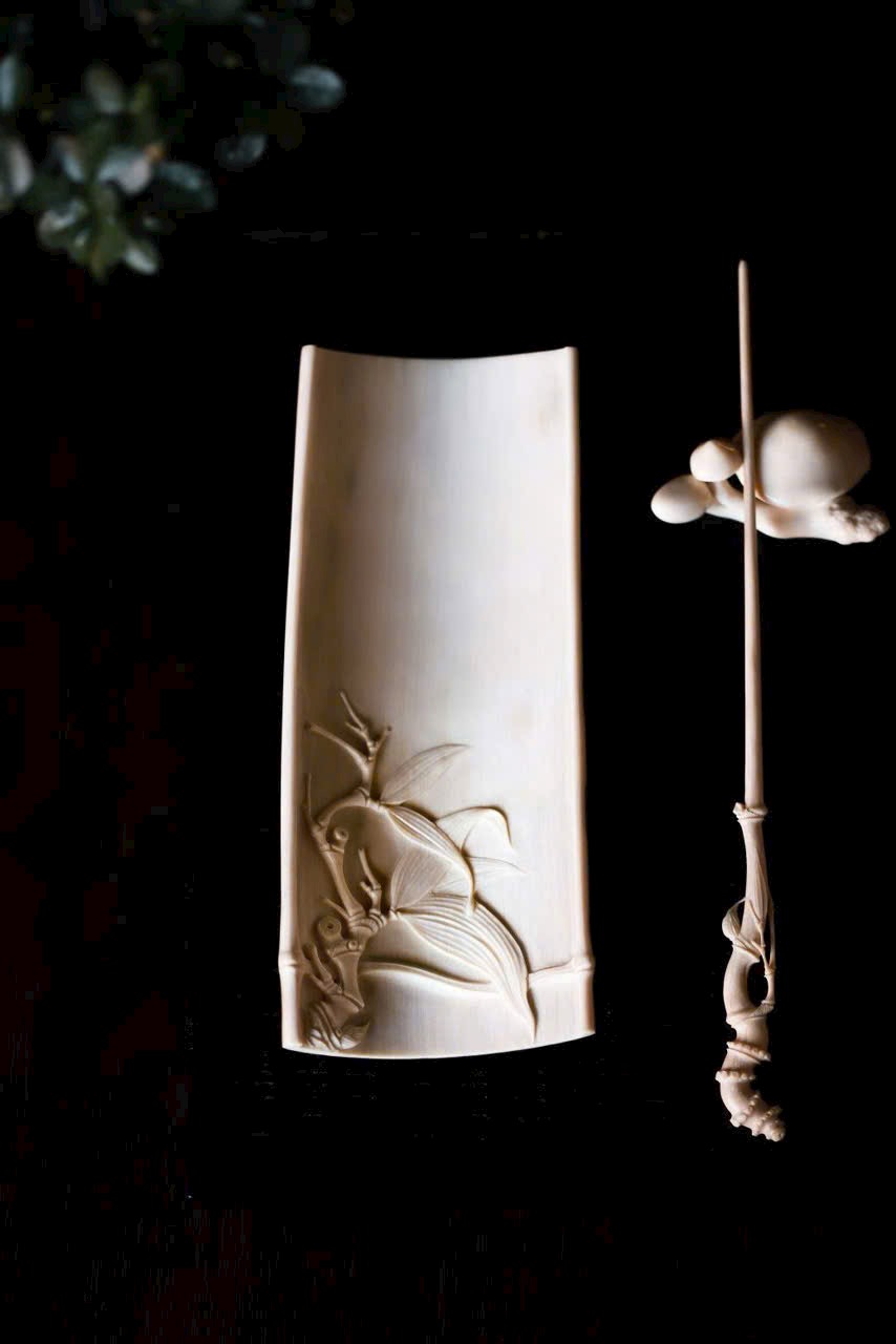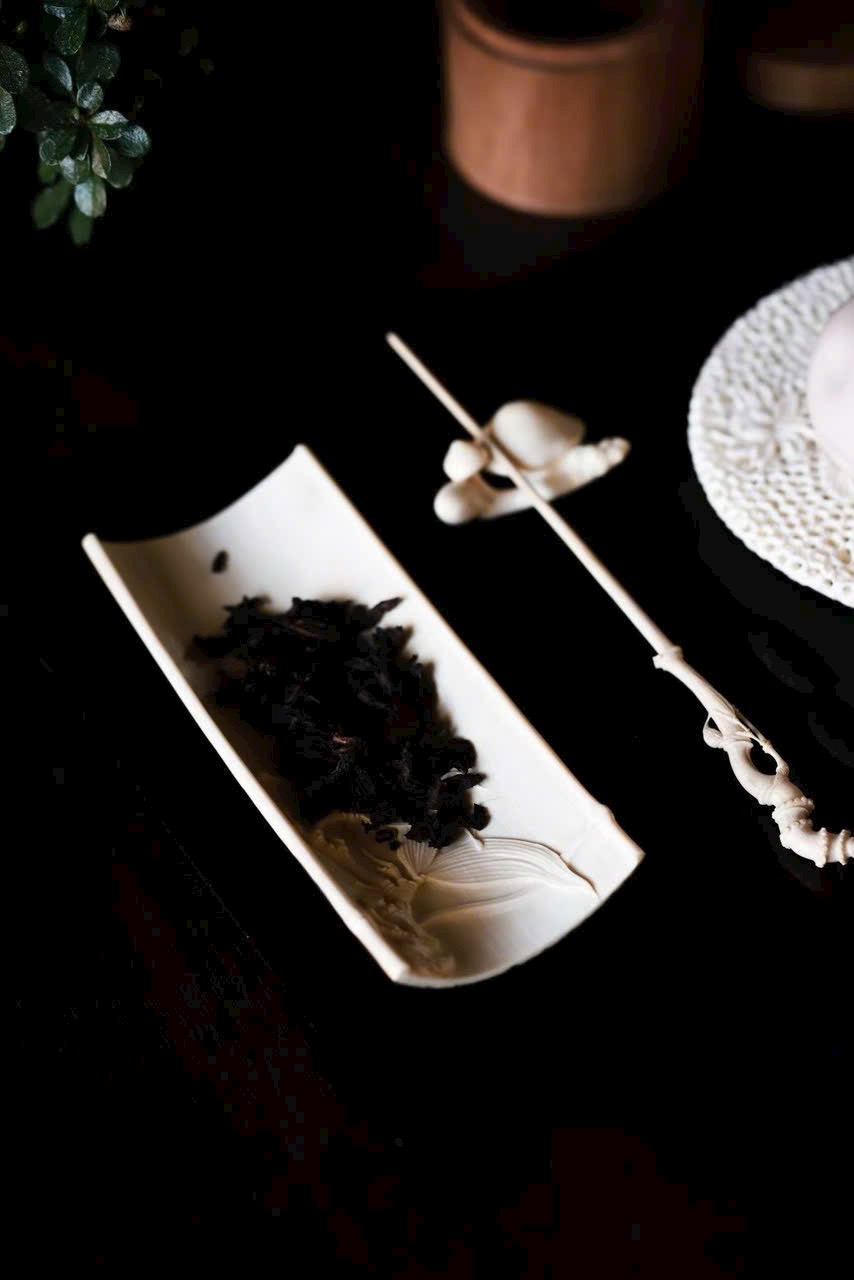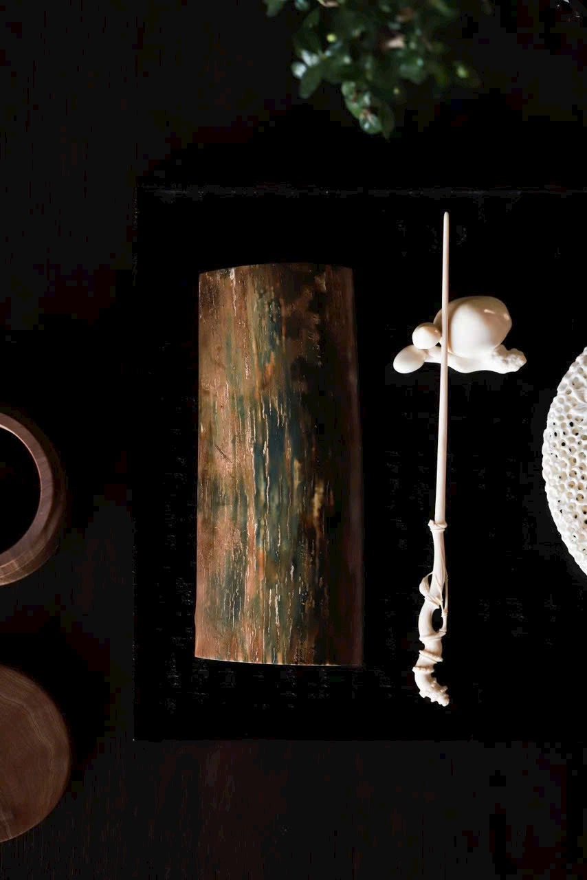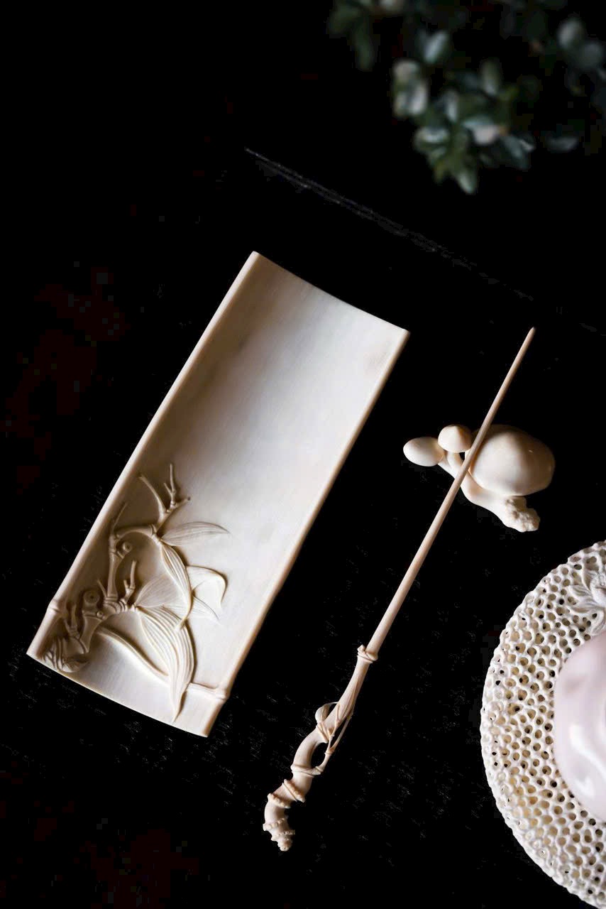 Phù điêu thân tre rỗng giữa các đốt, lá theo gió như nghe tiếng xào xạc, mặt sau giữ lớp vỏ xanh lam như trời sau mưa. Muỗng trà cong mềm theo dòng nước, dụng cụ khuấy trà nhẹ nhàng phá sóng mây, thêm nét thanh tịnh, thiền vị cho bàn trà.