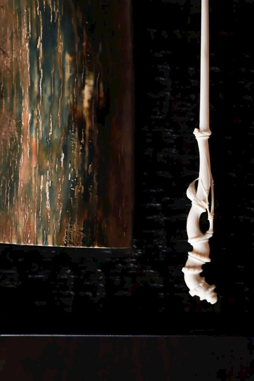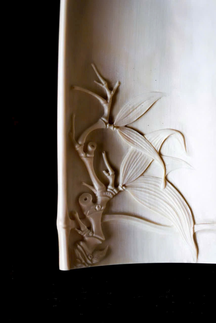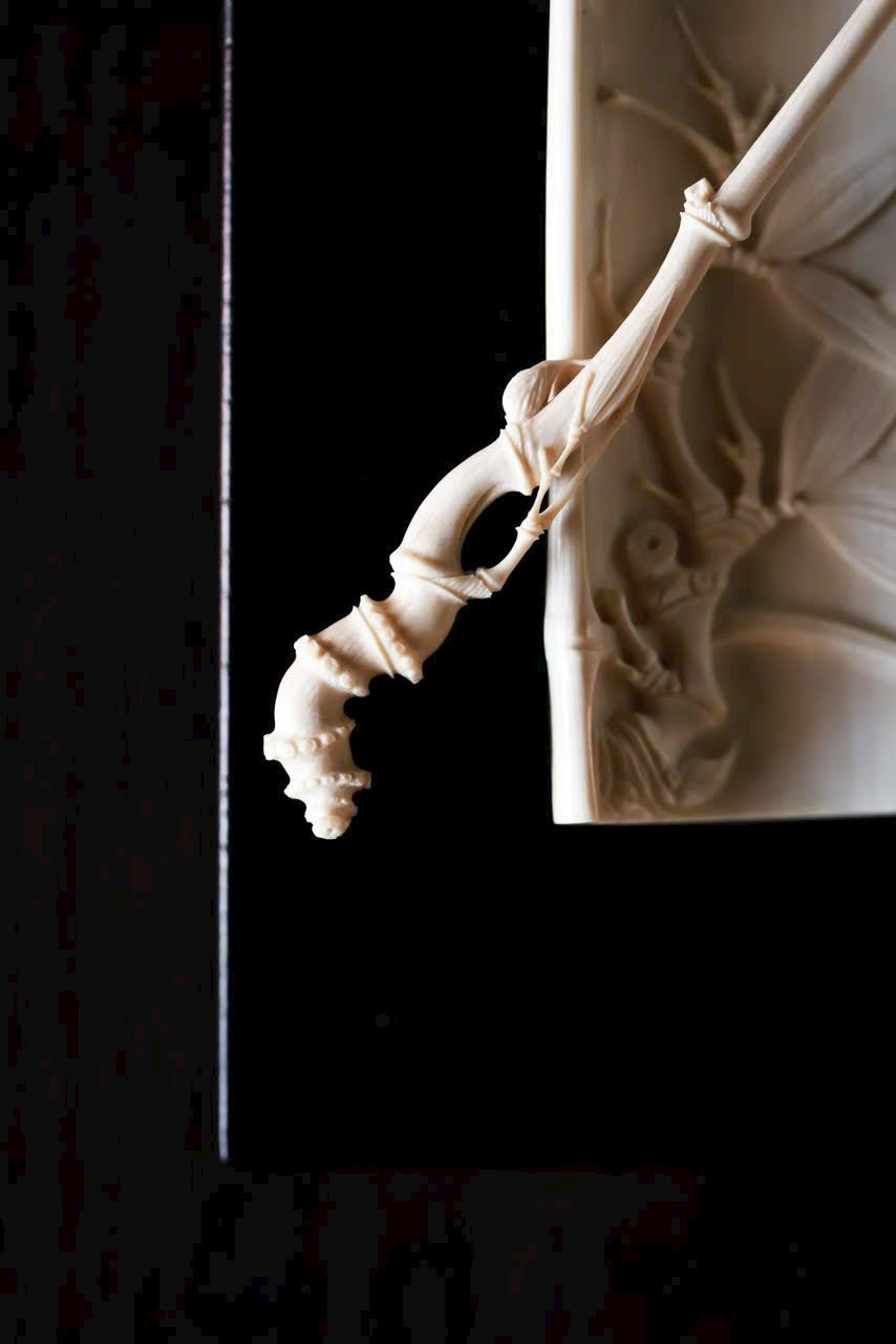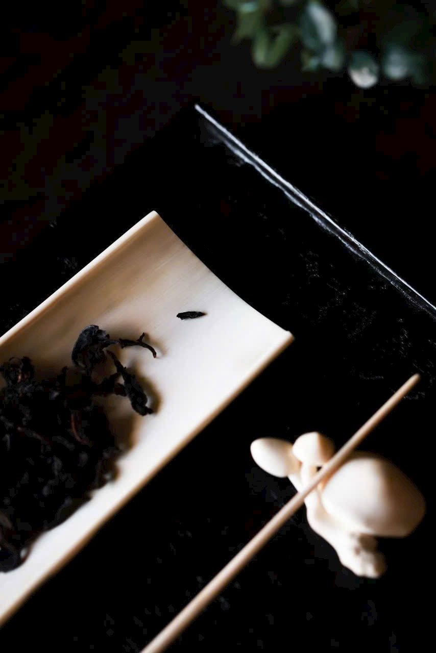 Phù điêu thân tre rỗng giữa các đốt, lá theo gió như nghe tiếng xào xạc, mặt sau giữ lớp vỏ xanh lam như trời sau mưa. Muỗng trà cong mềm theo dòng nước, dụng cụ khuấy trà nhẹ nhàng phá sóng mây, thêm nét thanh tịnh, thiền vị cho bàn trà.