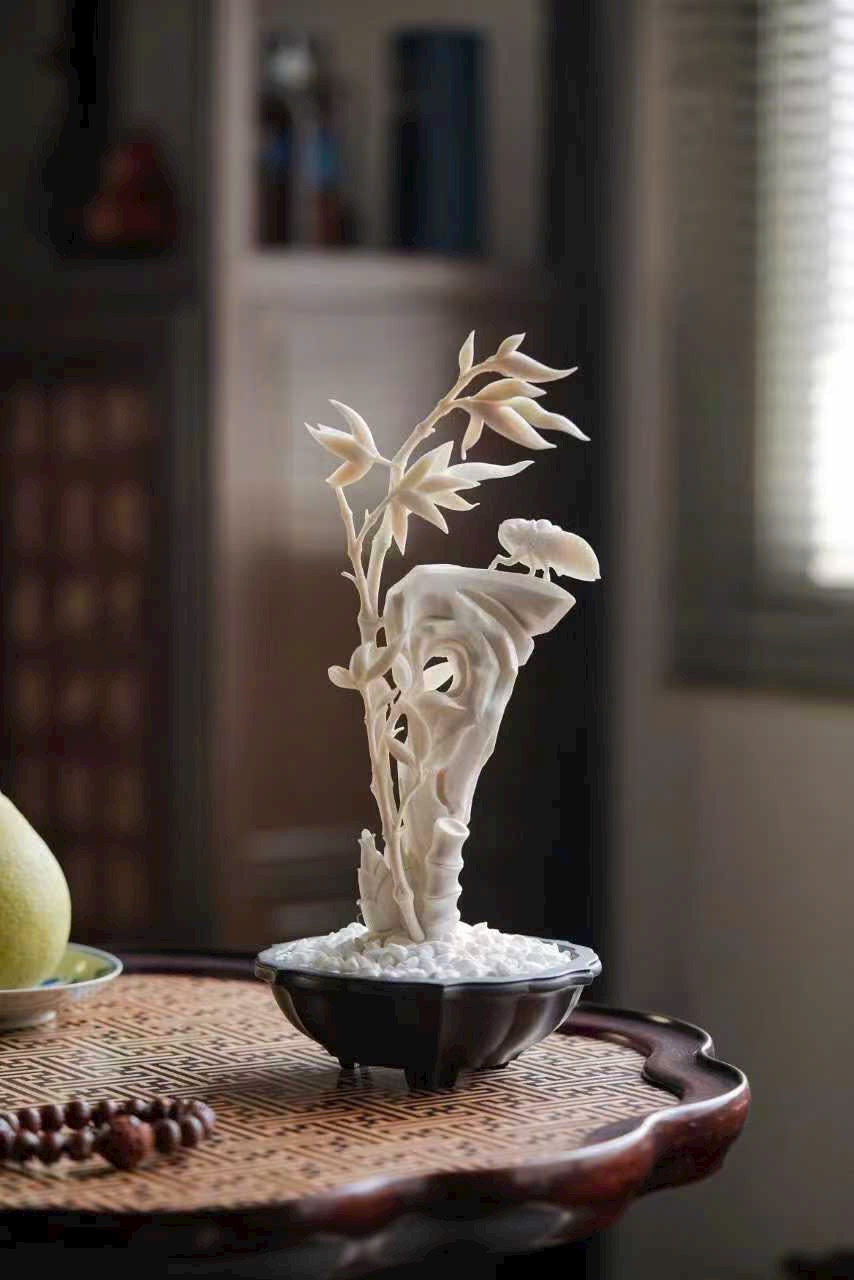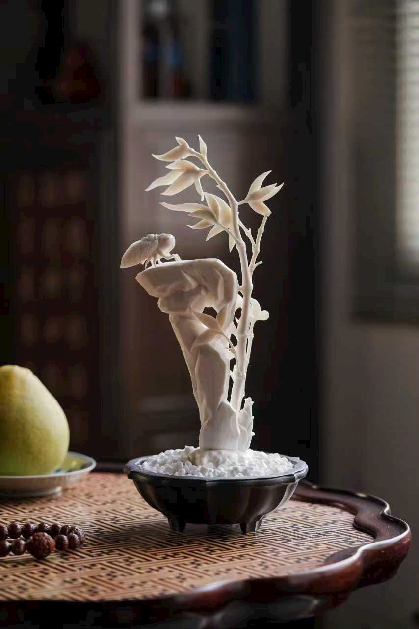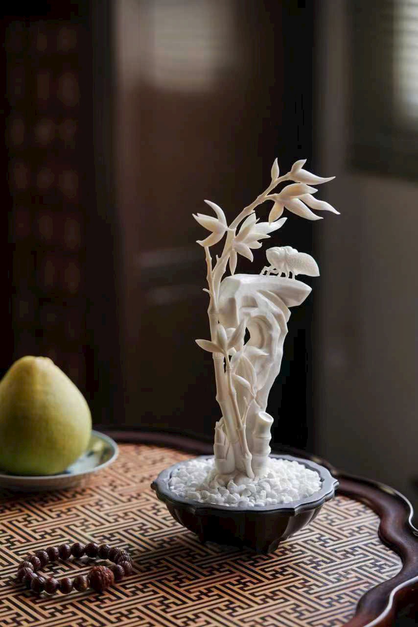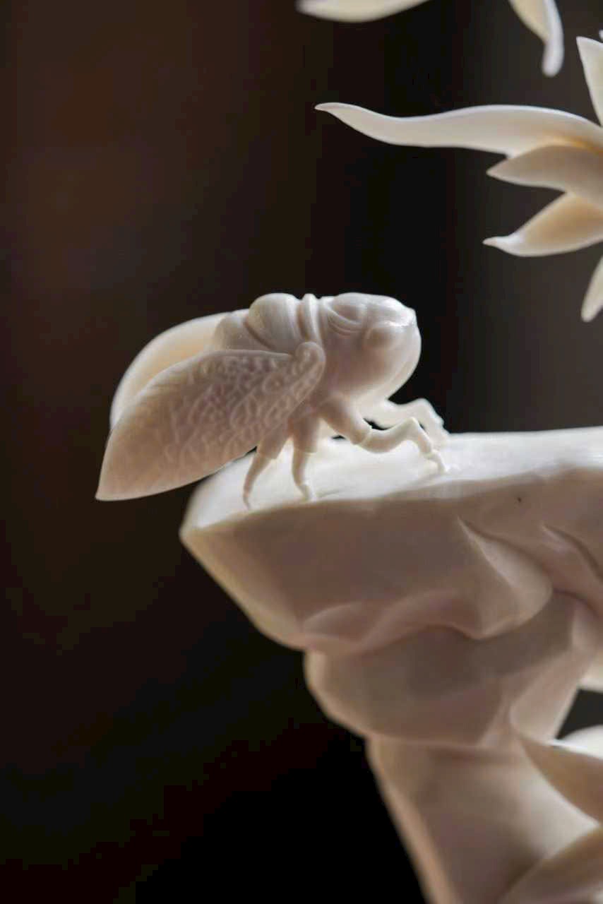 Nghệ nhân khéo chạm hình đốt trúc nghiêng soi bóng, con ve mùa thu khép cánh đậu trên đá, đường gân cánh mảnh như tơ, ánh sáng xuyên qua tinh tế.