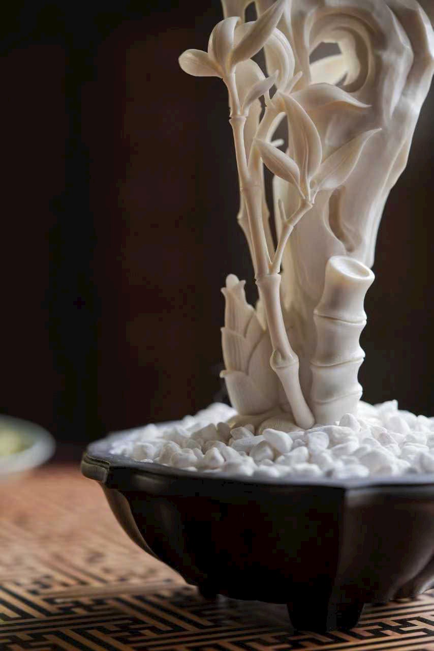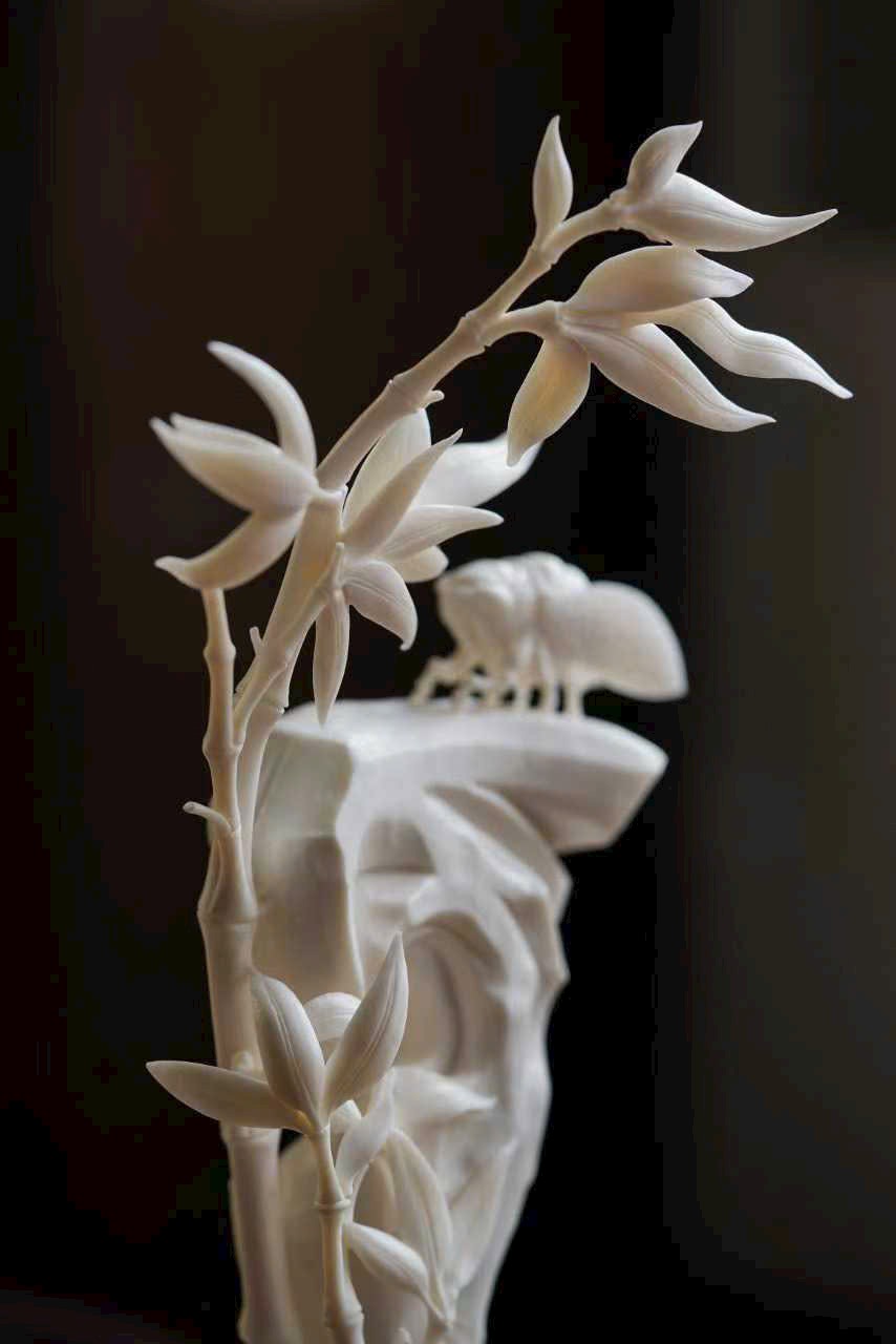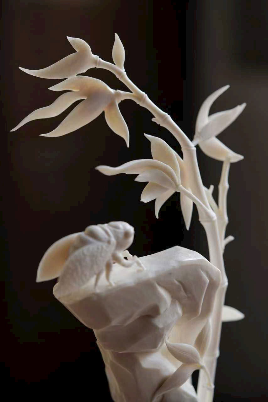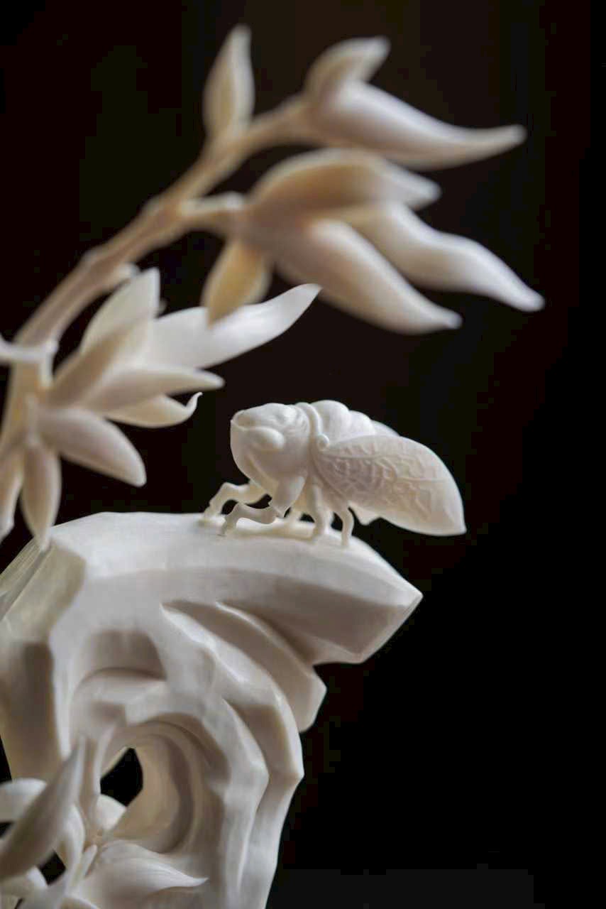 Nghệ nhân khéo chạm hình đốt trúc nghiêng soi bóng, con ve mùa thu khép cánh đậu trên đá, đường gân cánh mảnh như tơ, ánh sáng xuyên qua tinh tế.