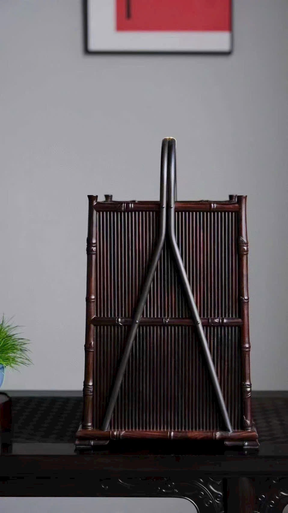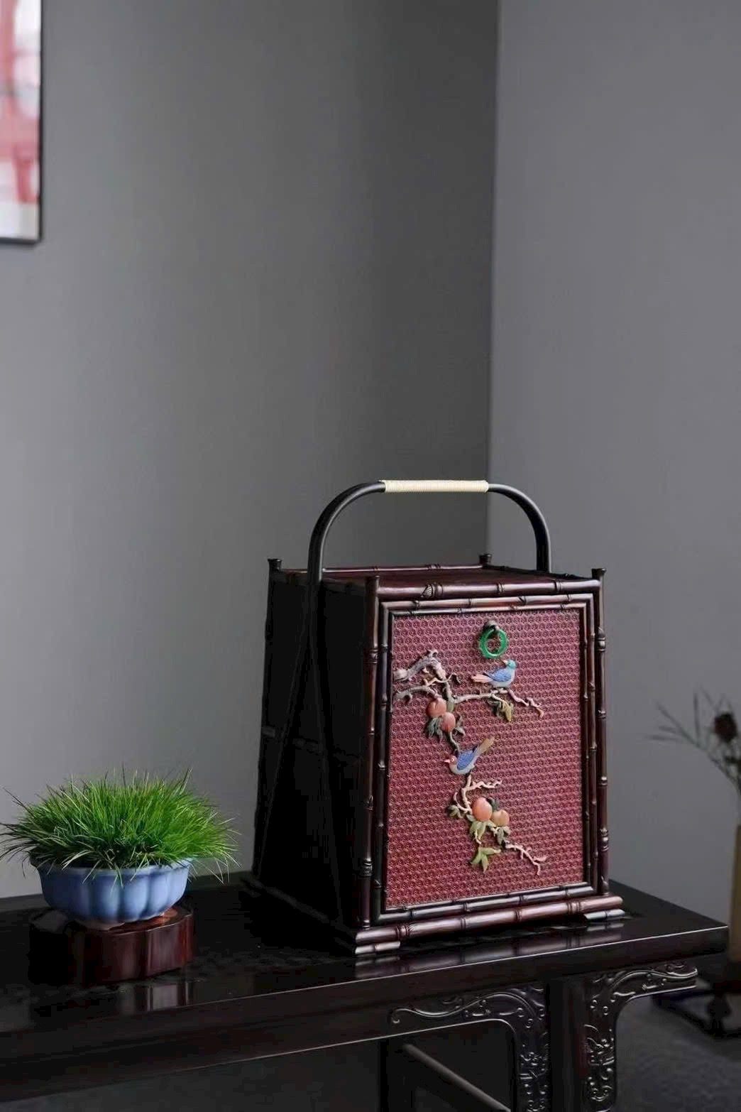 Phần trên được thiết kế tay xách bằng hai ống đồng cổ, giữa tay cầm được đan thủ công tinh tế, vừa đẹp mắt vừa tiện dụng.