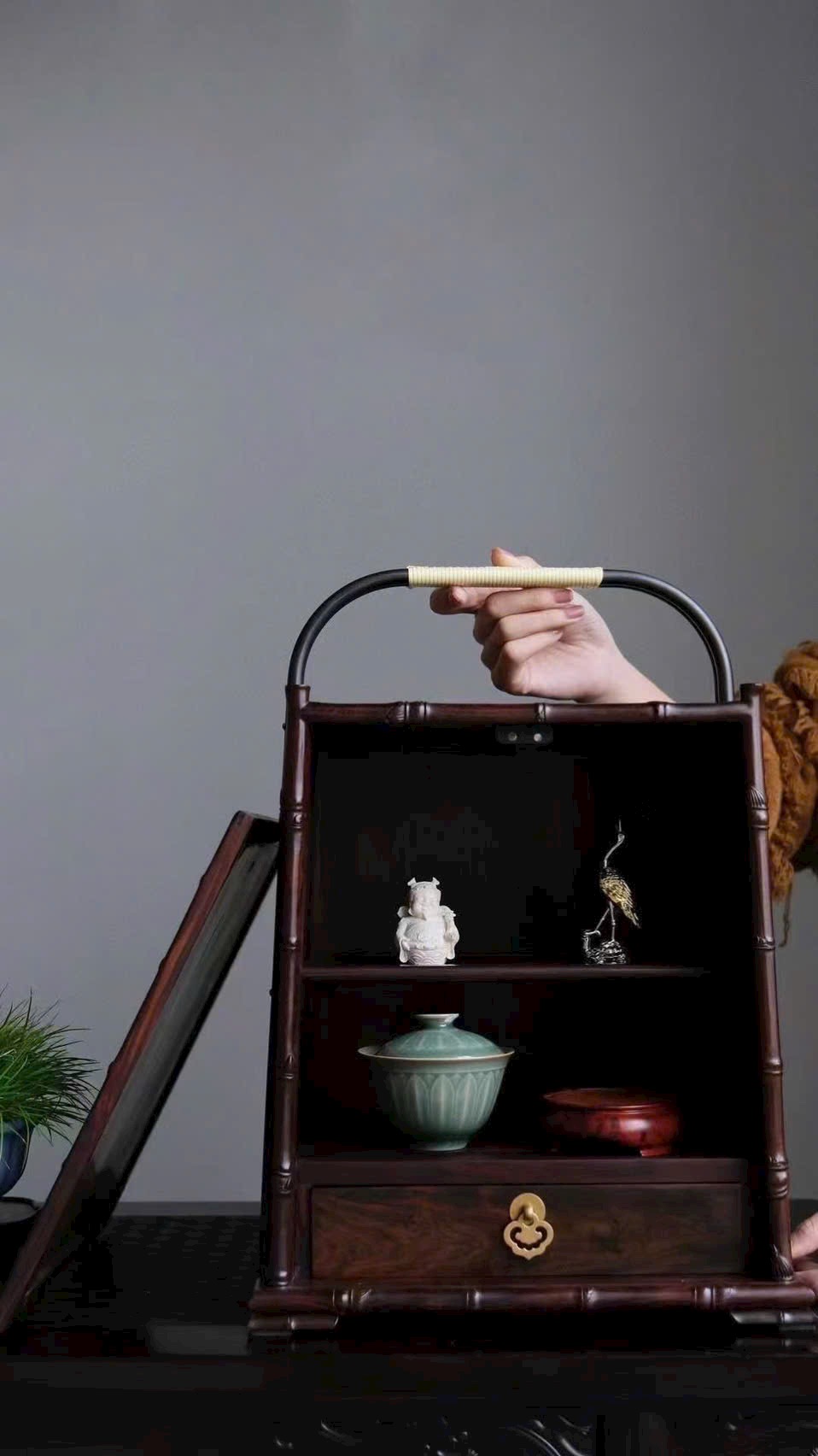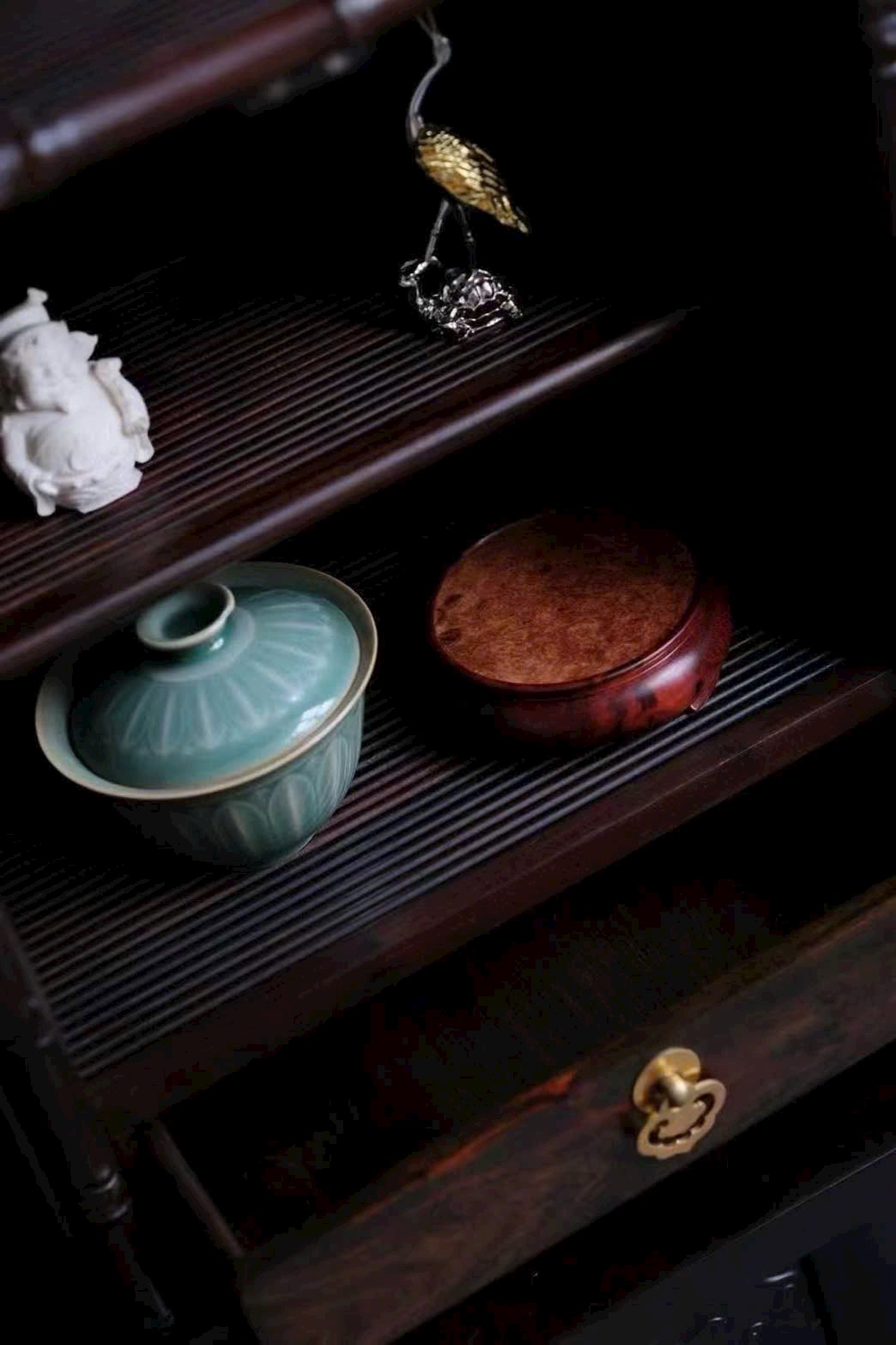 Tổng thể dáng tủ cân đối, hài hòa, đường nét uyển chuyển mà vững chãi, toát lên vẻ cổ nhã và phong vị lâu bền của trà đạo truyền thống.